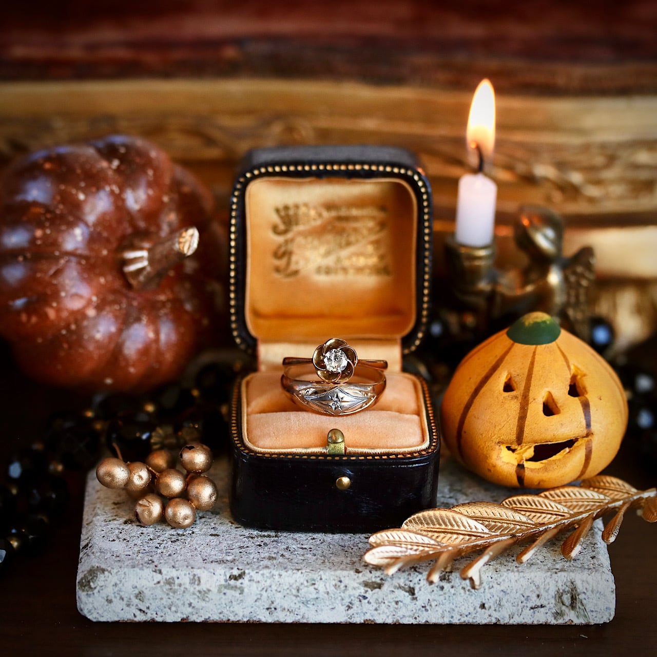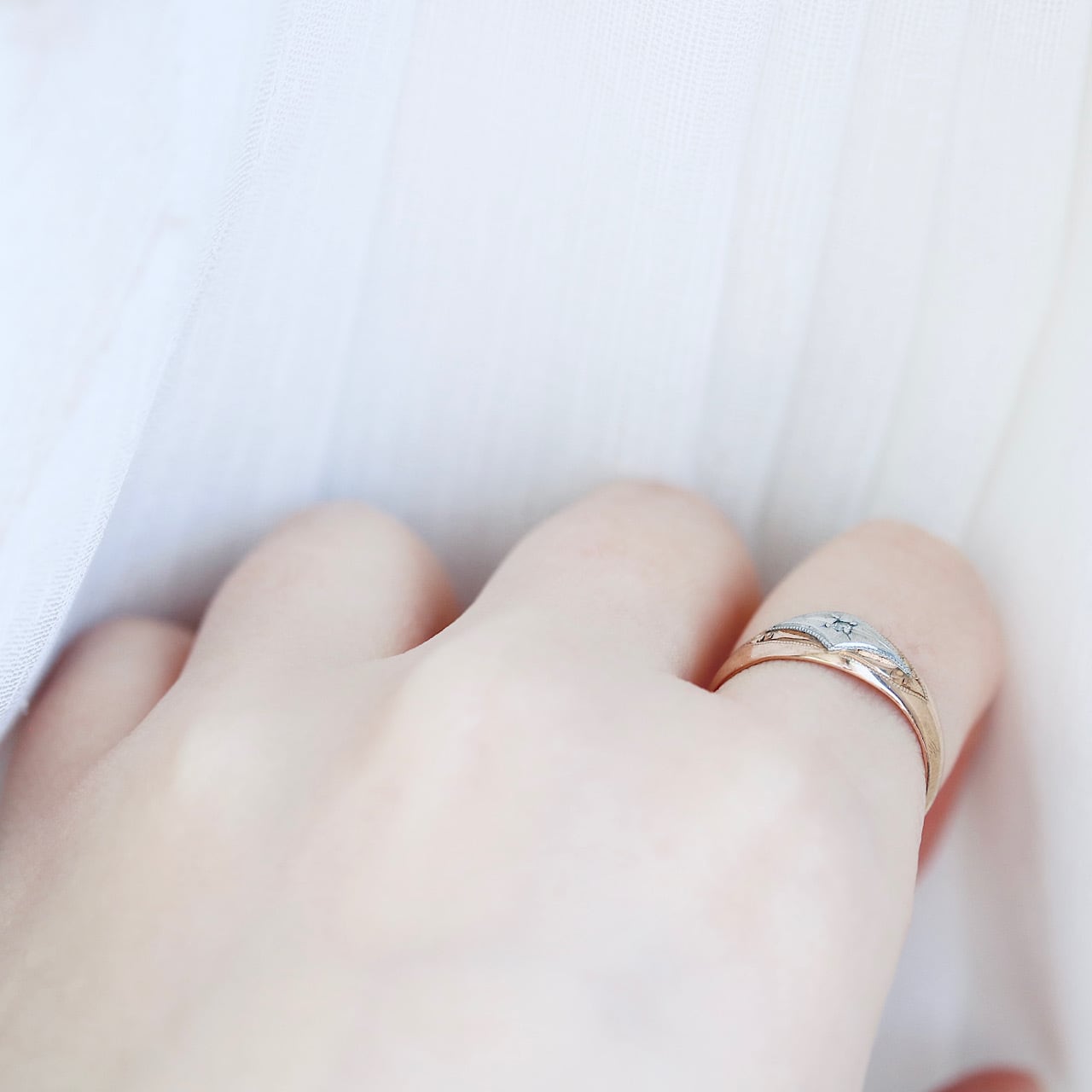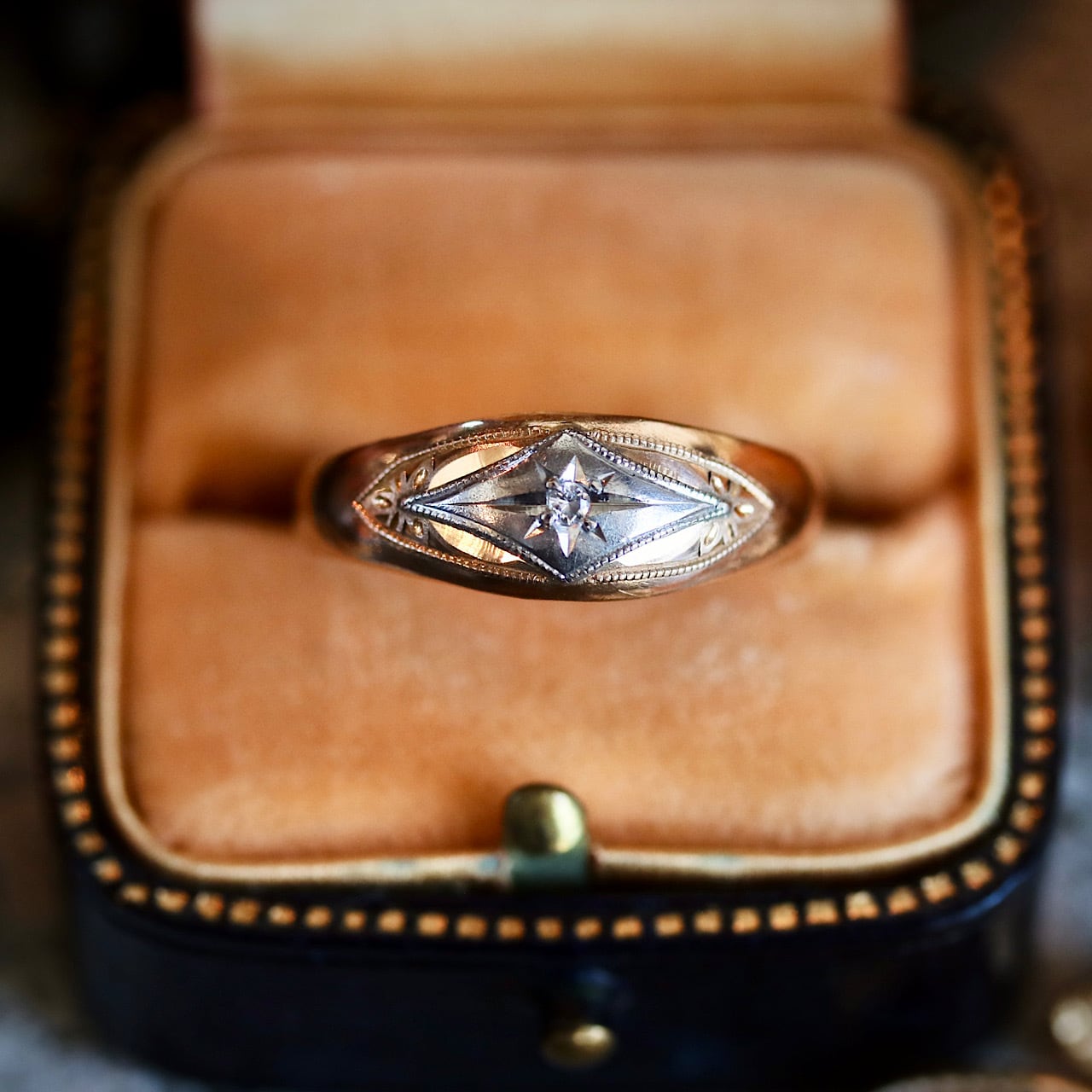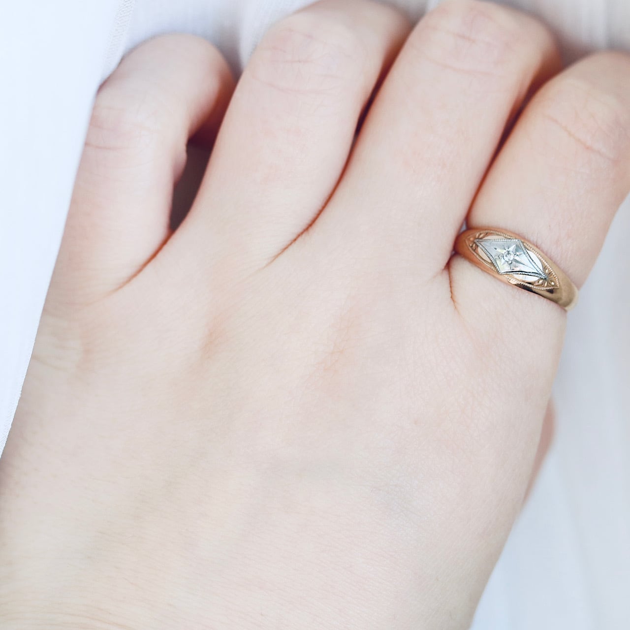中心に星留めの小さな一粒ダイヤモンドがセッティングされたヴィンテージリング。