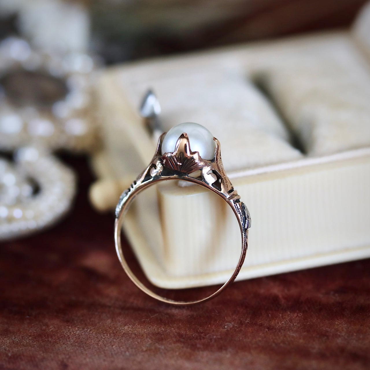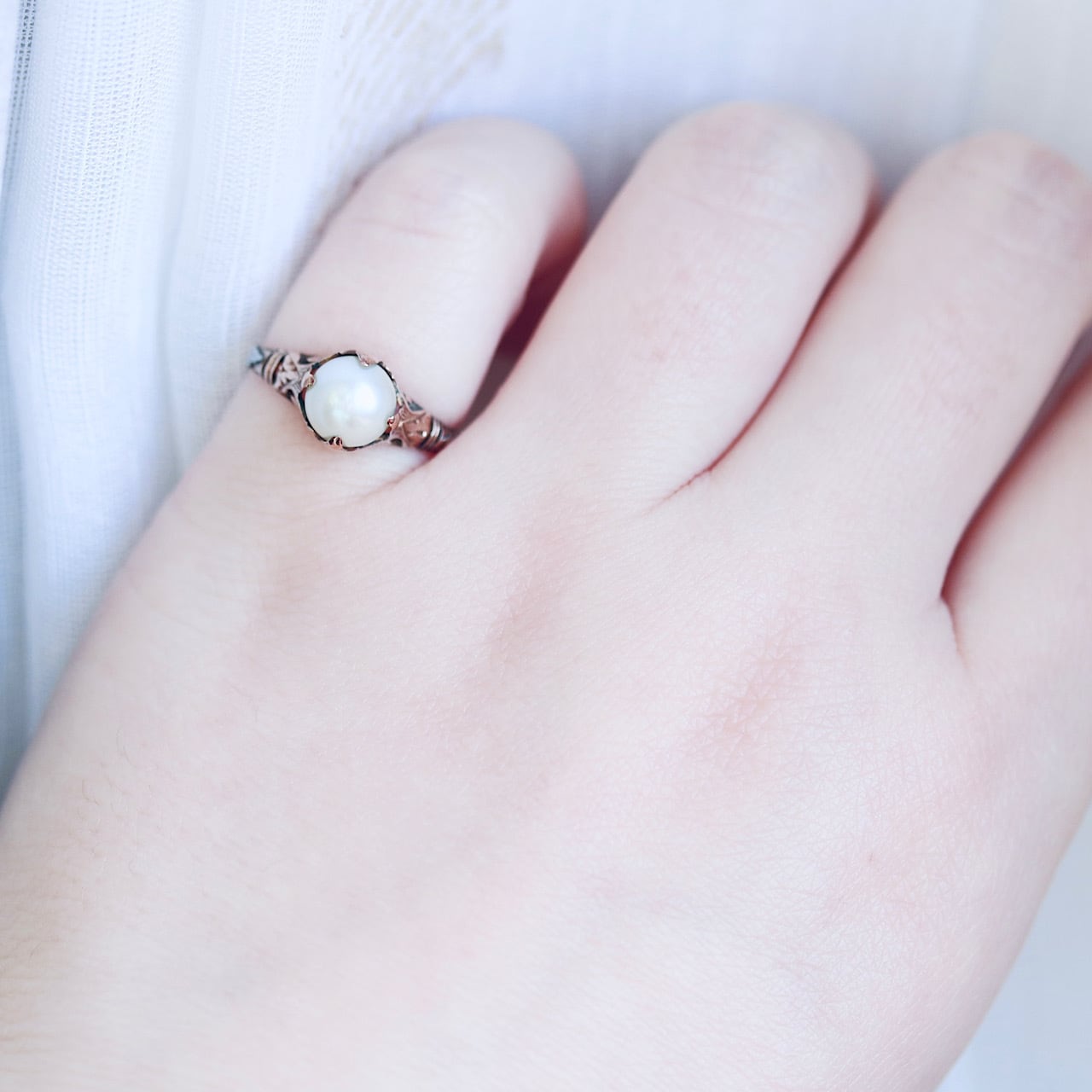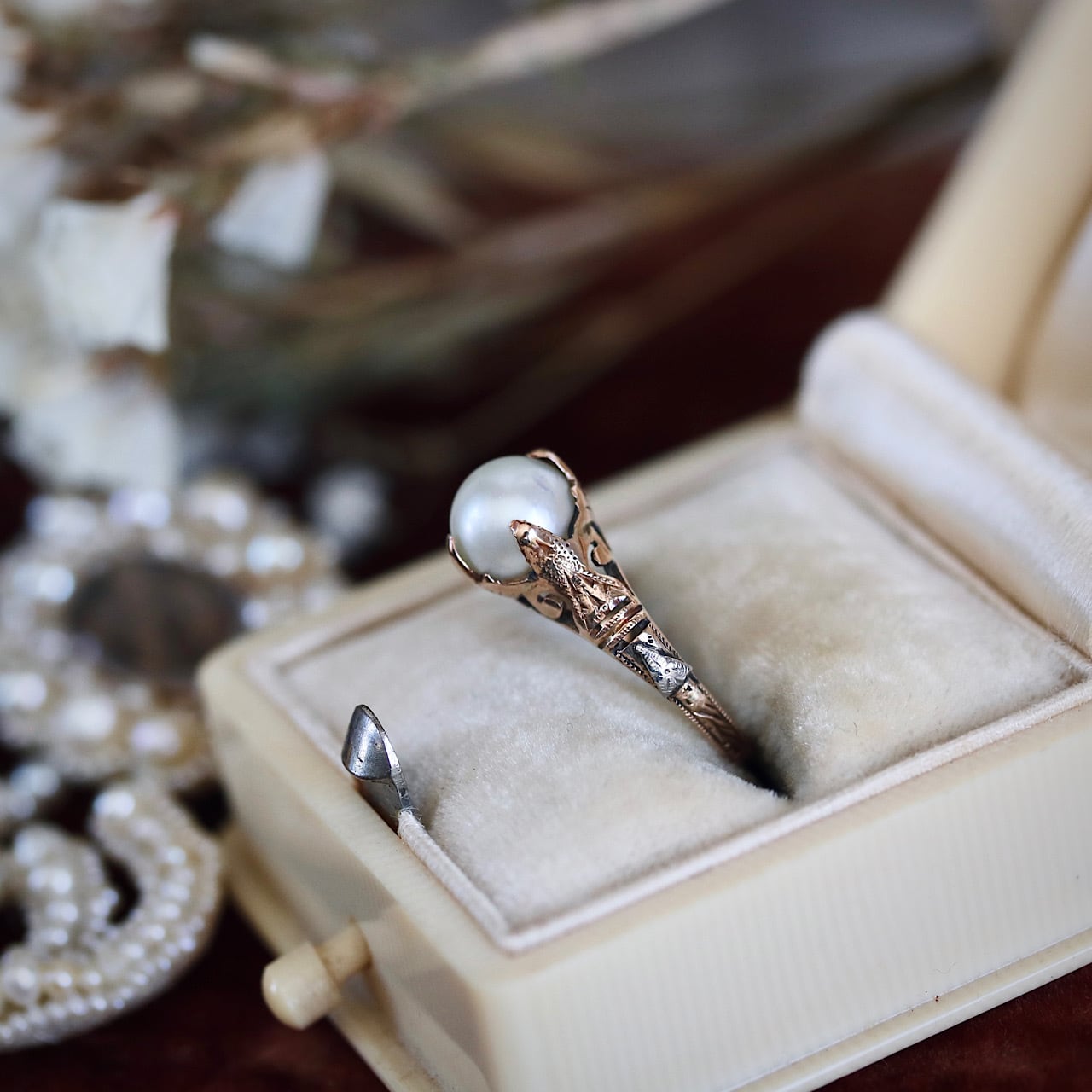 一粒のあこや真珠があしらわれた美しい装飾が施されたヴィンテージリング。