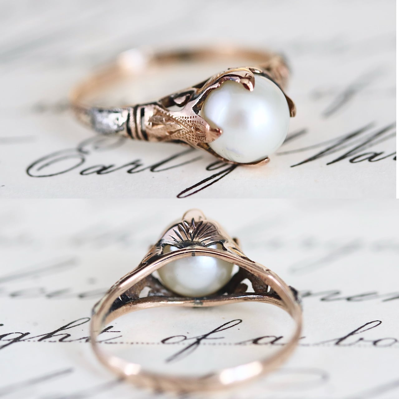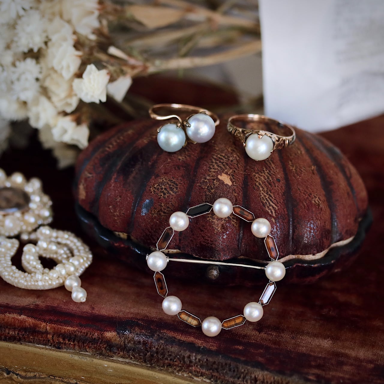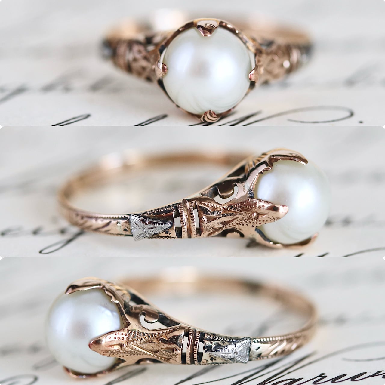 一粒のあこや真珠があしらわれた美しい装飾が施されたヴィンテージリング。
