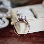 真珠に固定のための芯は刺さっておらず爪のみで留められた形状ですが、丸い真珠を爪のみでセッティングする事は難しく、ヴィンテージリングならではのセッティング法といえます。
