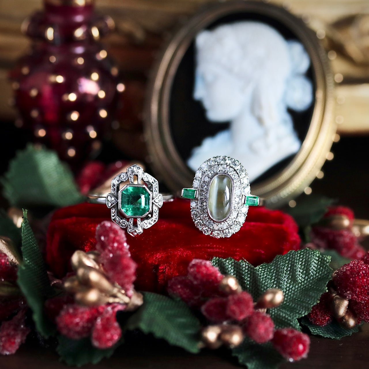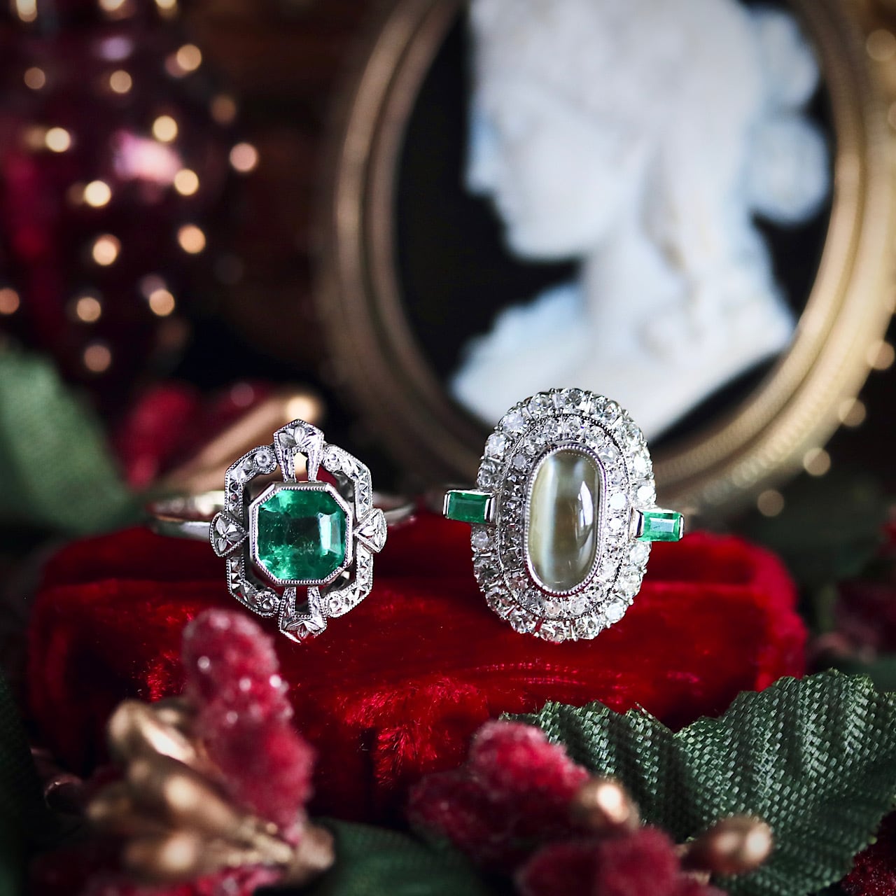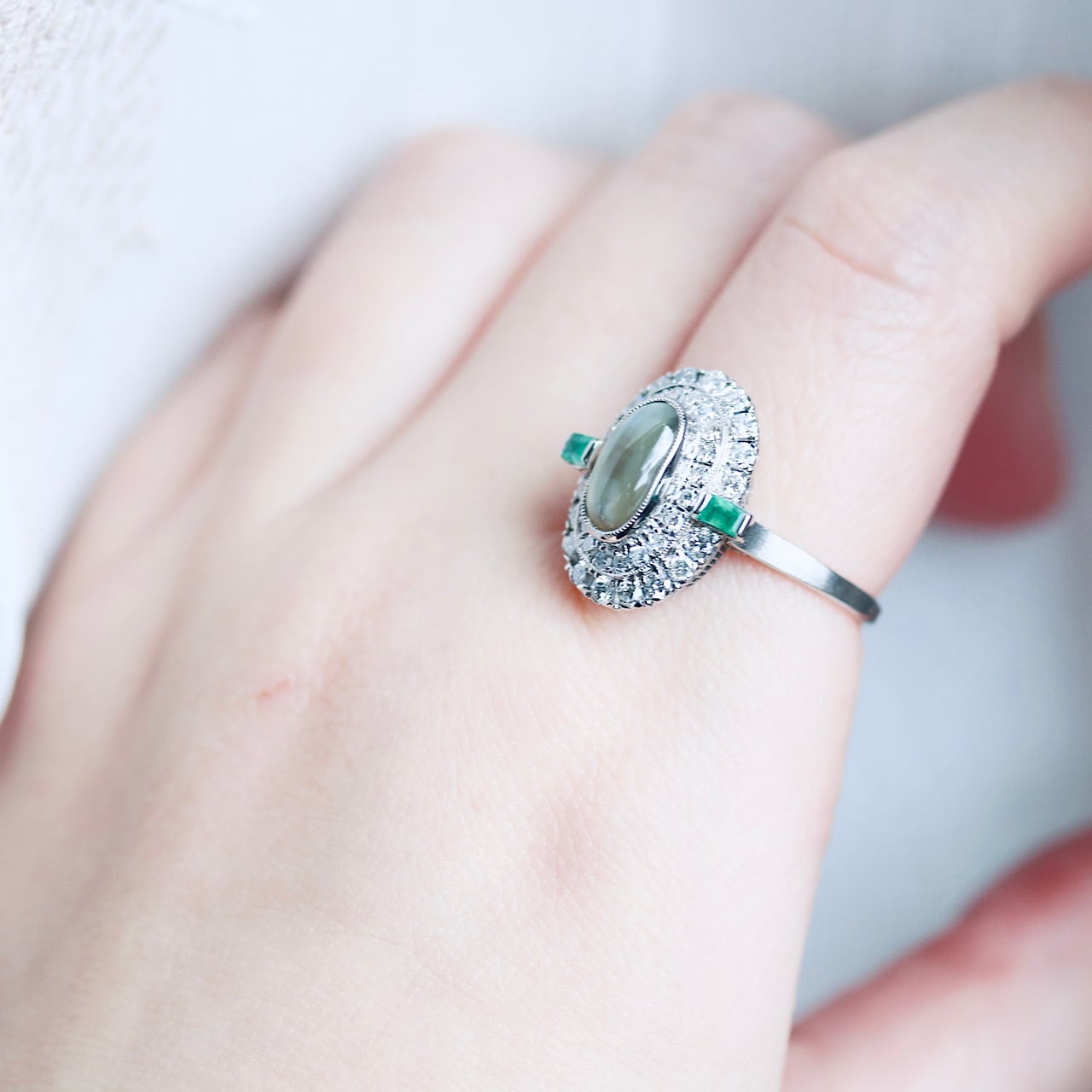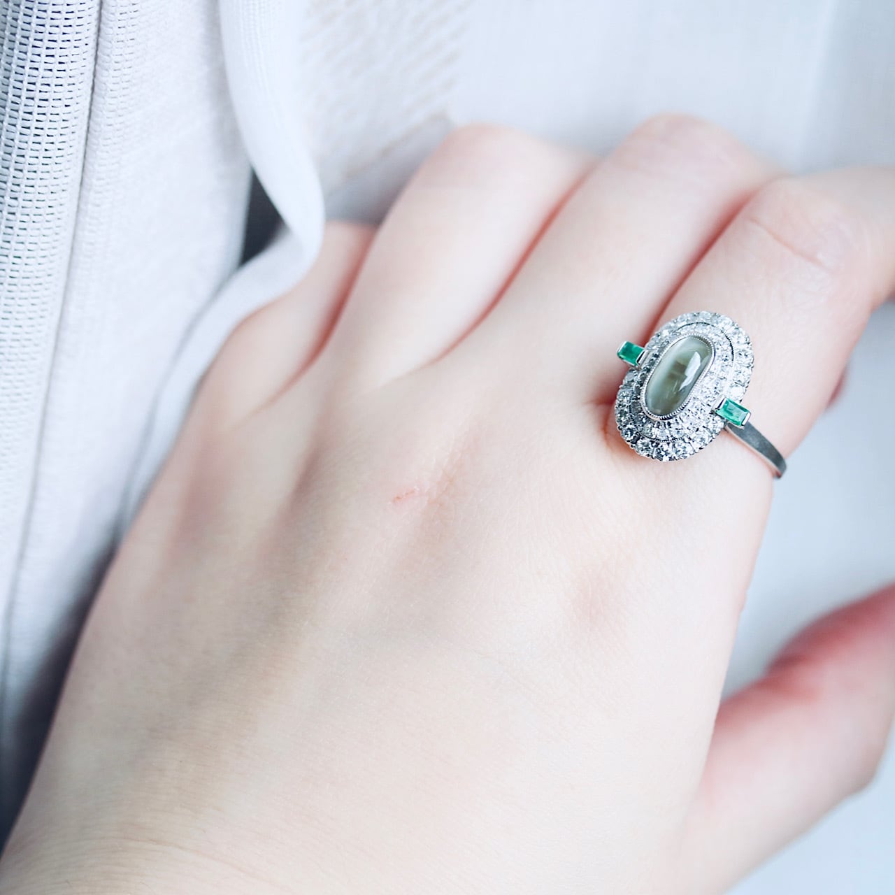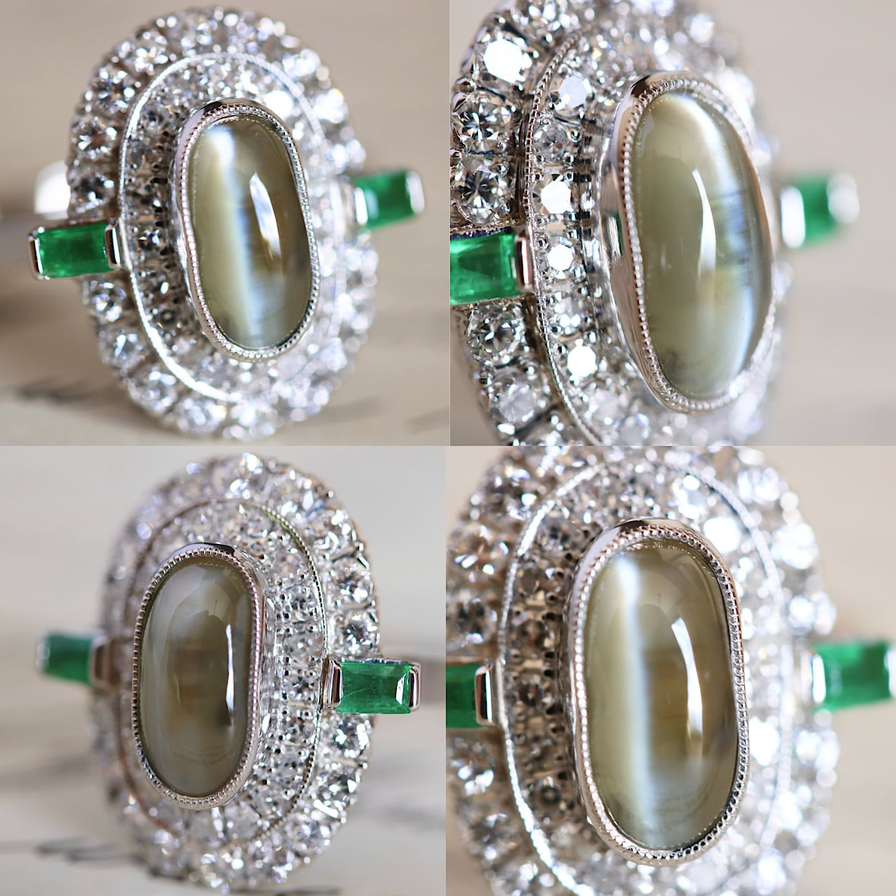 クリソベリルキャッツアイにエメラルドが添えられた珍しい組み合わせのダイヤモンド取り巻きリング。