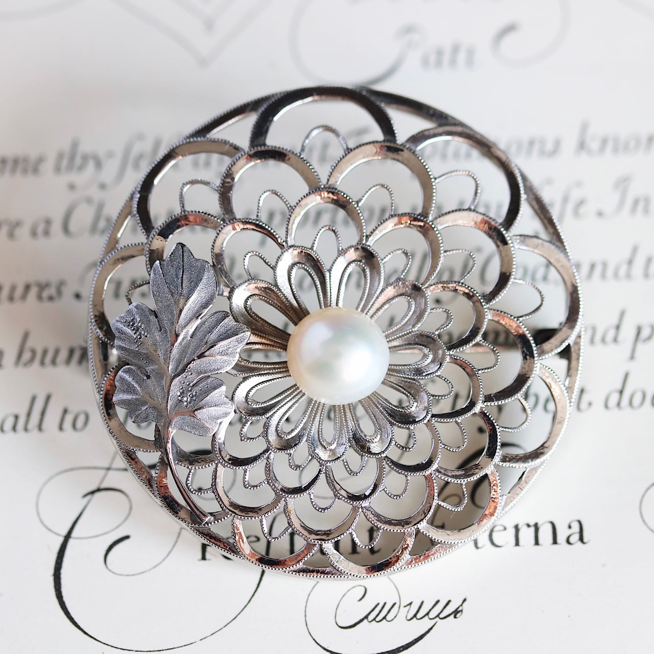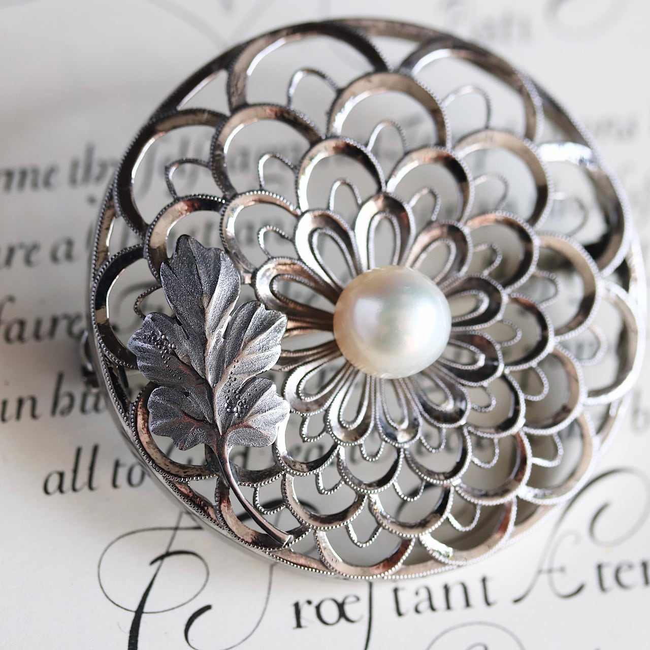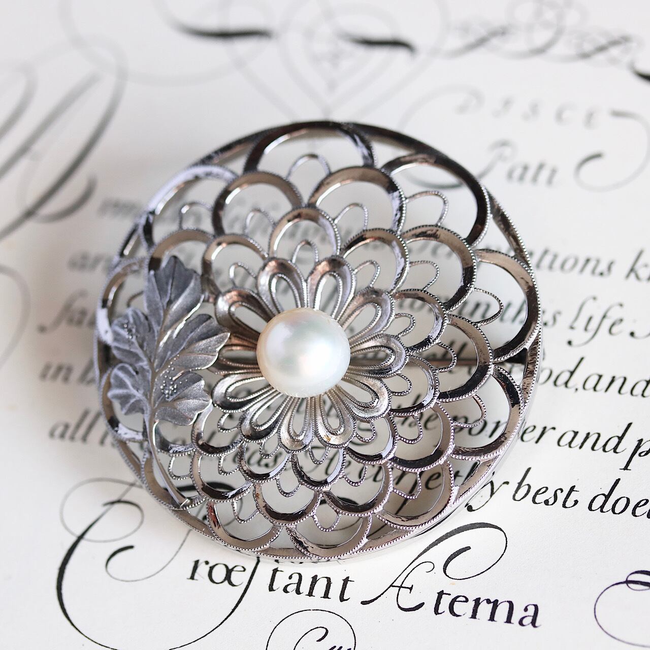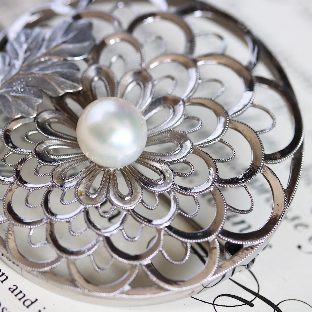 合金製 大粒あこや真珠 禿菊モチーフ ヴィンテージブローチ