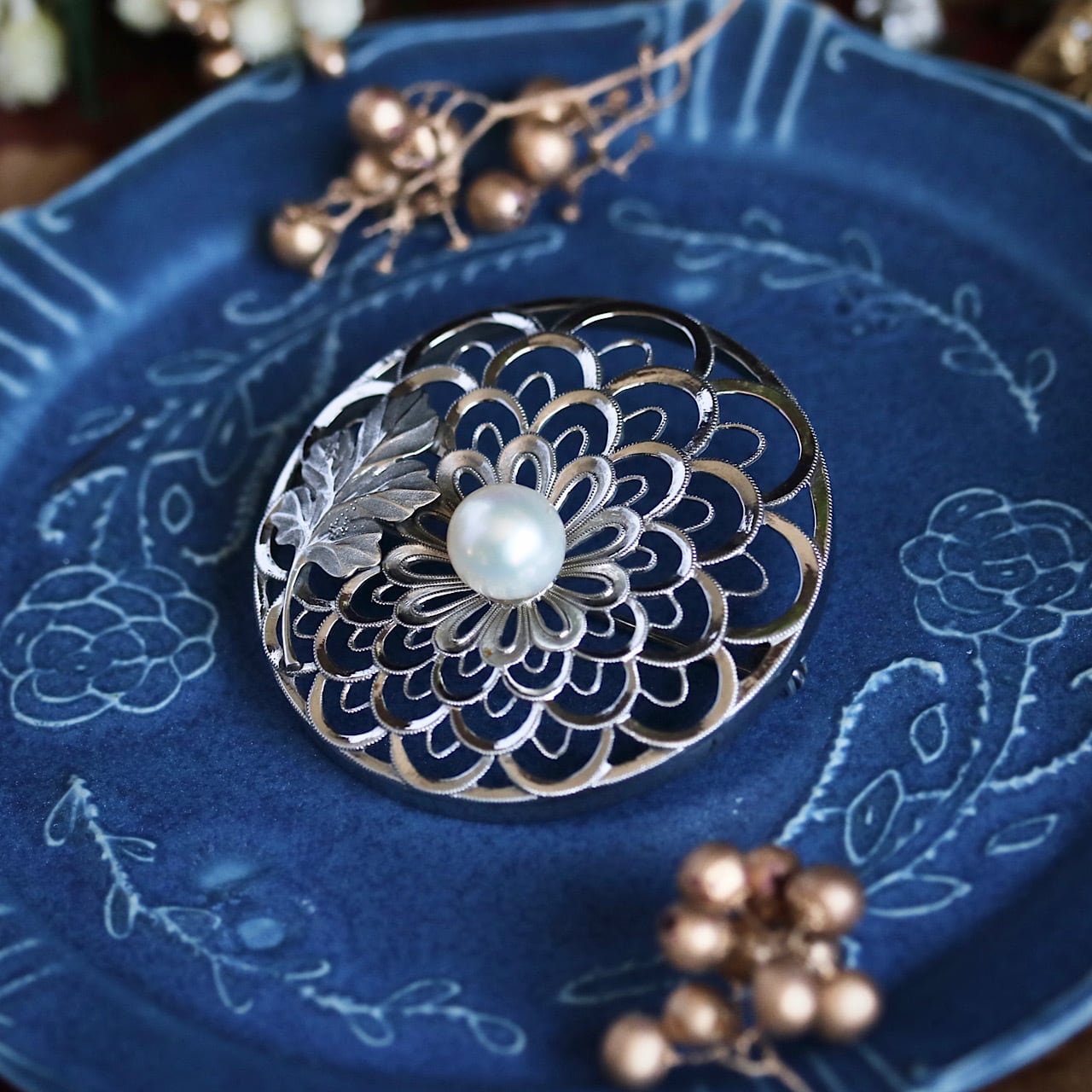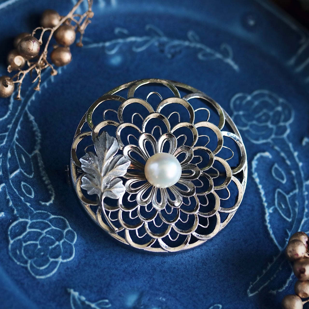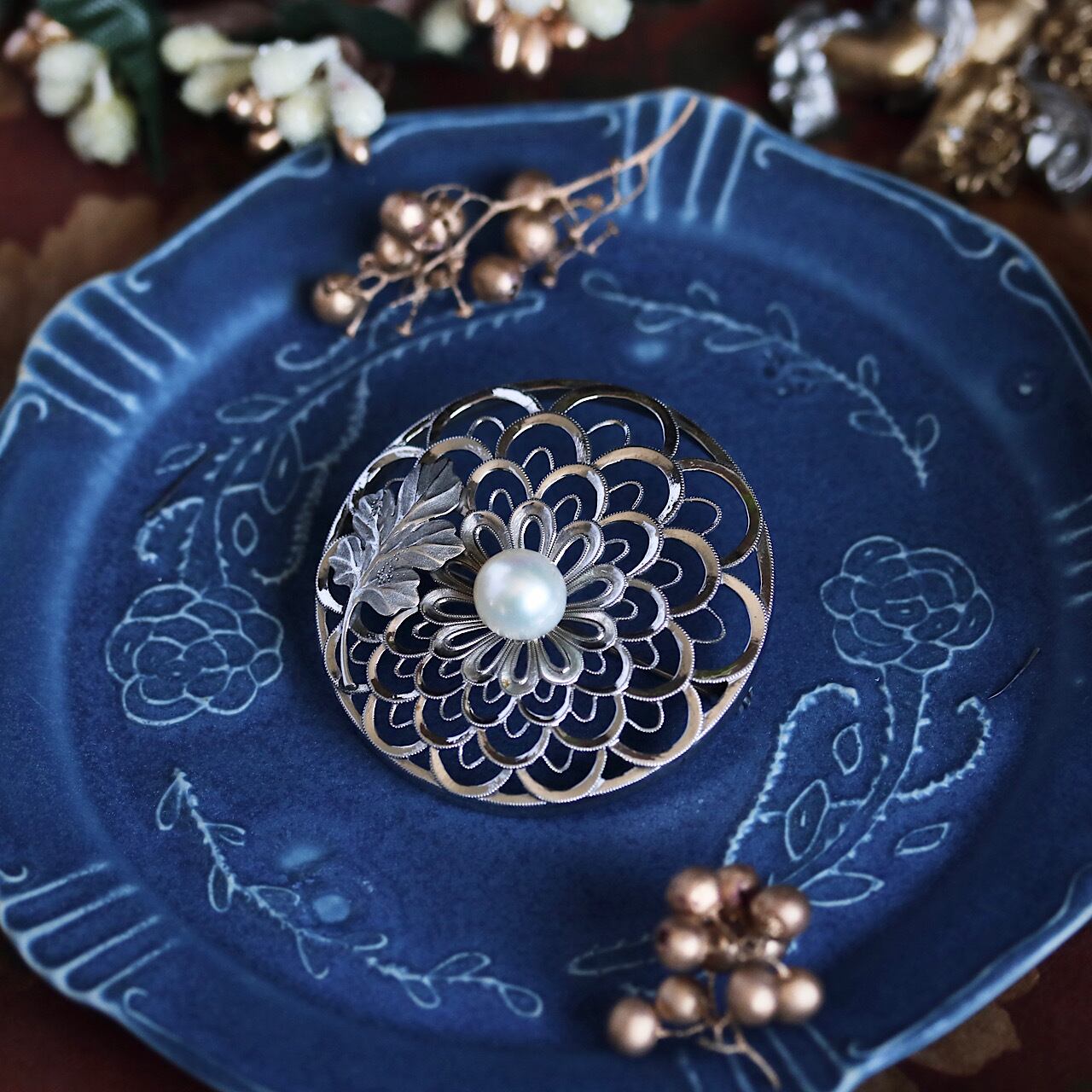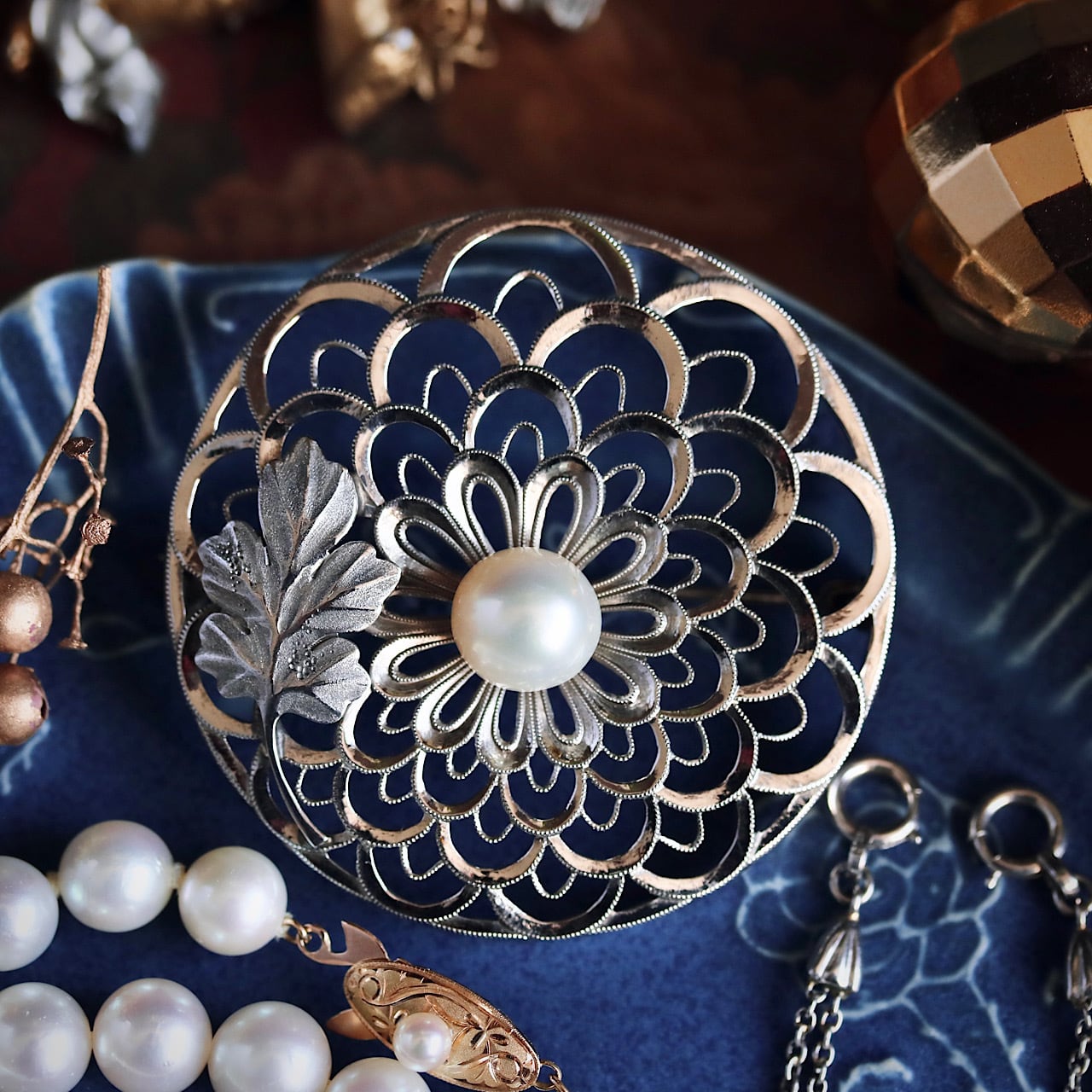 美しいあこや真珠があしらわれた禿(かむろ)菊のブローチ。