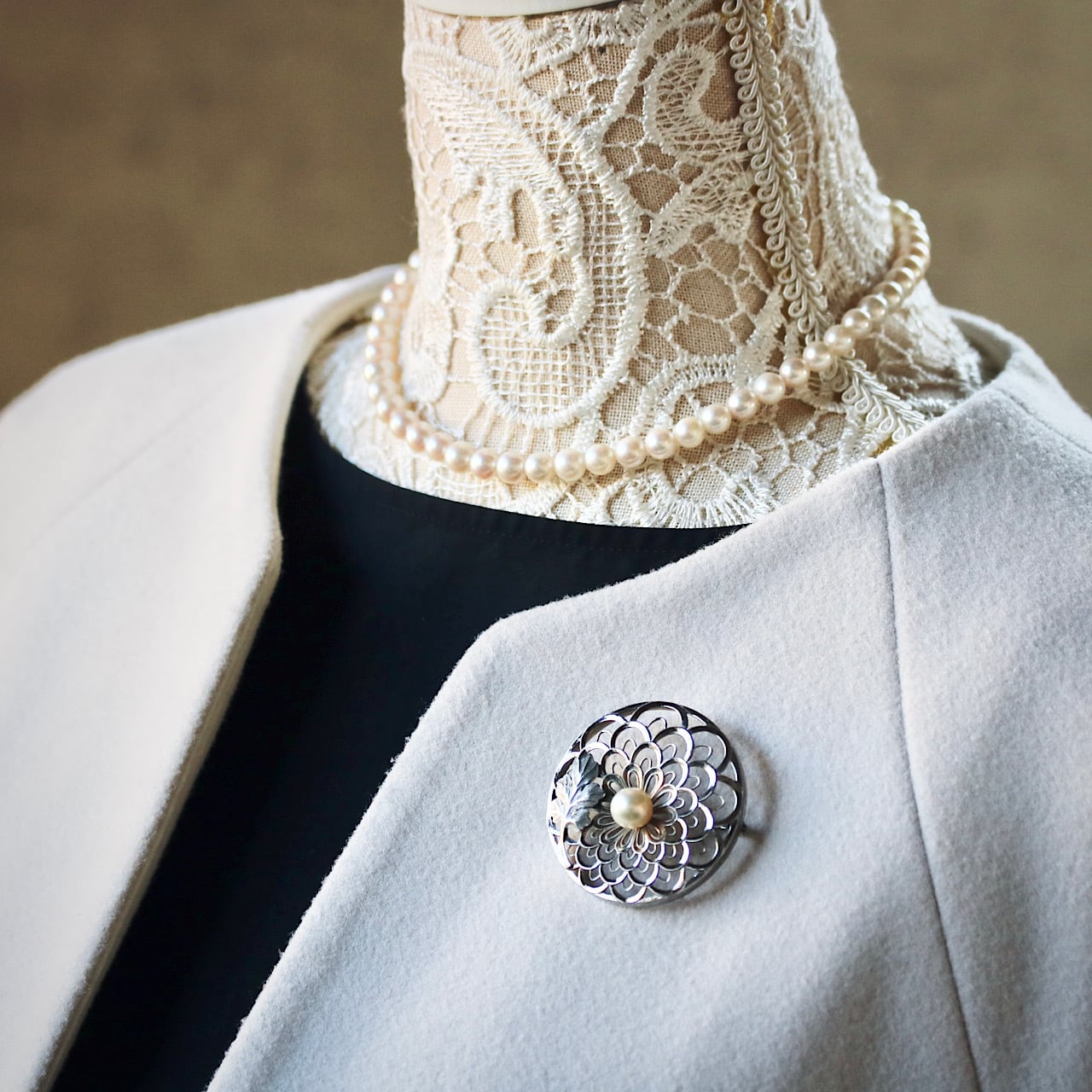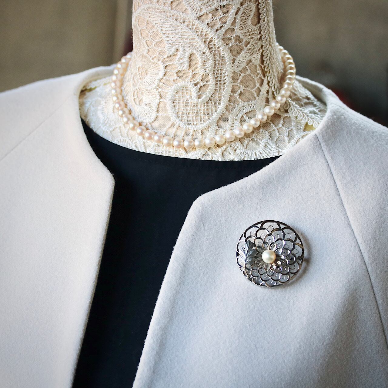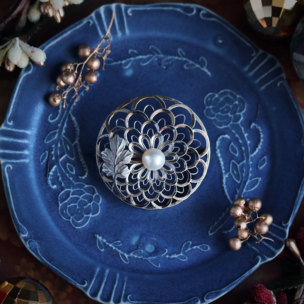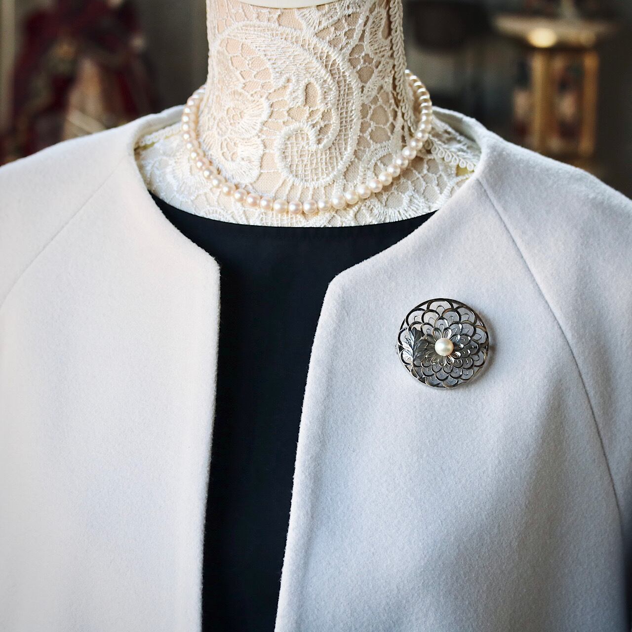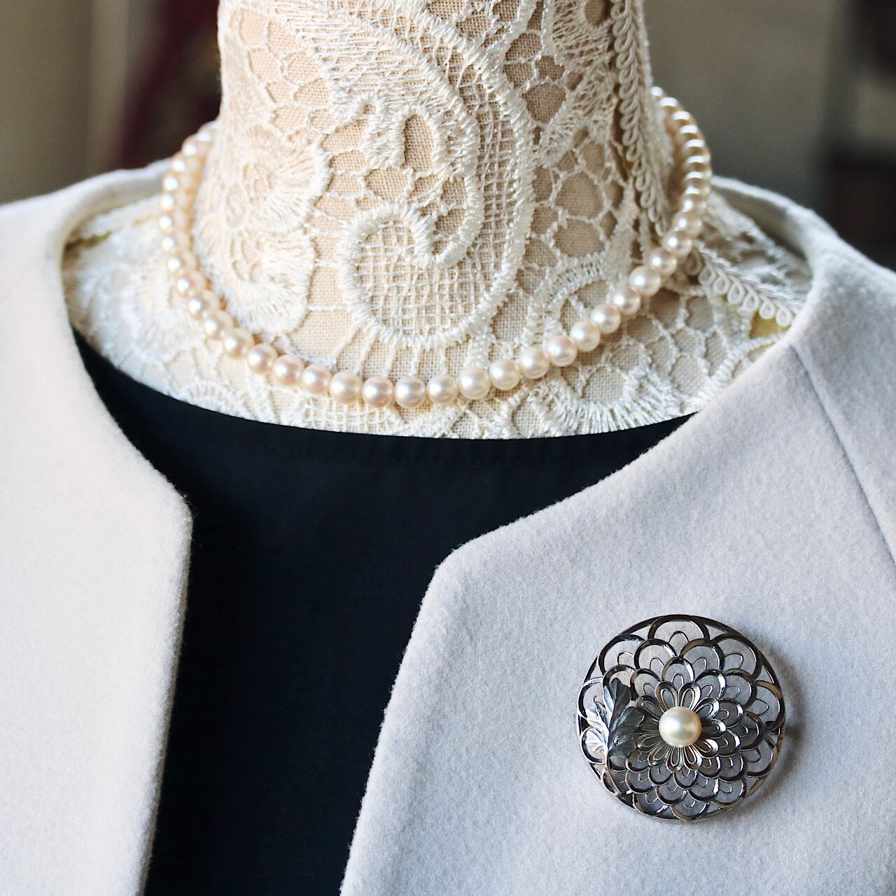 美しいあこや真珠があしらわれた禿(かむろ)菊のブローチ。
