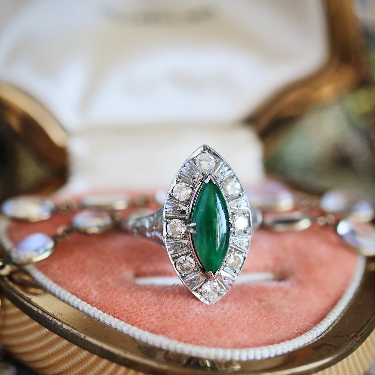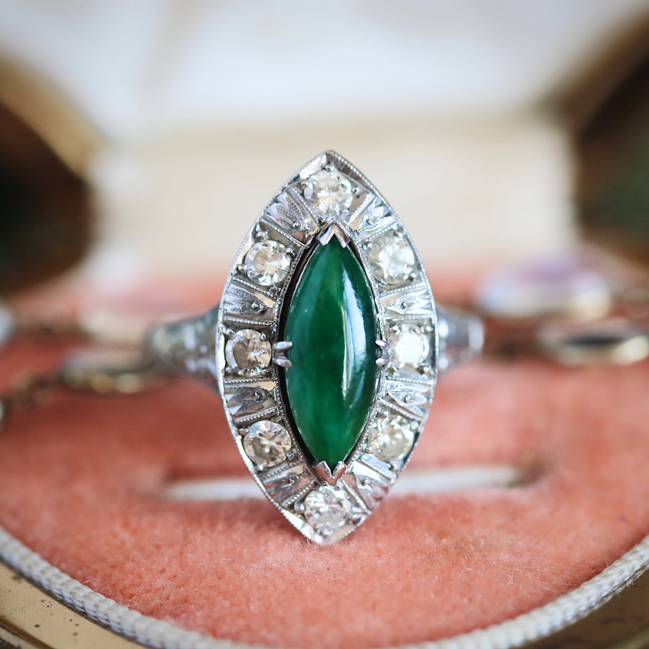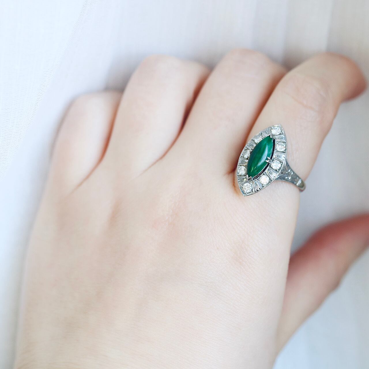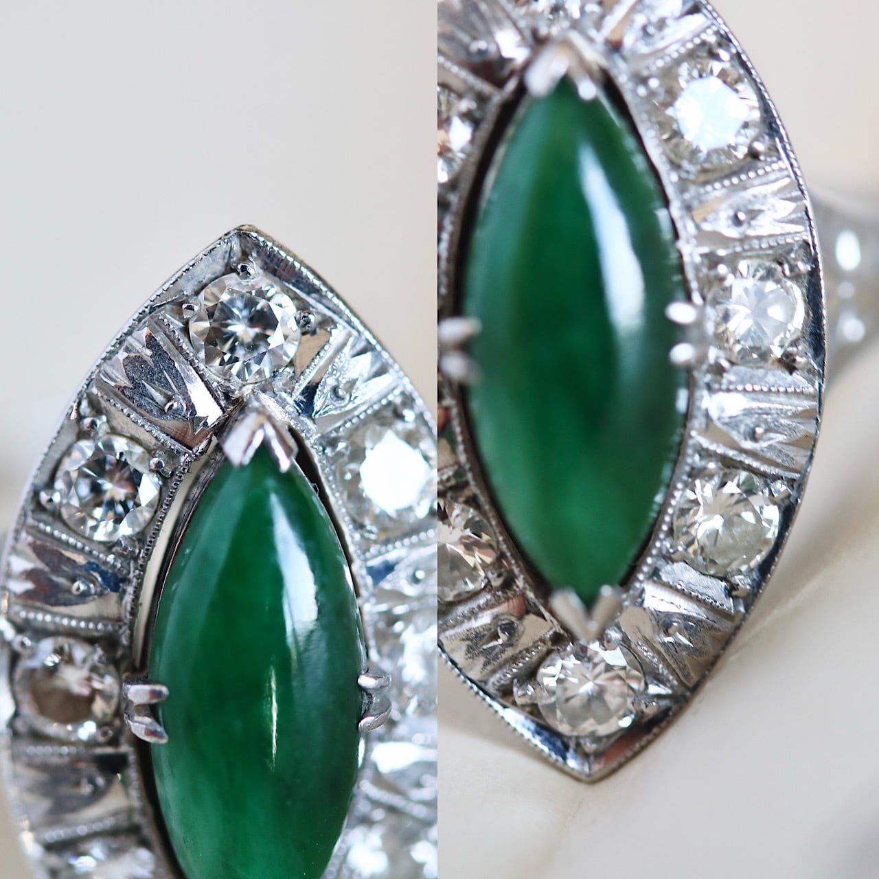 マーキスカットの翡翠にダイヤモンドが取り巻いた華やかなヴィンテージリング。