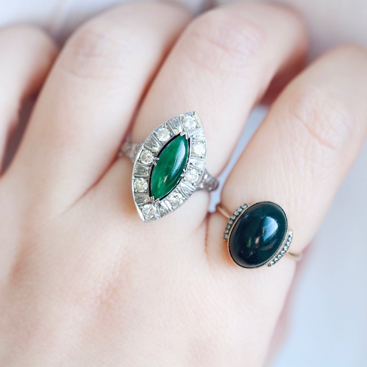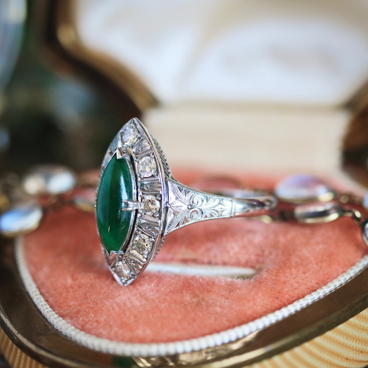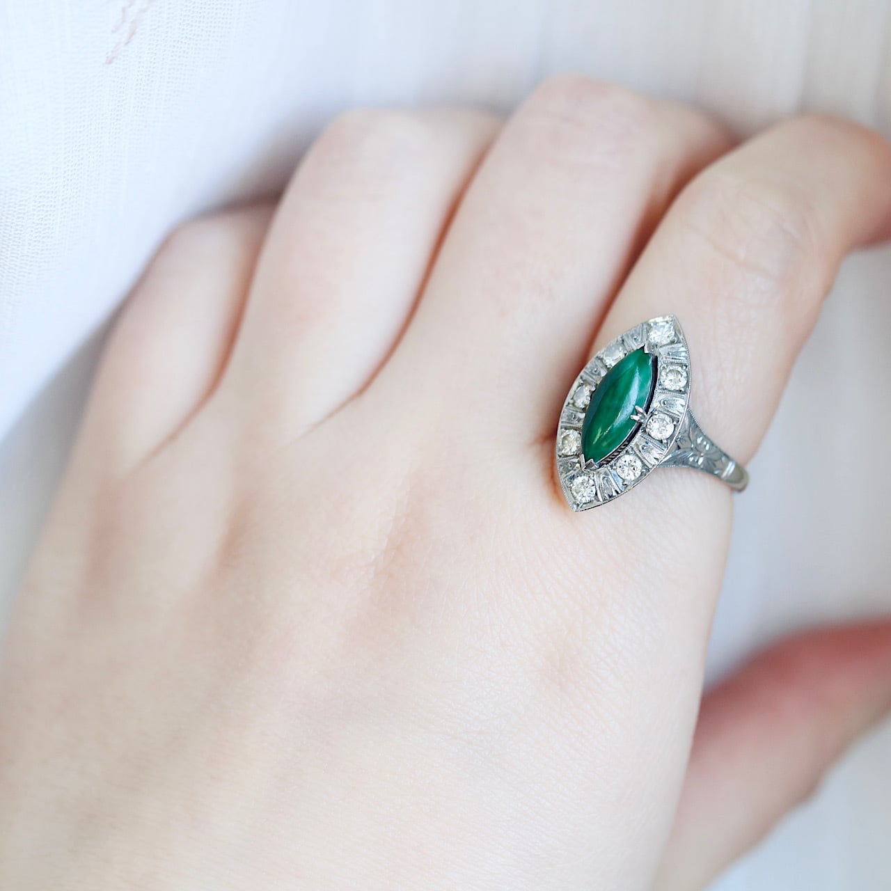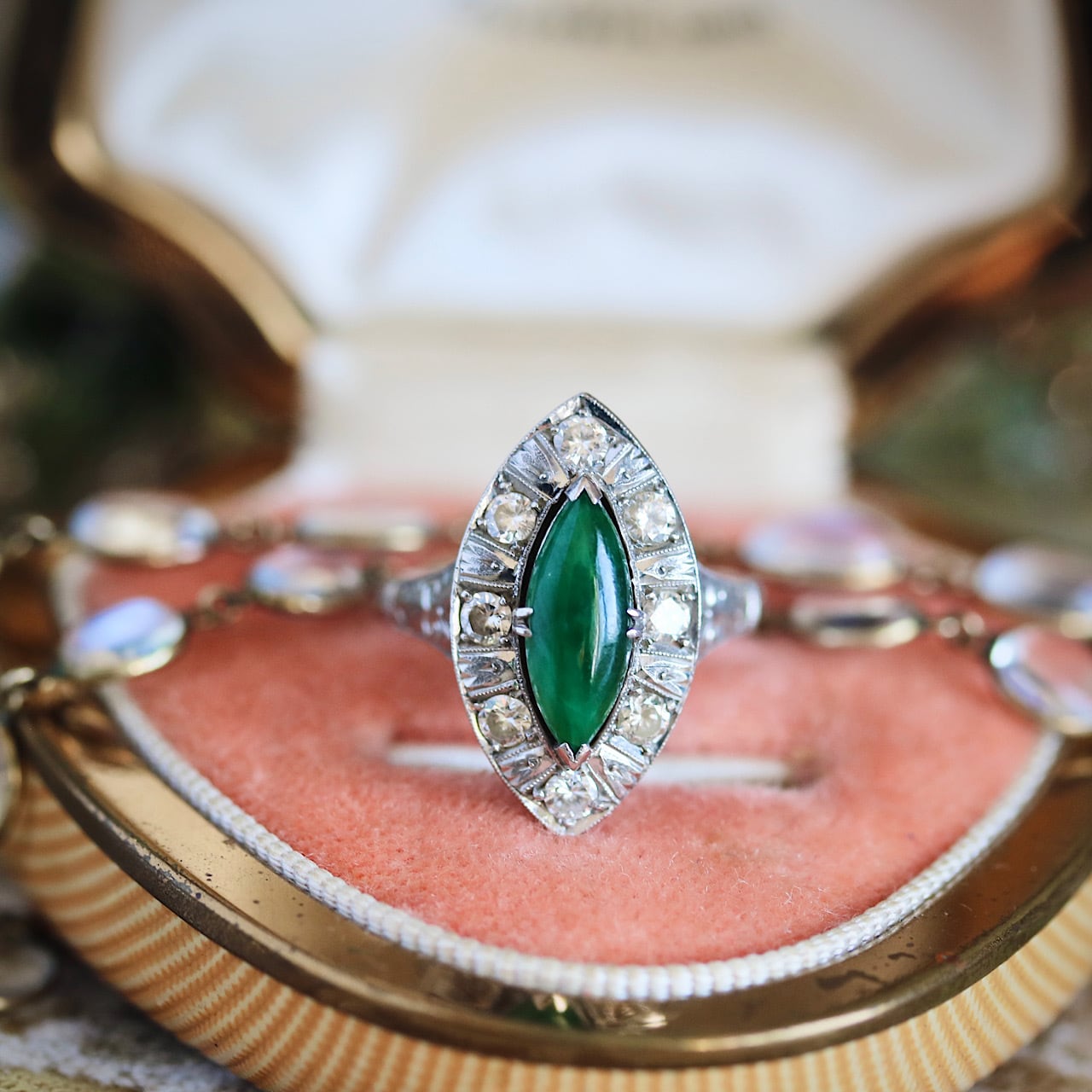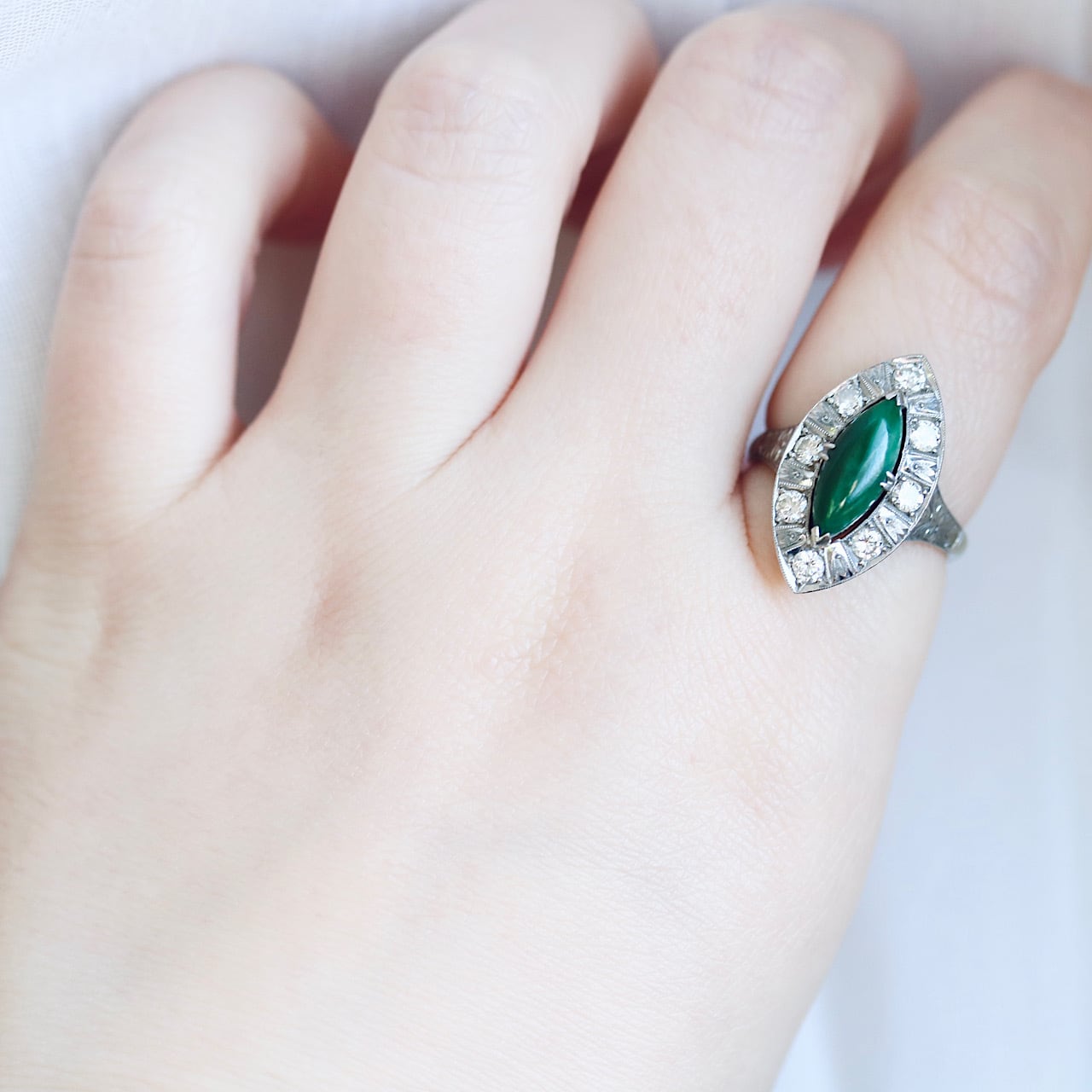 マーキスカットの翡翠にダイヤモンドが取り巻いた華やかなヴィンテージリング。