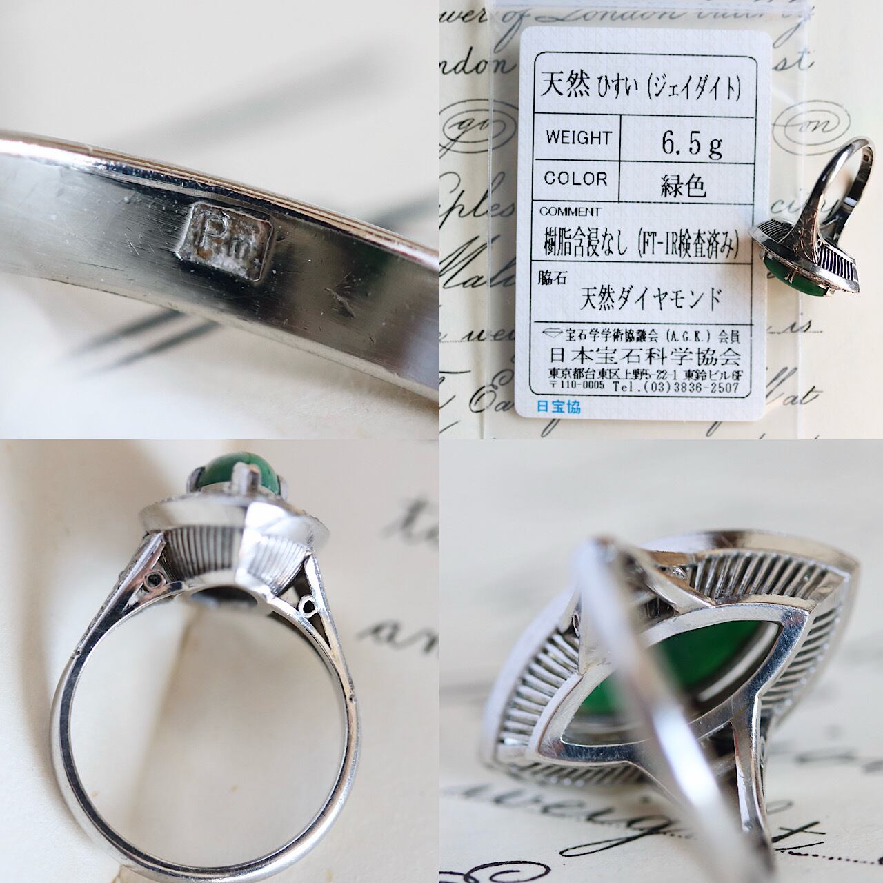 P.m プラチナ製 天然翡翠 ダイヤモンド取り巻き ヴィンテージリング ソーティングメモ付