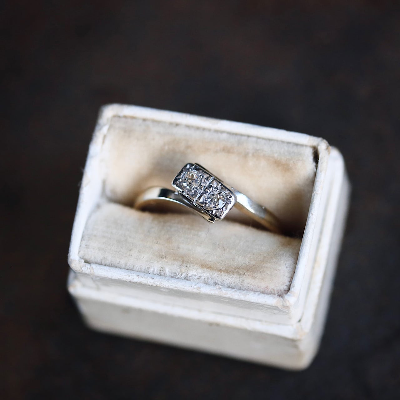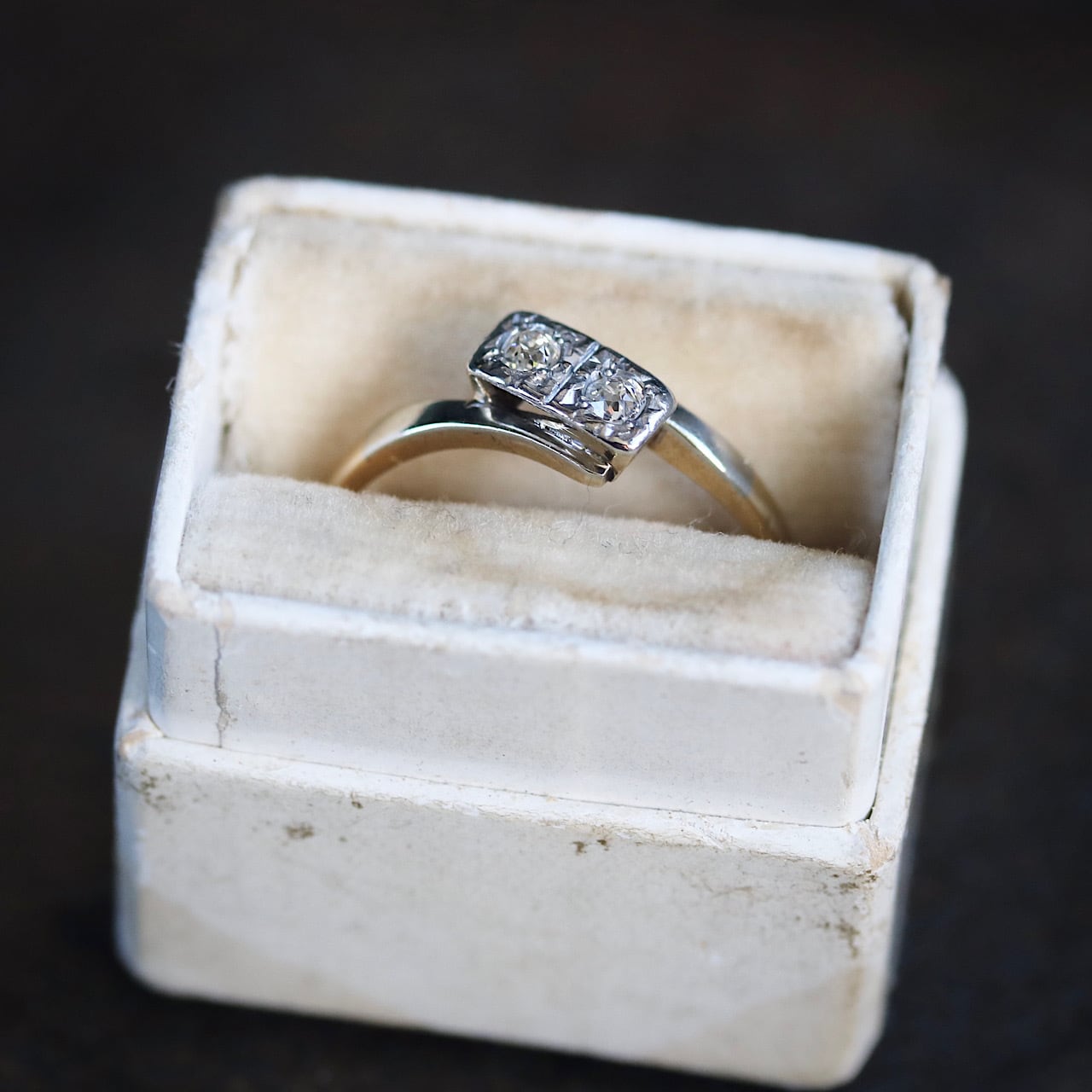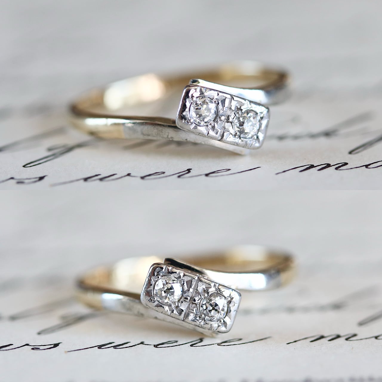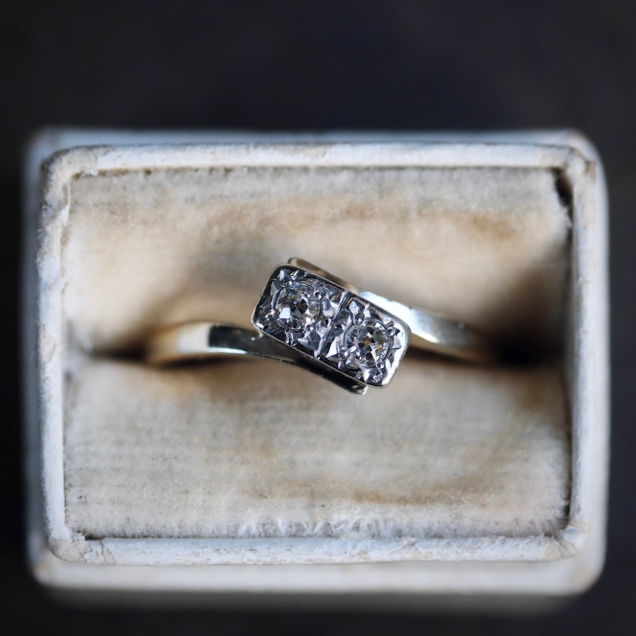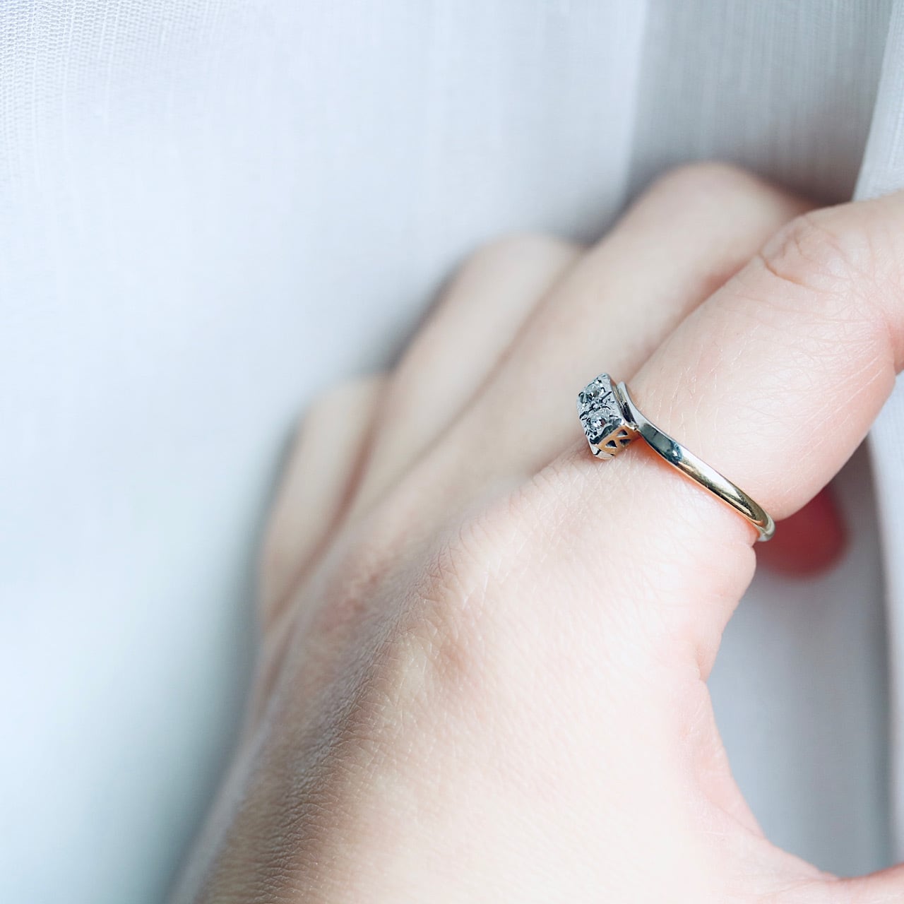 2つのオールドヨーロピアンカットのダイヤモンドが寄り添うロマンチックなトワエモワリング。
