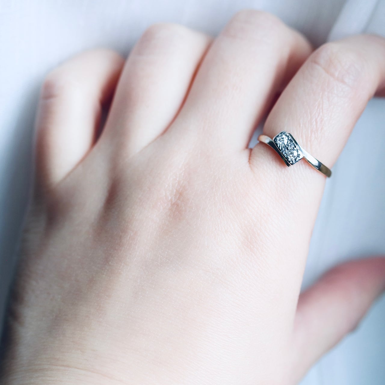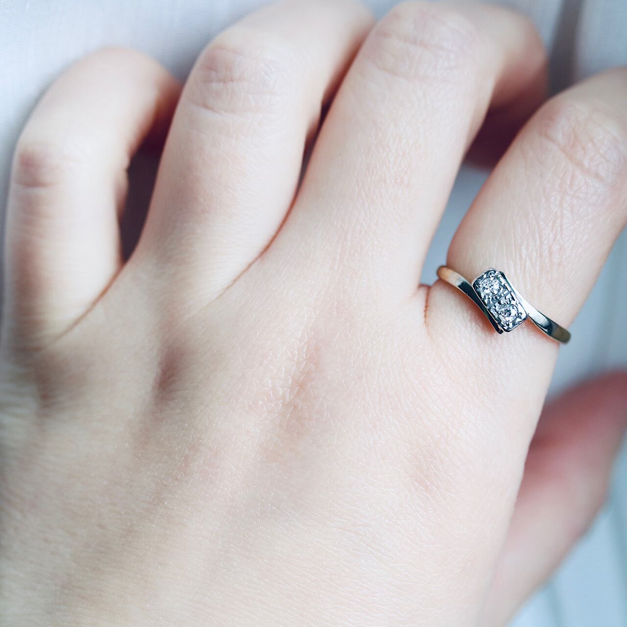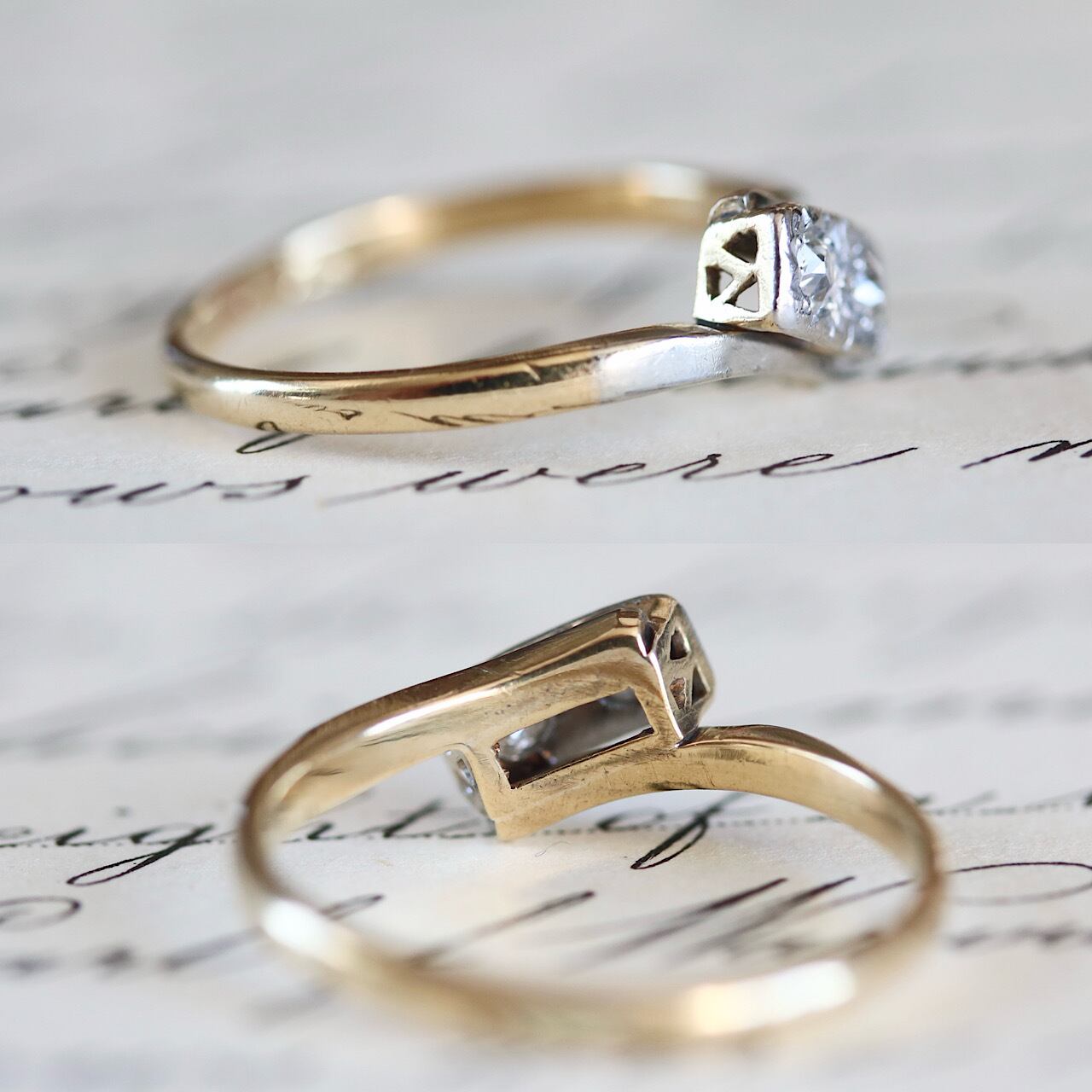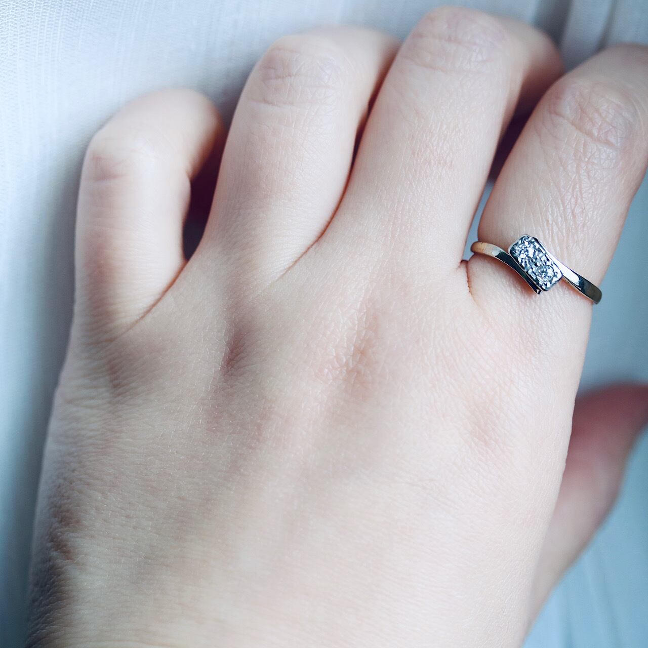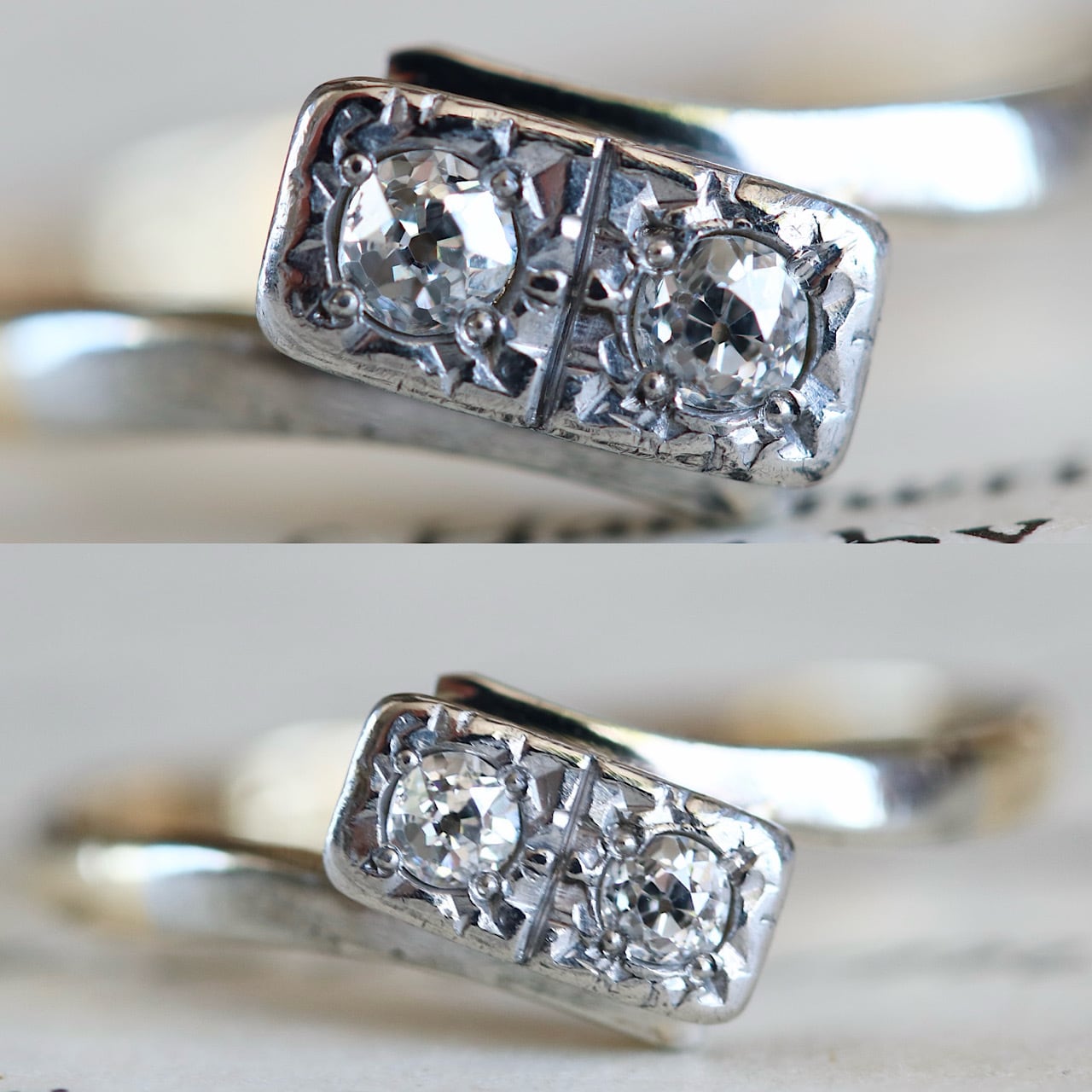 2つのオールドヨーロピアンカットのダイヤモンドが寄り添うロマンチックなトワエモワリング。