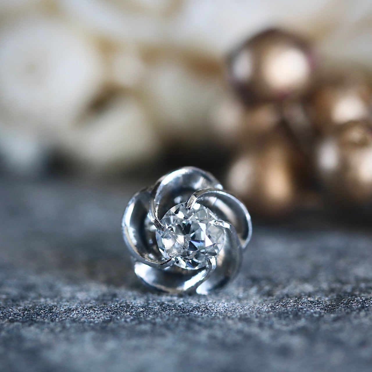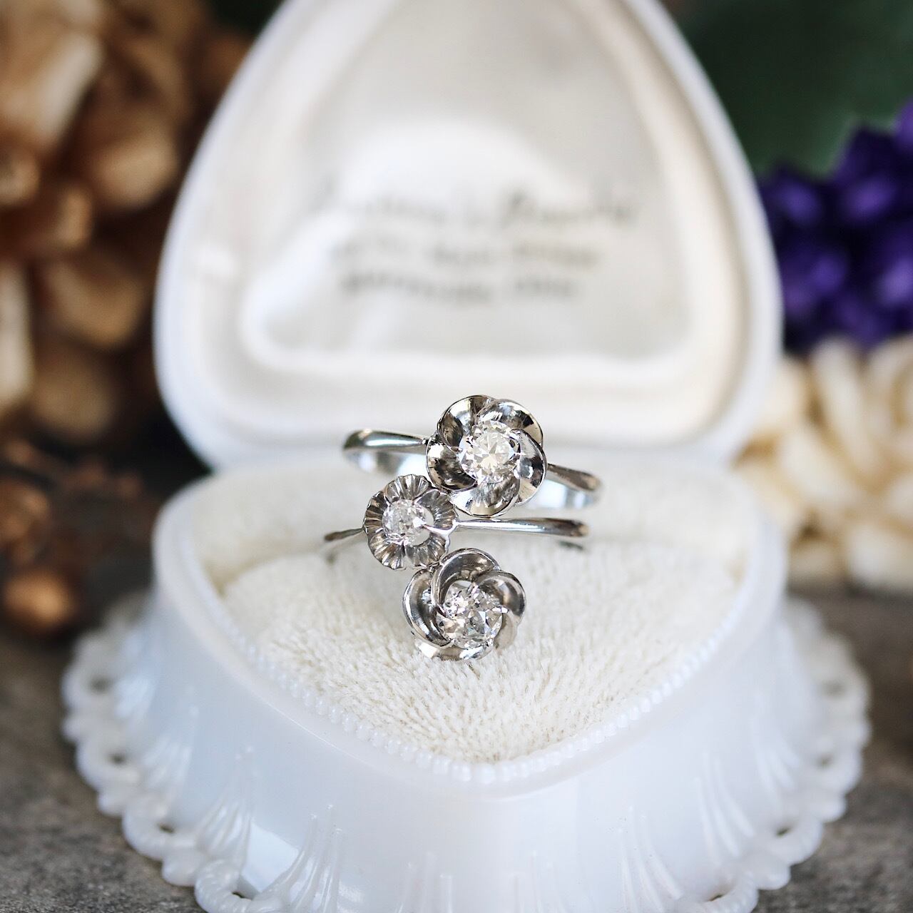 ダイヤモンドは、オールドヨーロピアンカットのものが使用されており、肉厚でゴツゴツとした瑞々しい上品な輝きが魅力です。