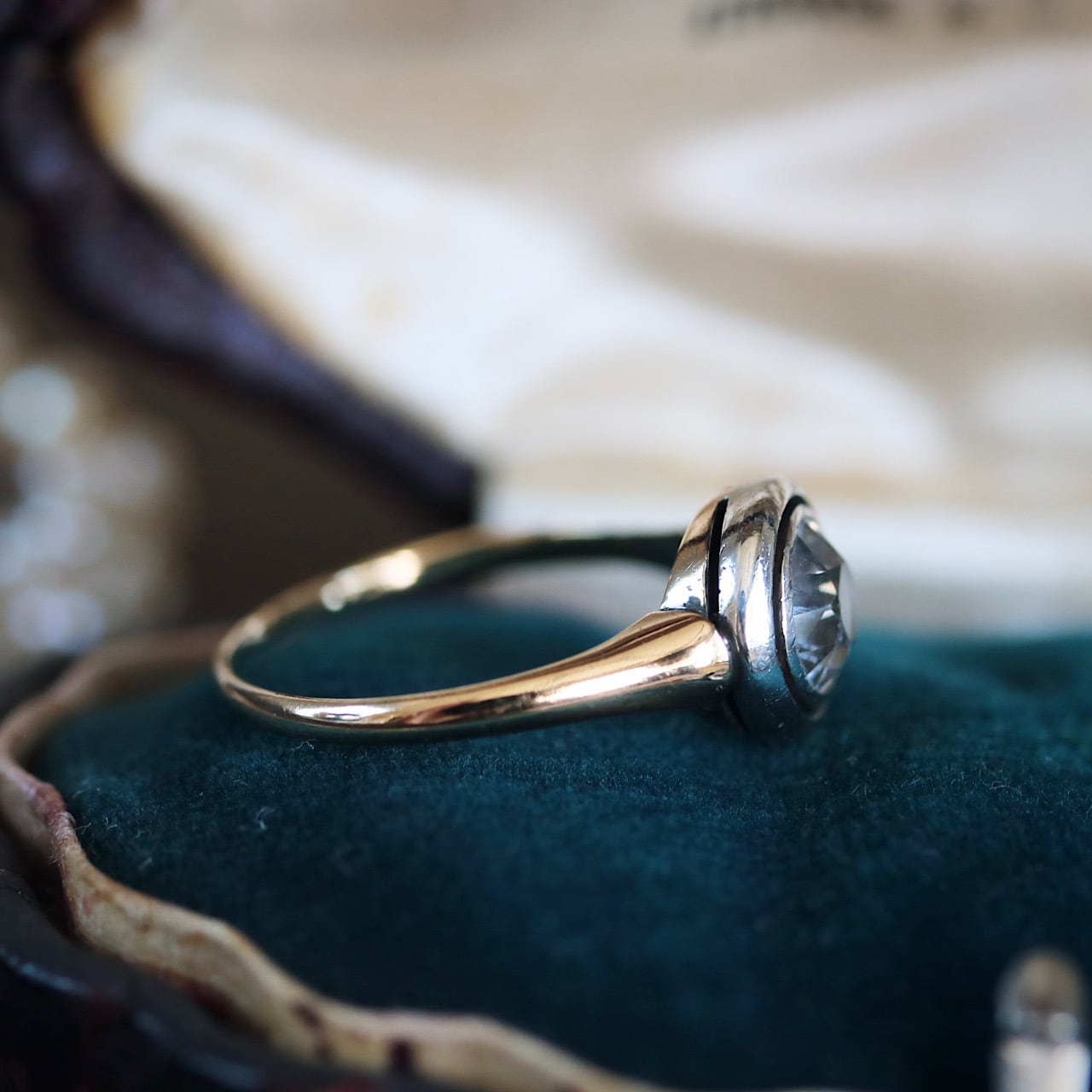 リングの造りや二色金、典型的なアールデコデザインから大正時代〜昭和初期頃の作品と思われる希少なヴィンテージリングです。