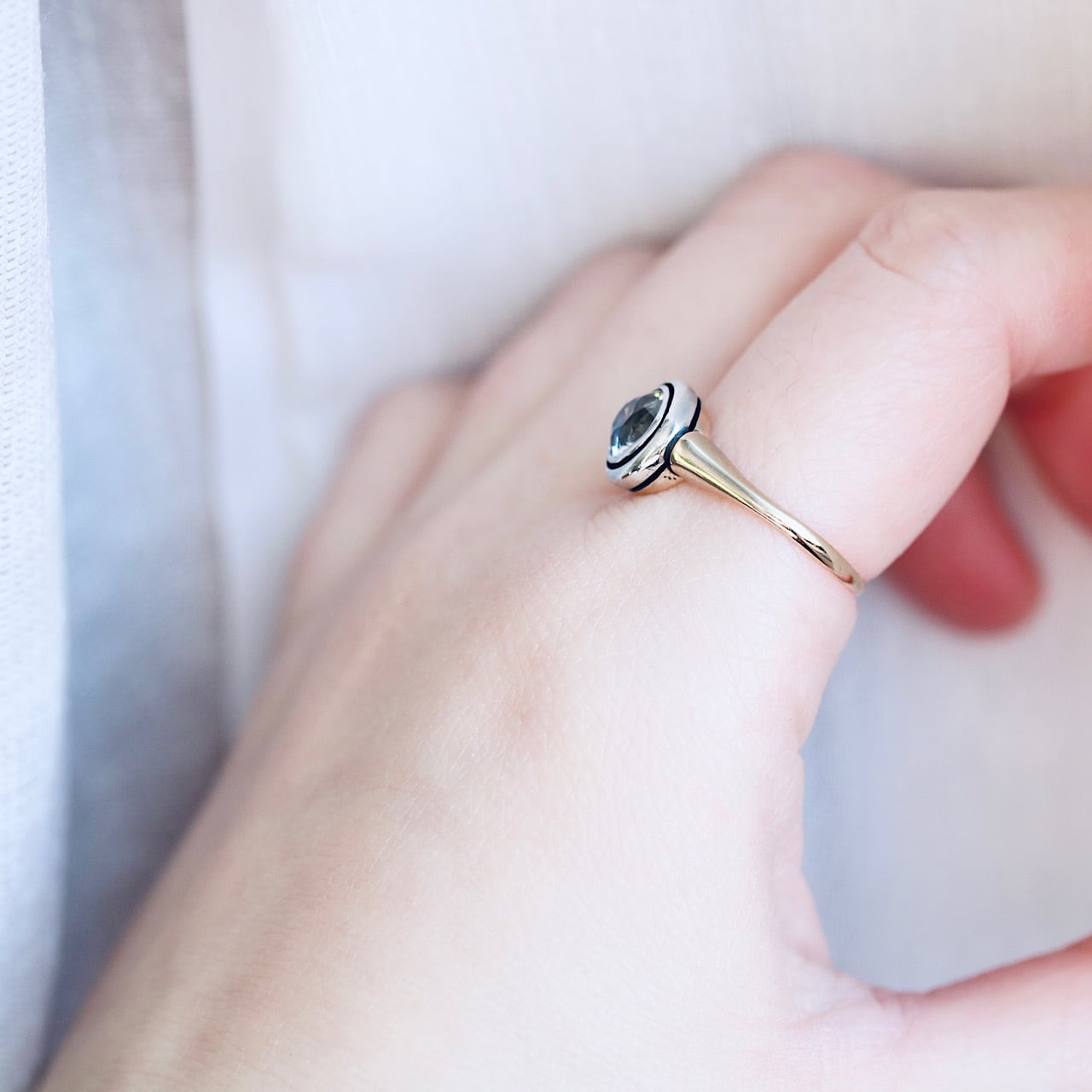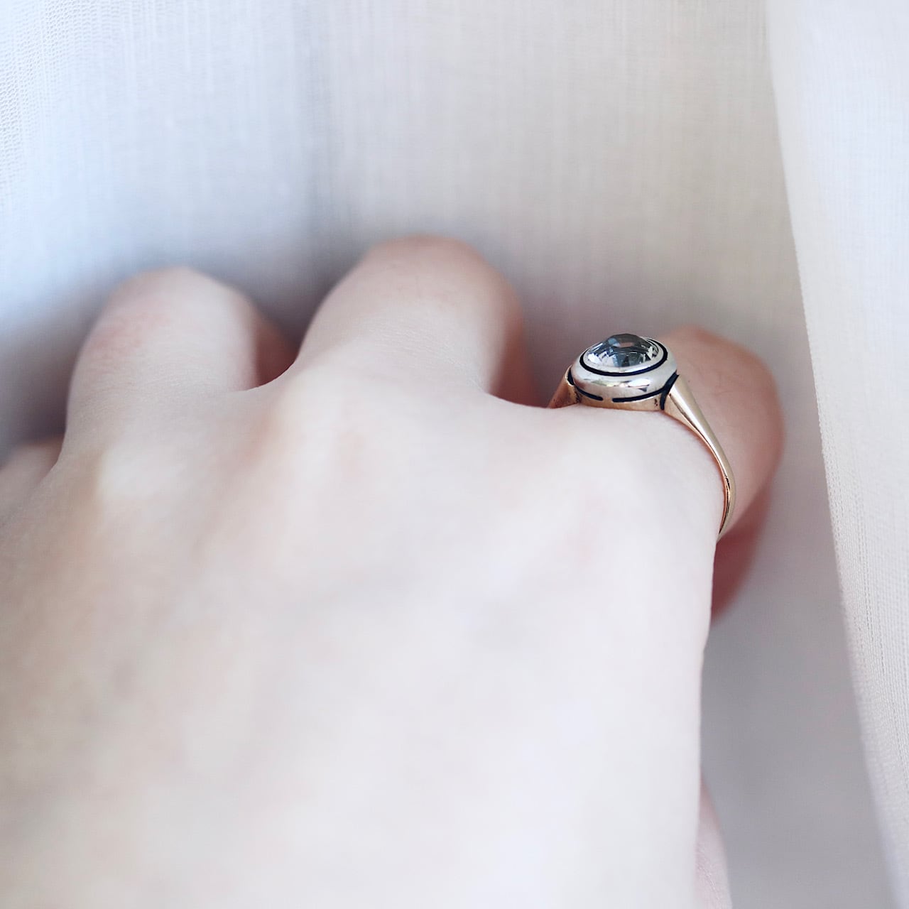 透き通るような透明感が目を引く、合成サファイアの和製アールデコリング。
