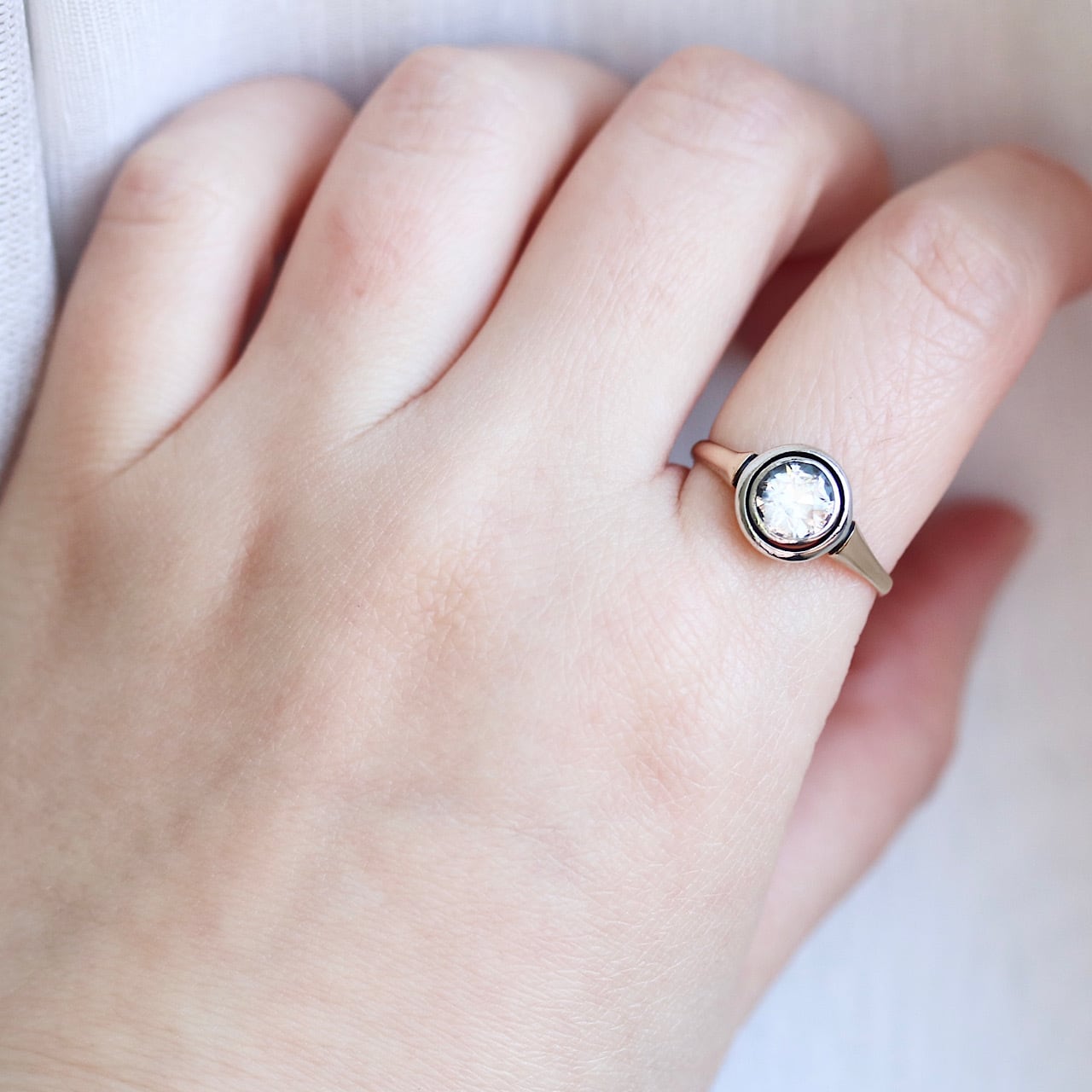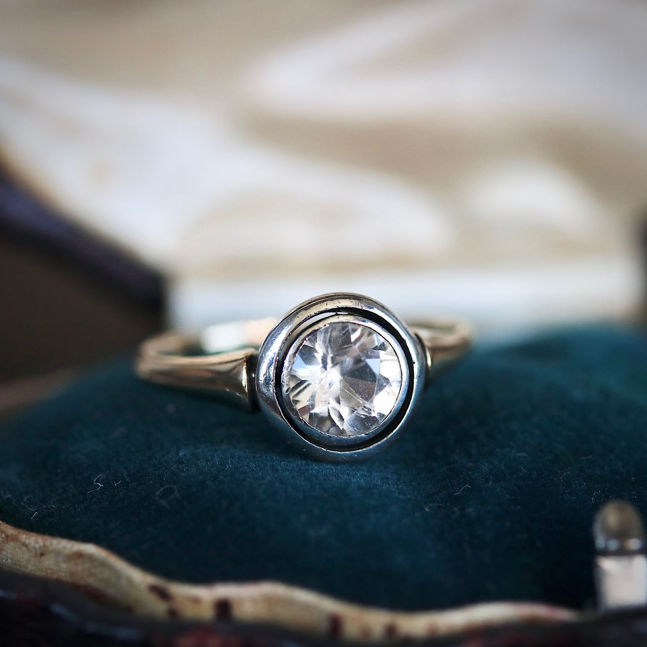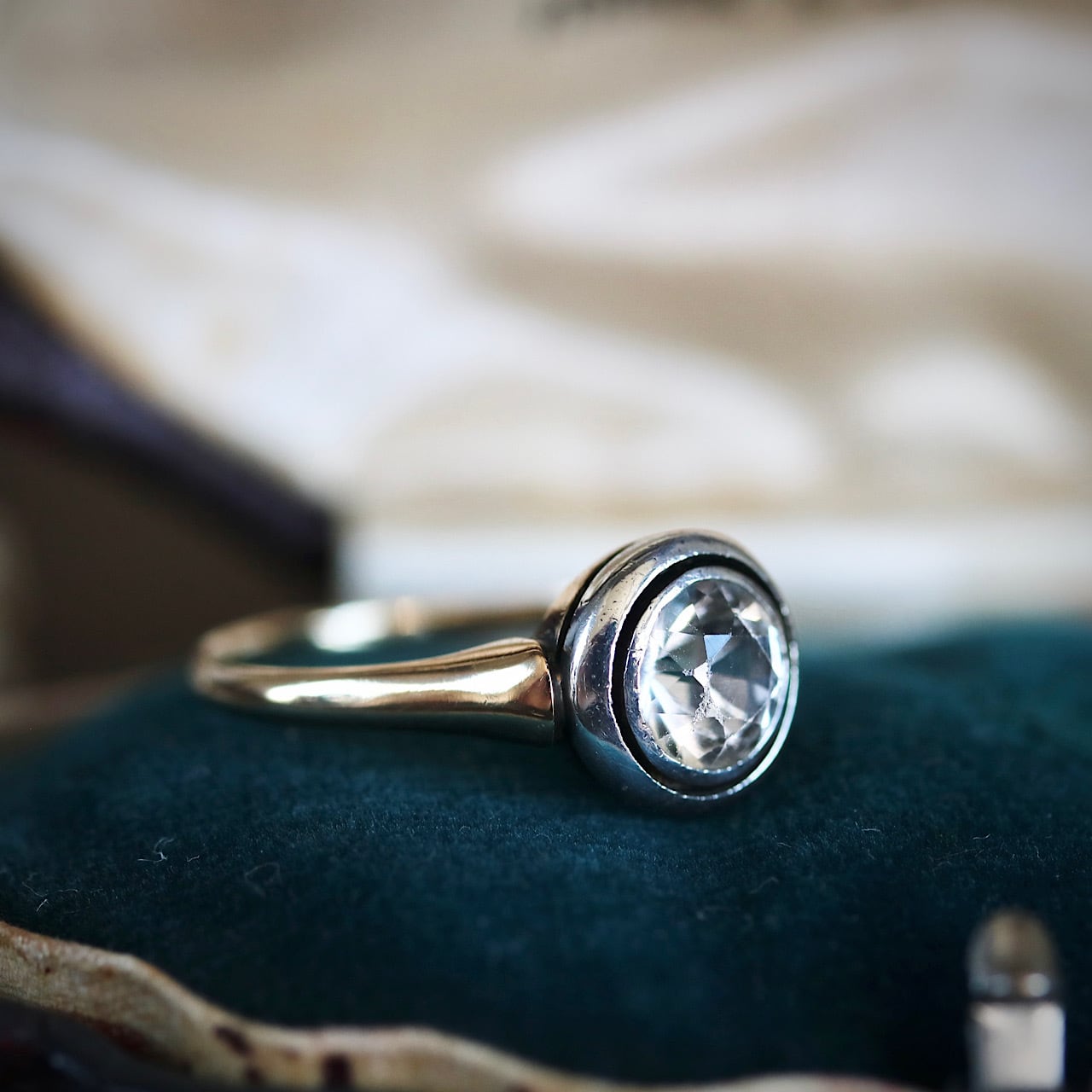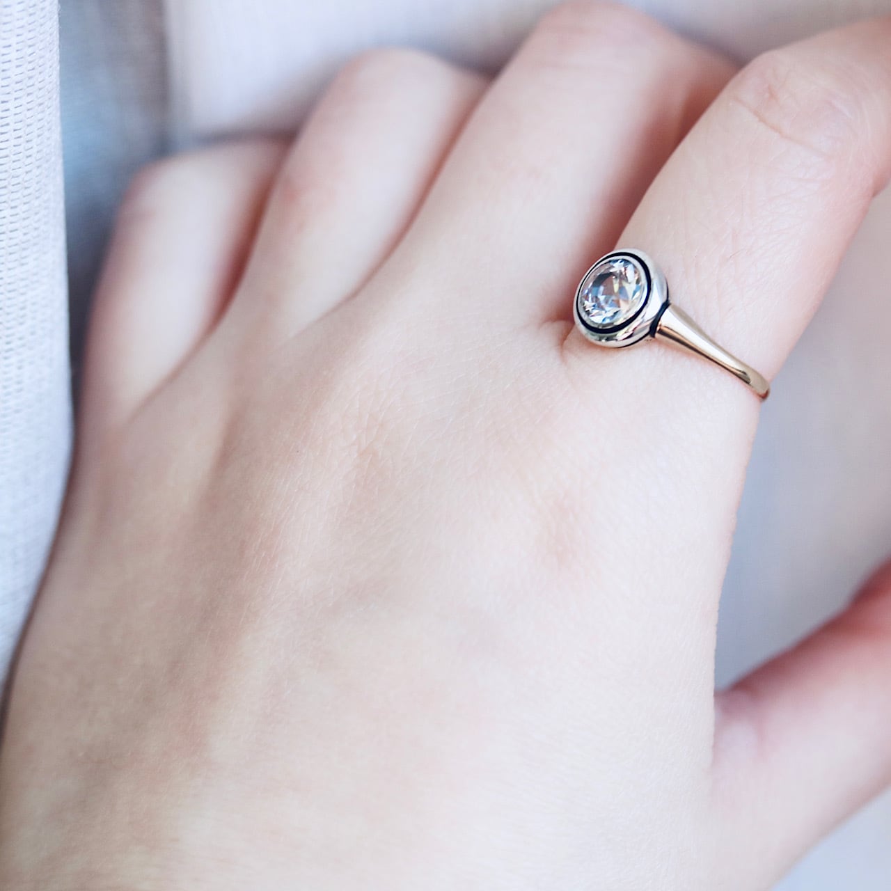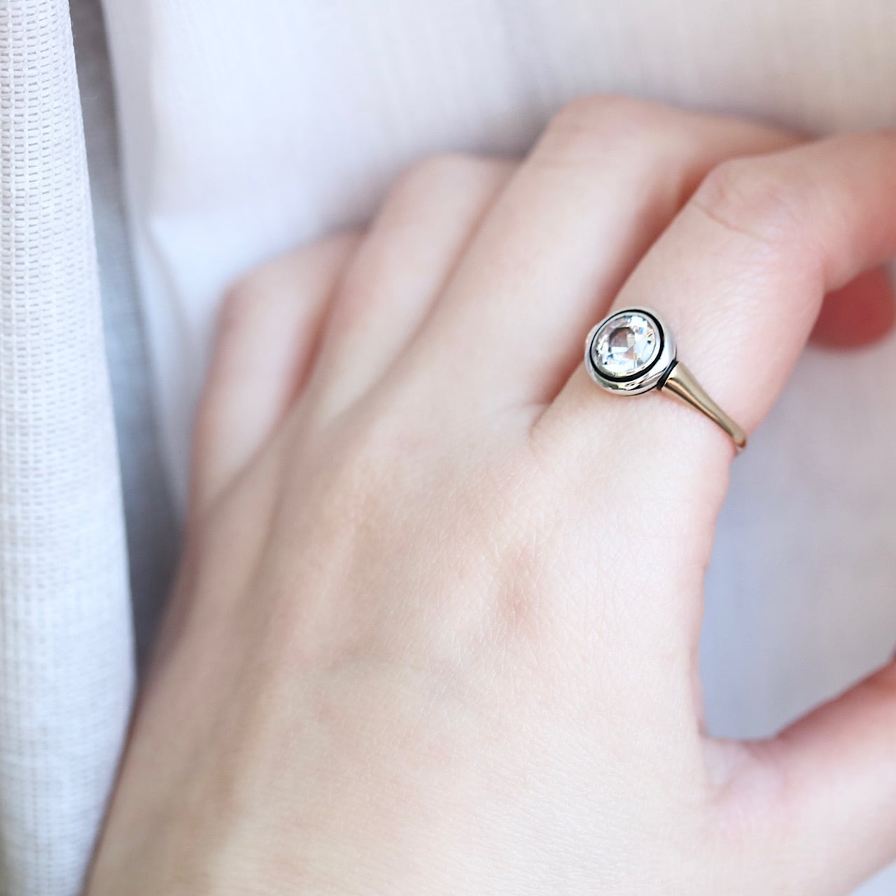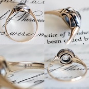 K14 カラーレス合成サファイア サークルデザイン 二色金 和製アールデコリング。