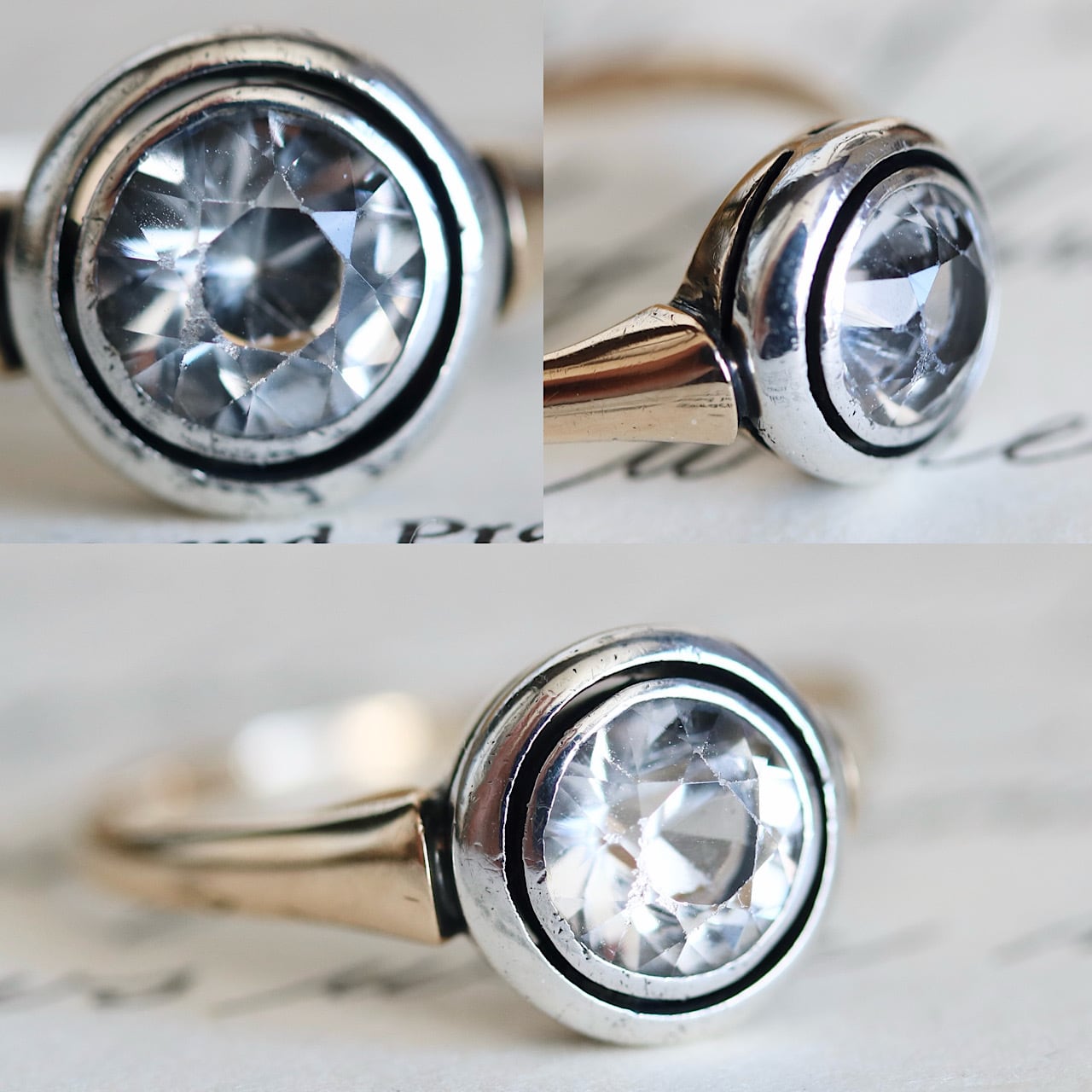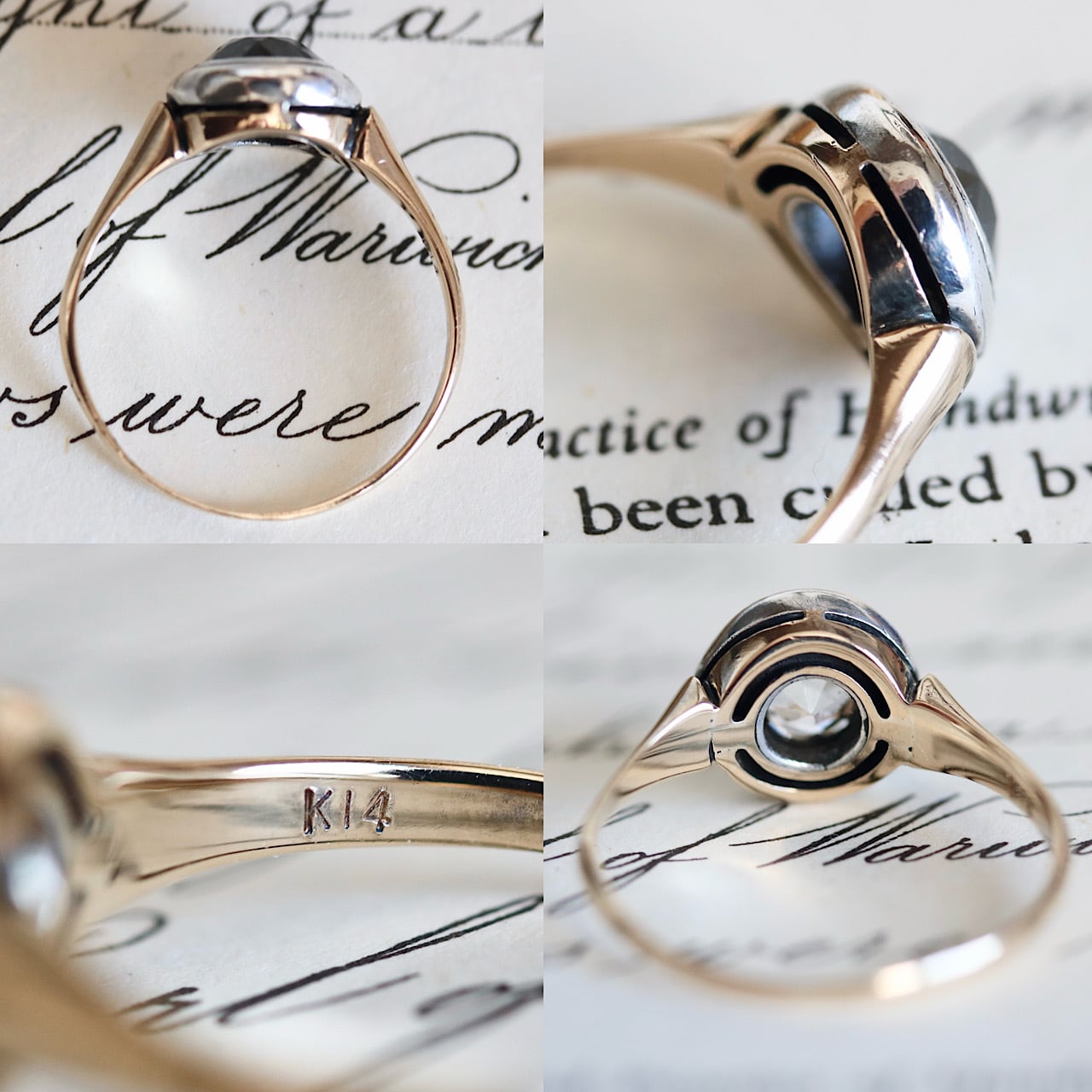 【貴重】K14 カラーレス合成サファイア サークル アールデコ 二色金デザイン ヴィンテージリング ソーティングメモ付
