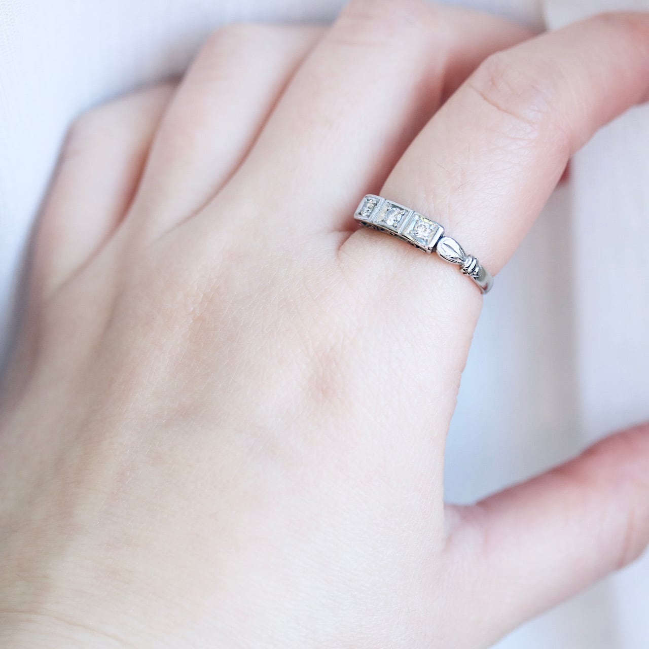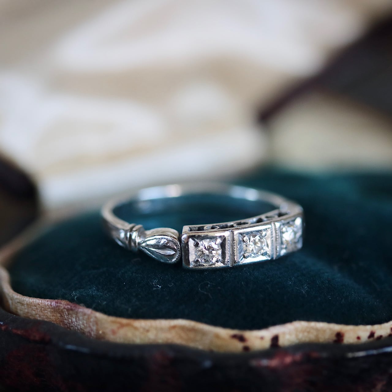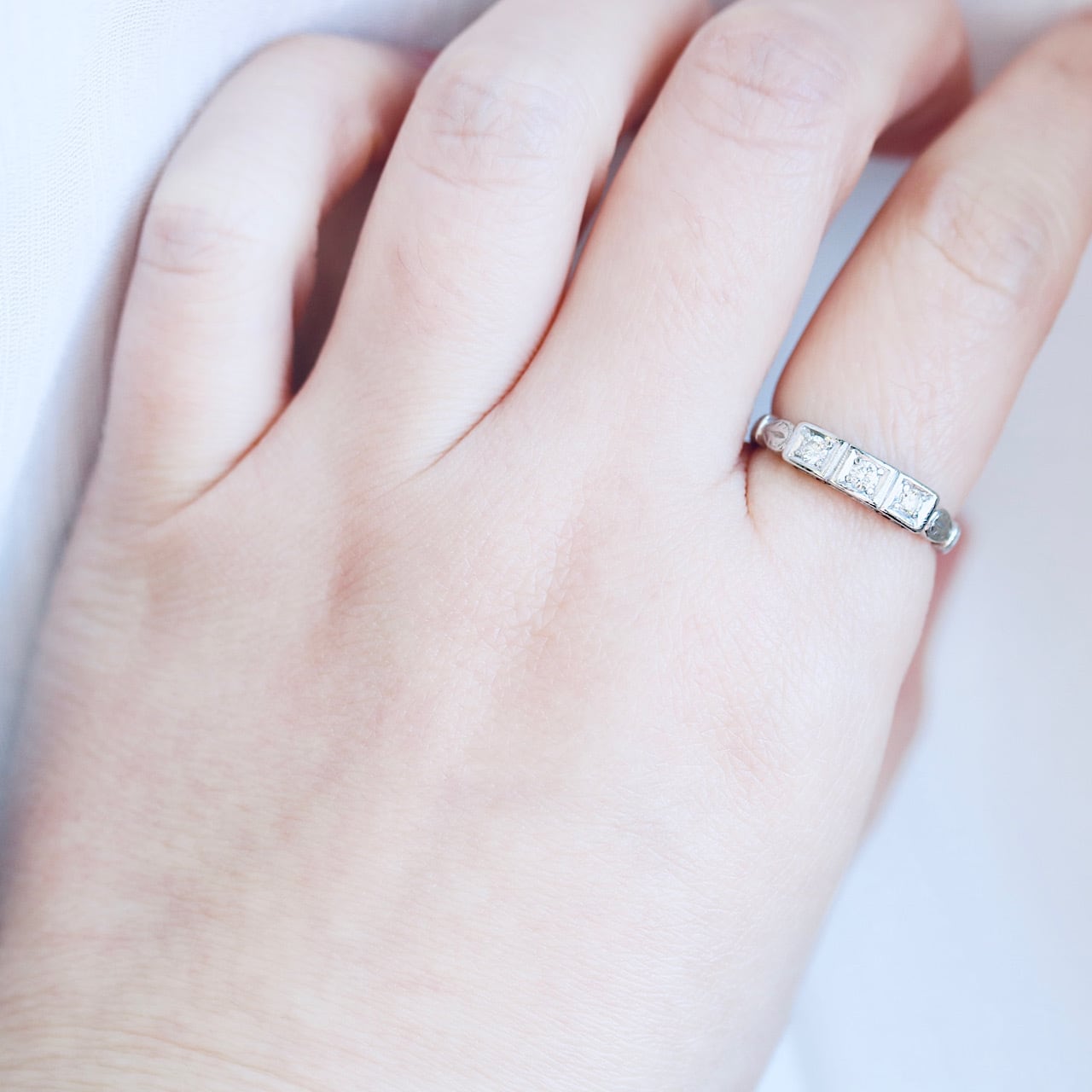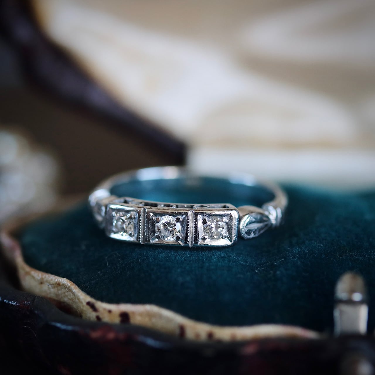 3つのダイヤモンドが煌めくアールデコデザインのヴィンテージリング。