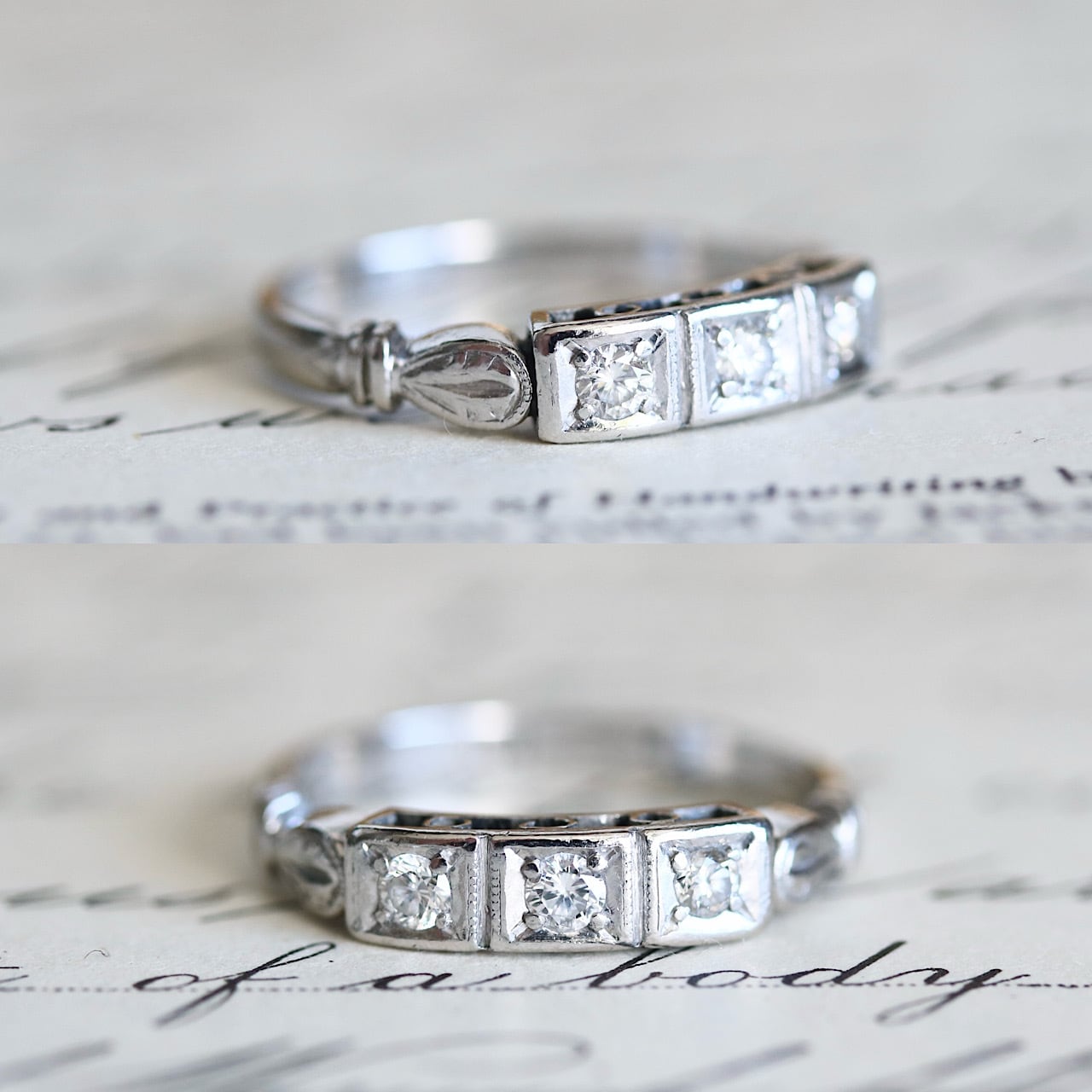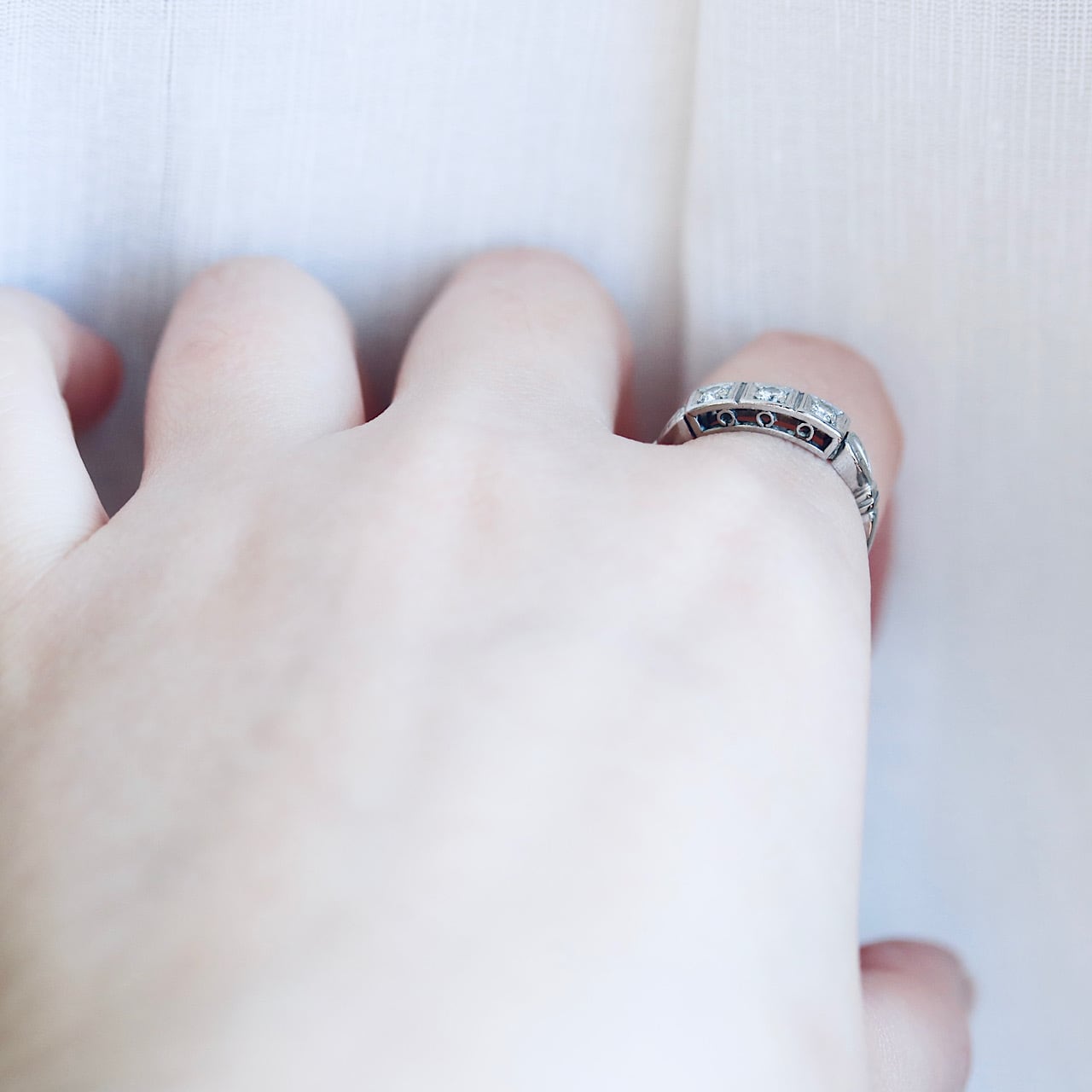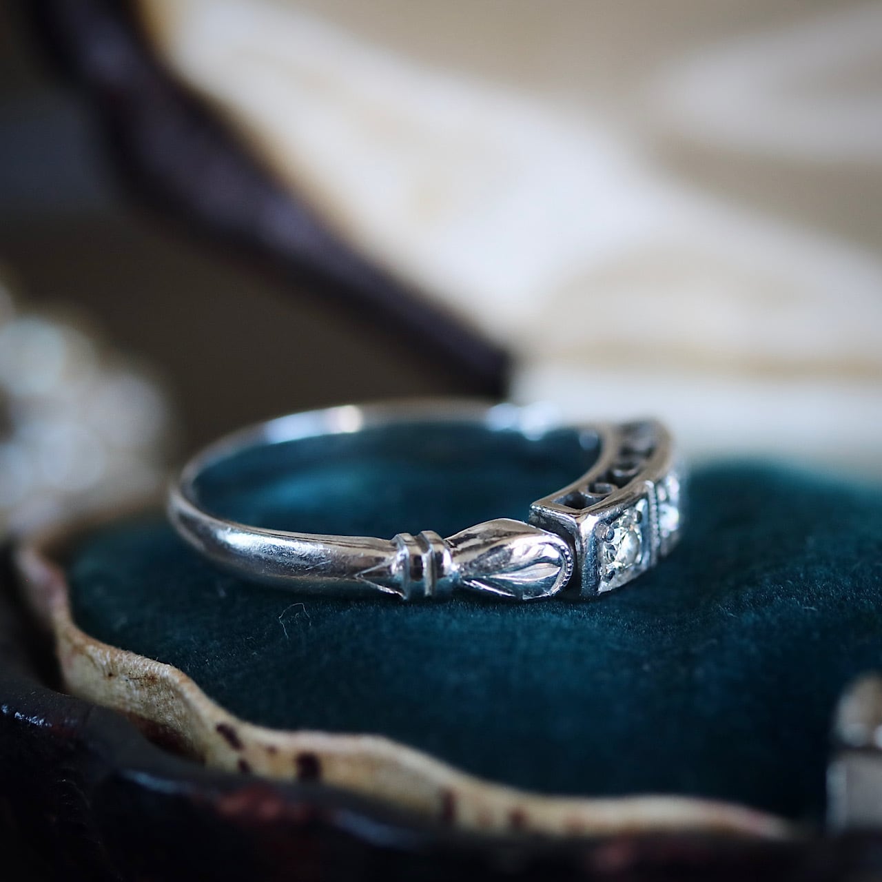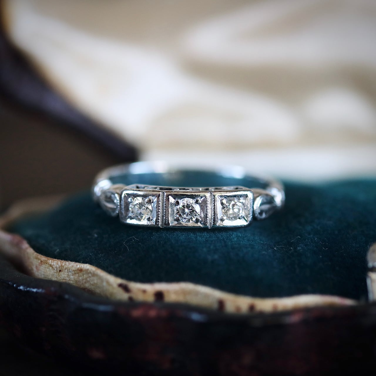 3つのダイヤモンドが煌めくアールデコデザインのヴィンテージリング。