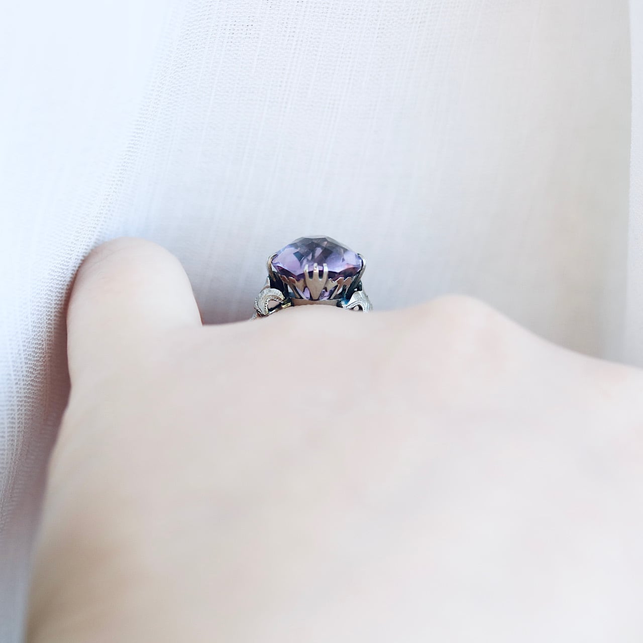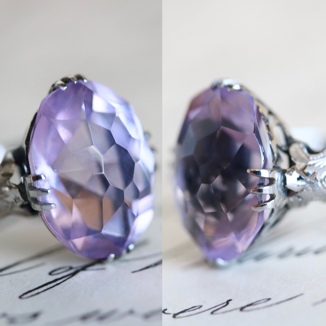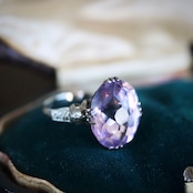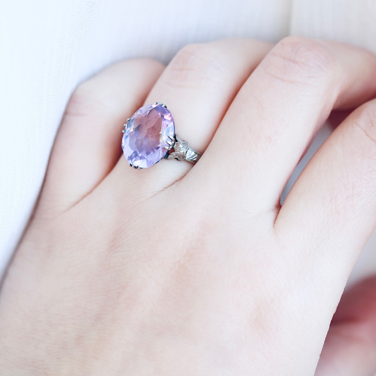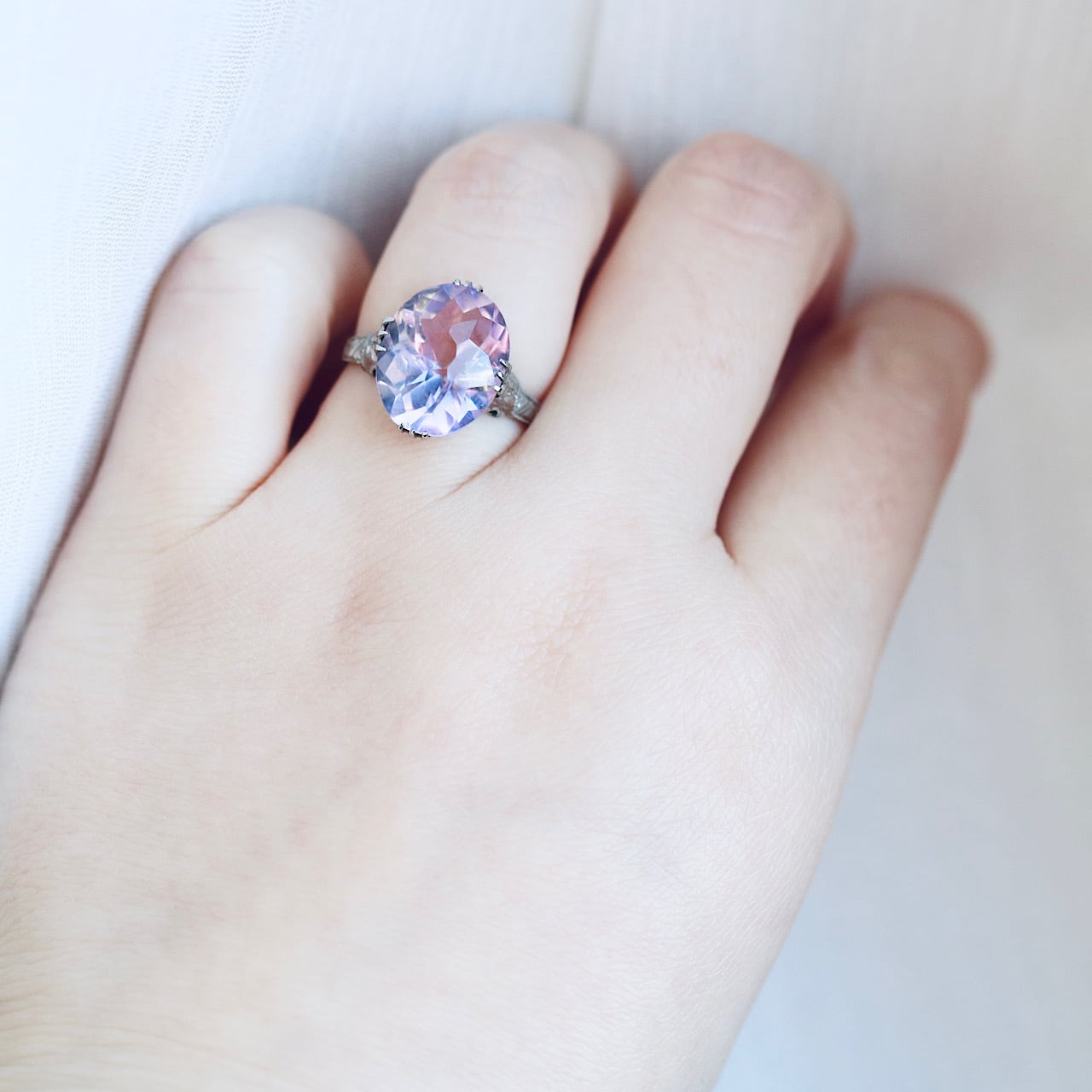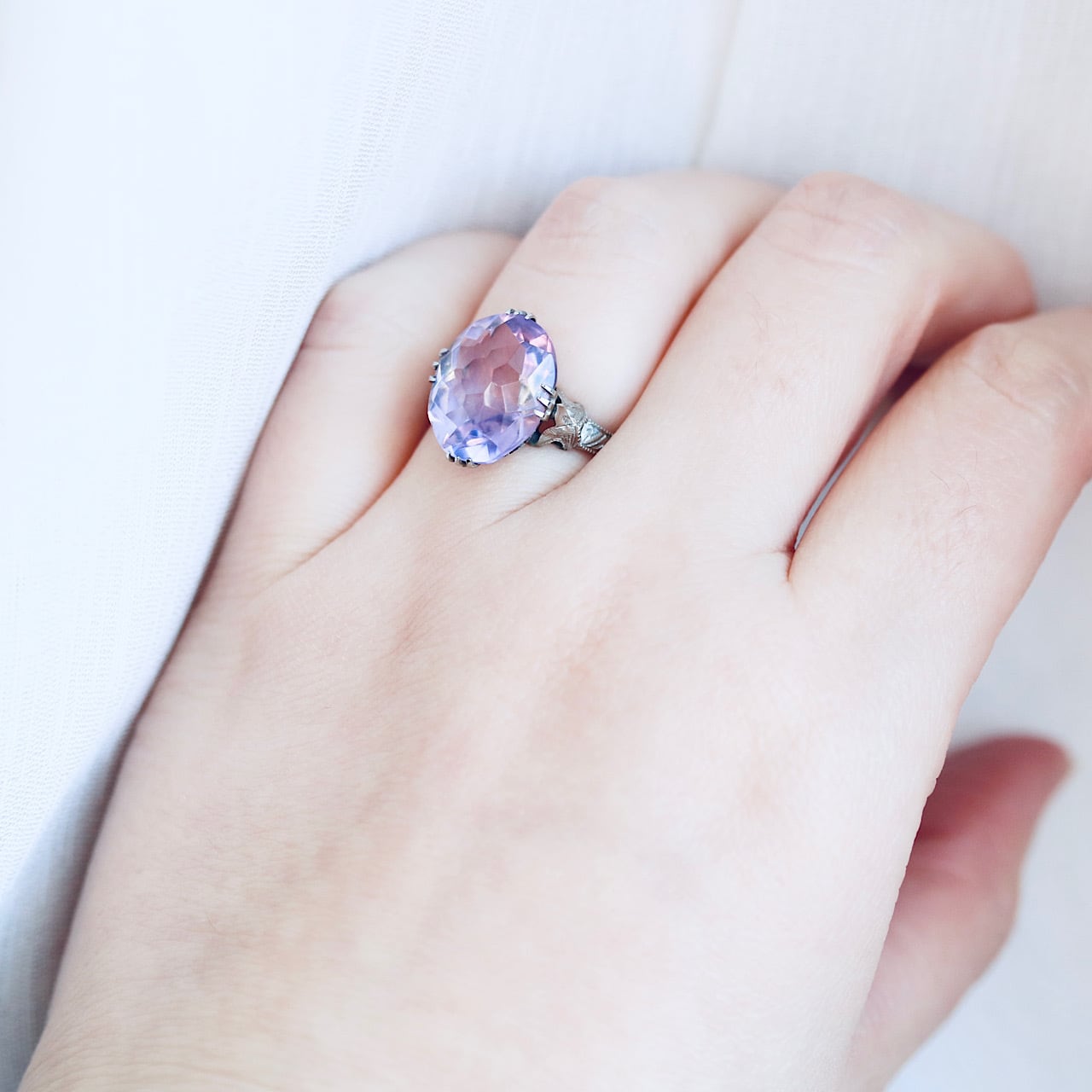 大きなオーバルカットの合成石は、透明感溢れる淡いラベンダーカラー。