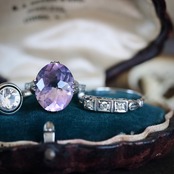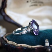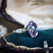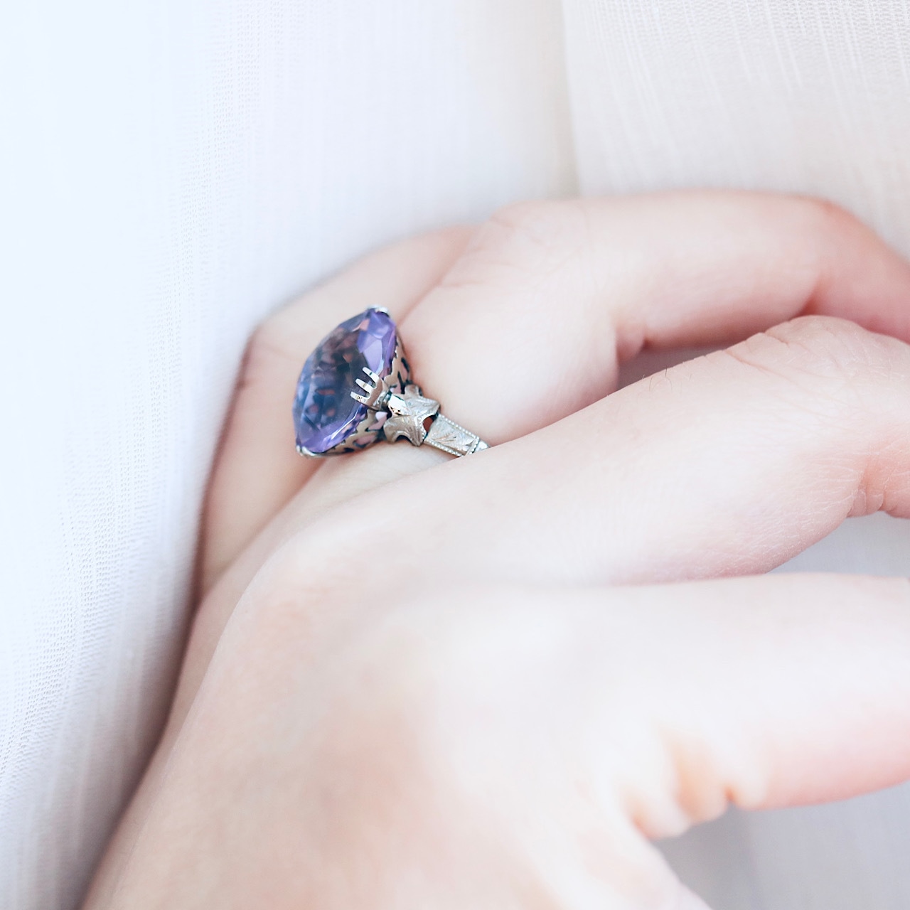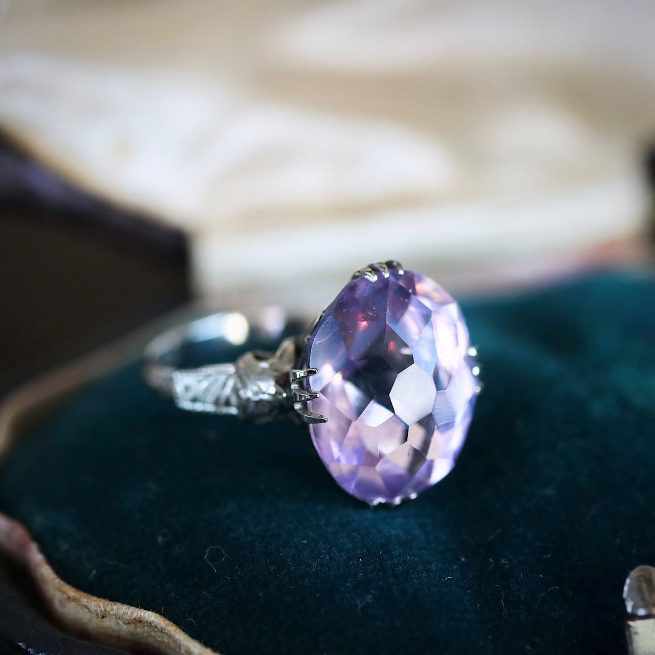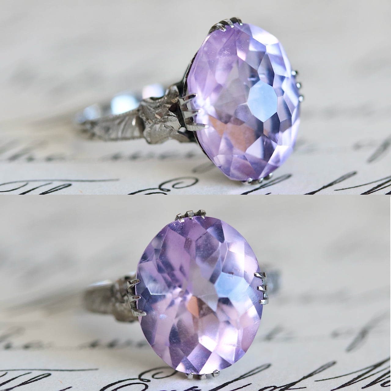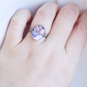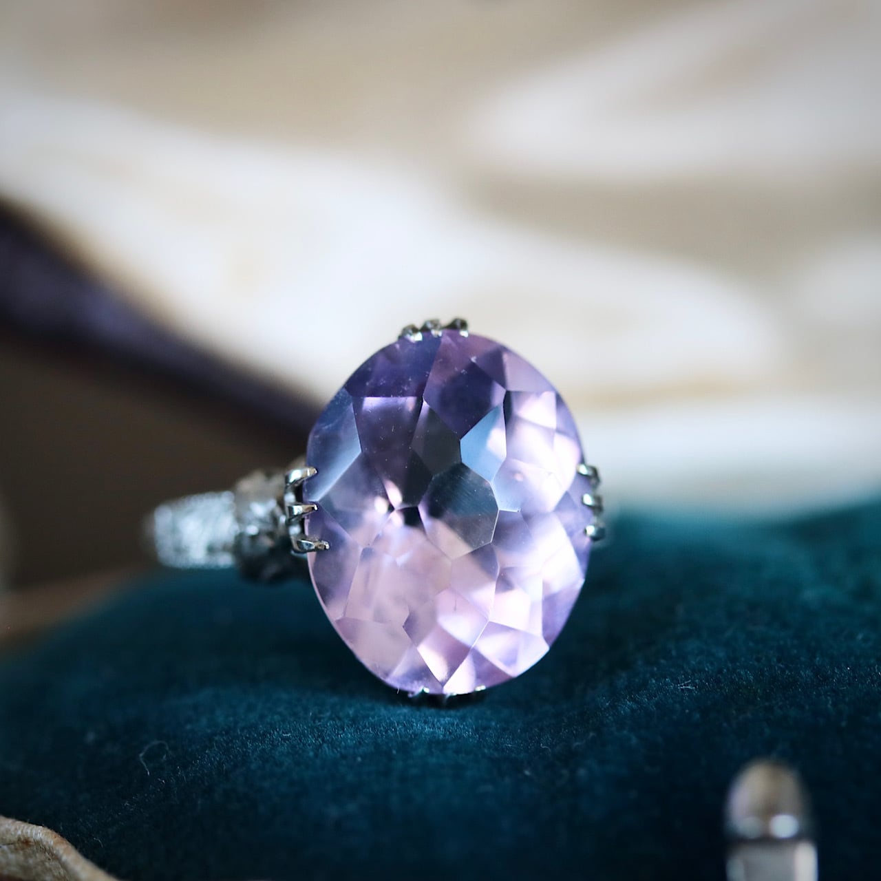 大きなオーバルカットの合成石は、透明感溢れる淡いラベンダーカラー。