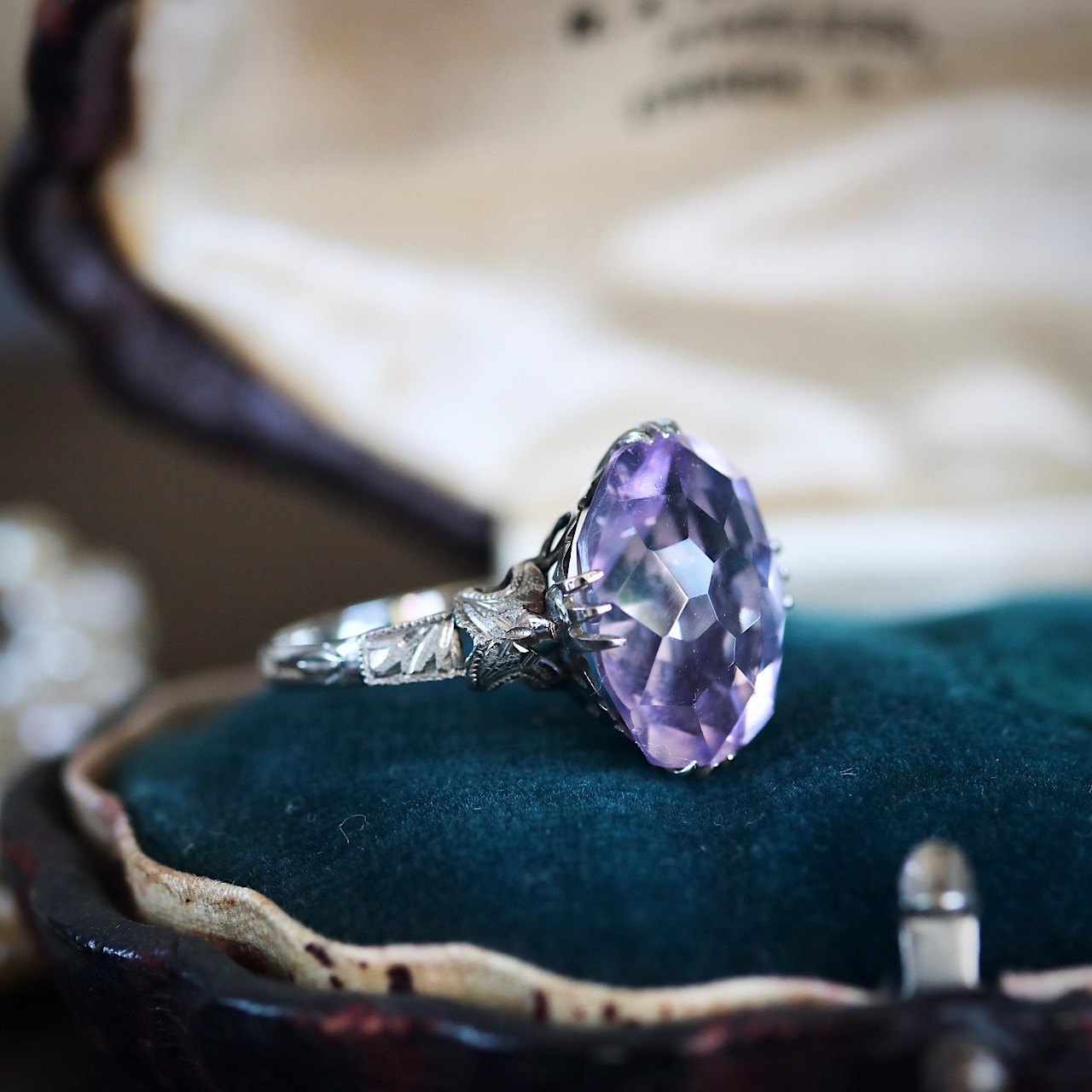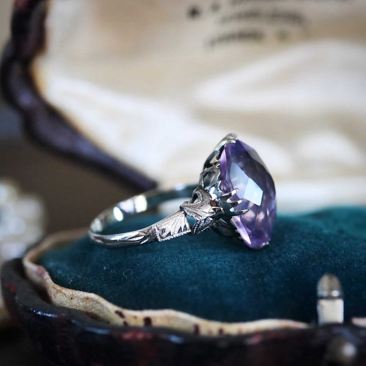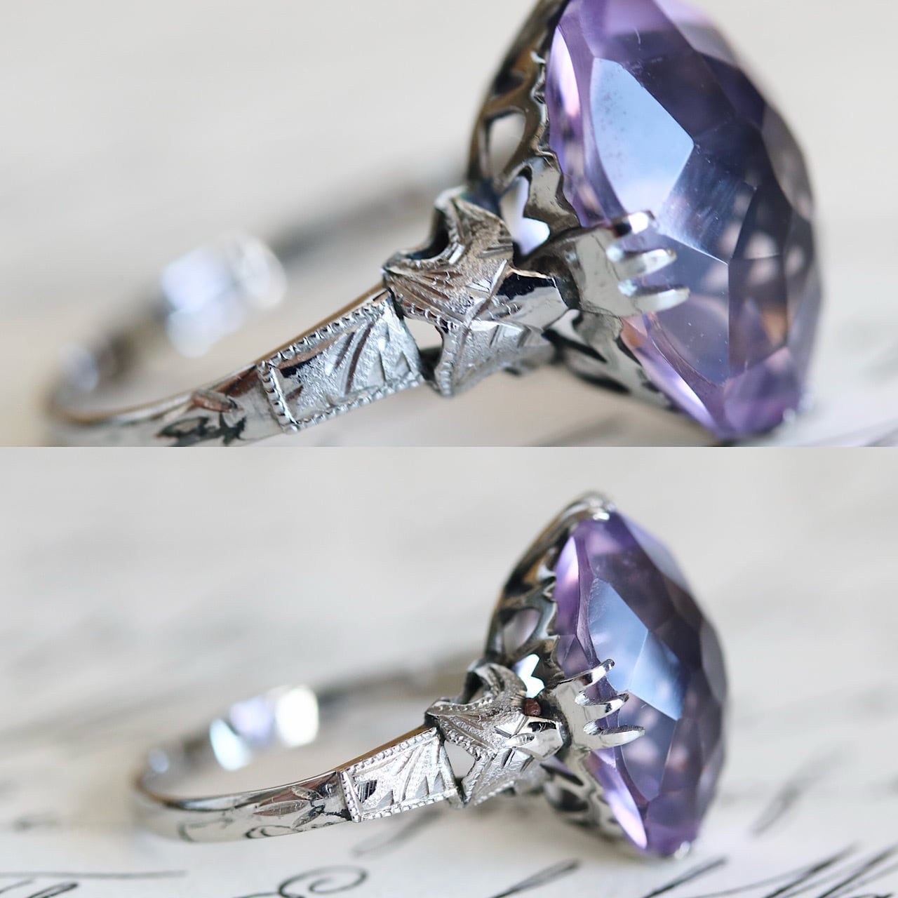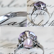 SPM刻印 サンプラチナ製 ラベンダーカラー合成石の和彫ヴィンテージリング。
