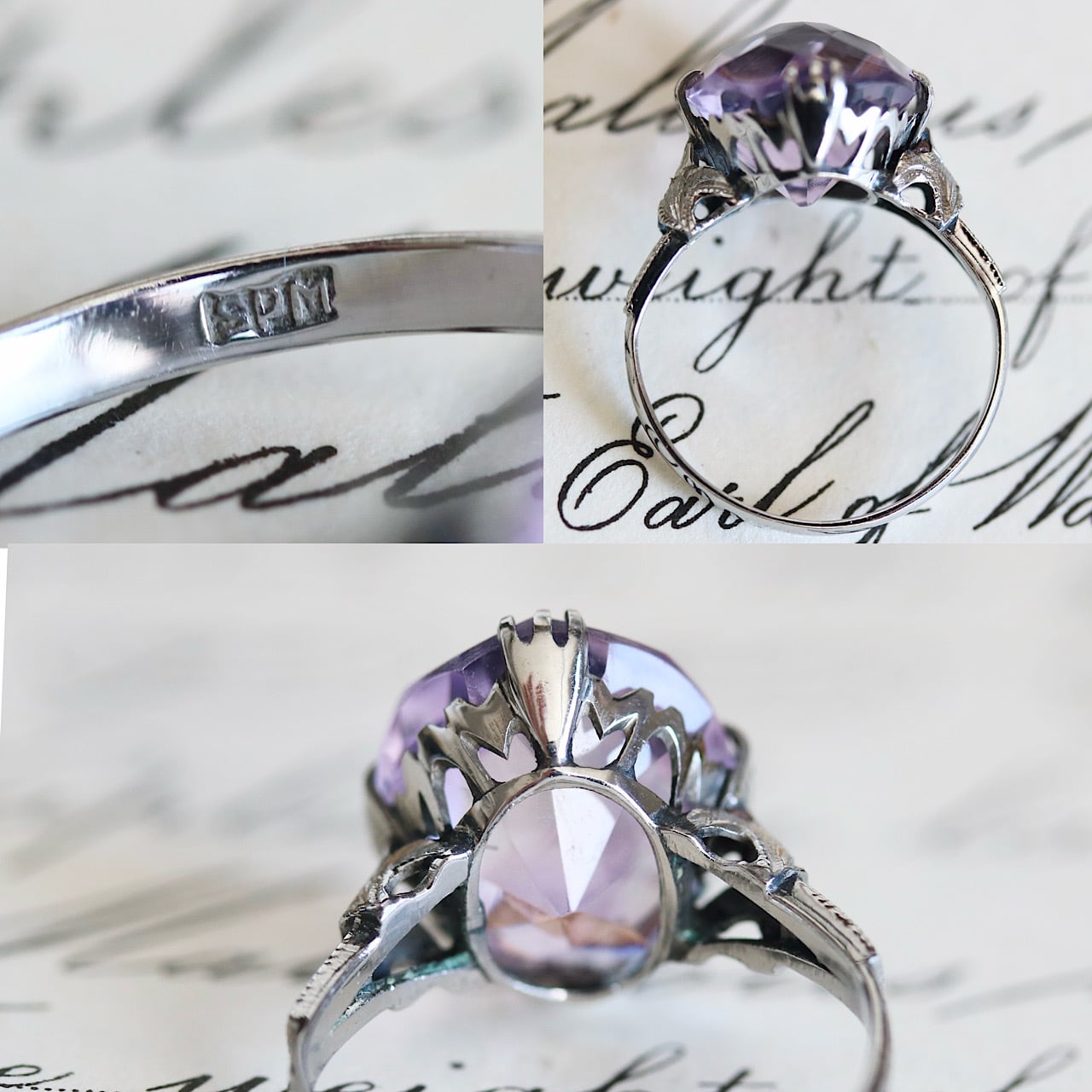 SPM刻印 サンプラチナ製 和彫 ラベンダーカラー合成石 ヴィンテージリング