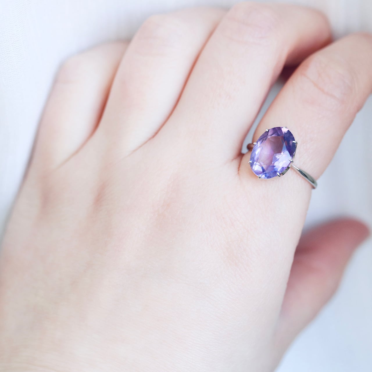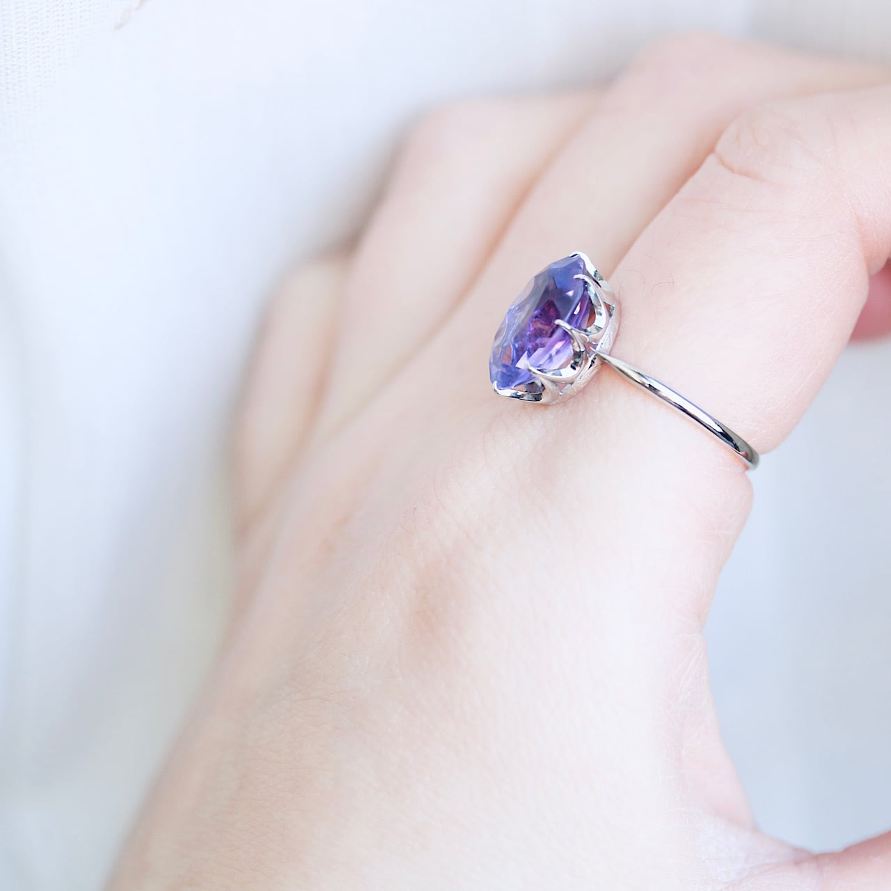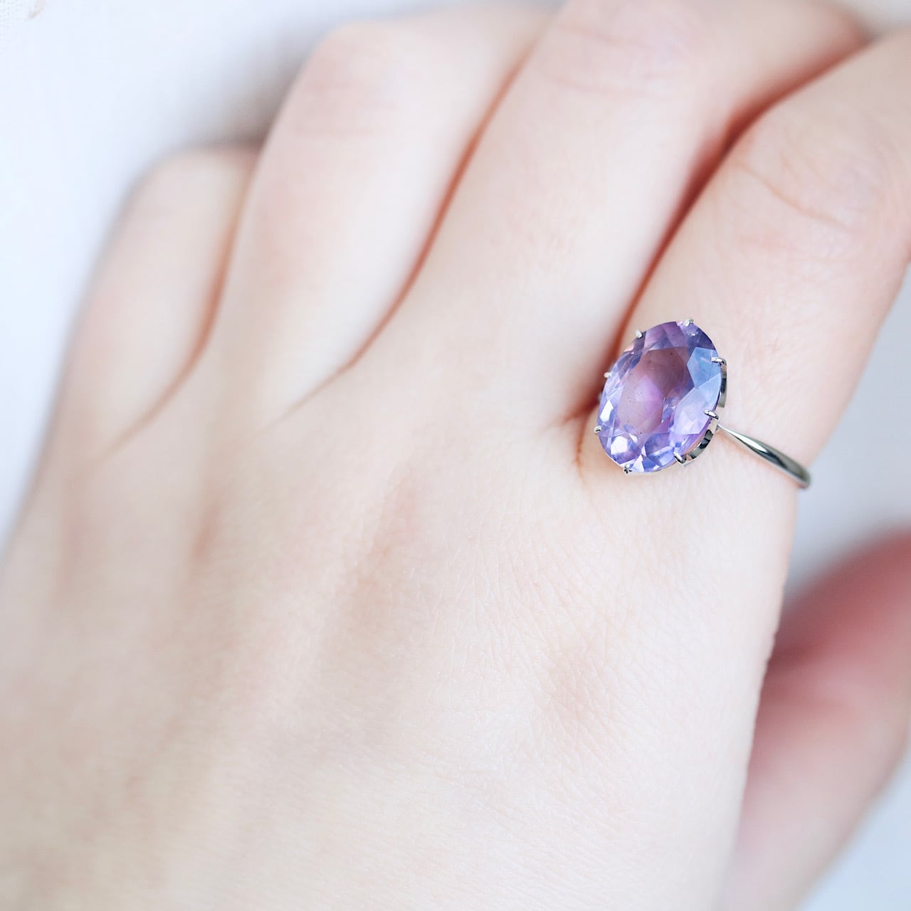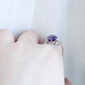 透明感のある、瑞々しい淡い藤色の天然アメジストと繊細な立爪の組み合わせが、宝石の美しさはもちろん、シンプルなデザインながらもさり気ないお洒落さを感じさせてくれる逸品です。