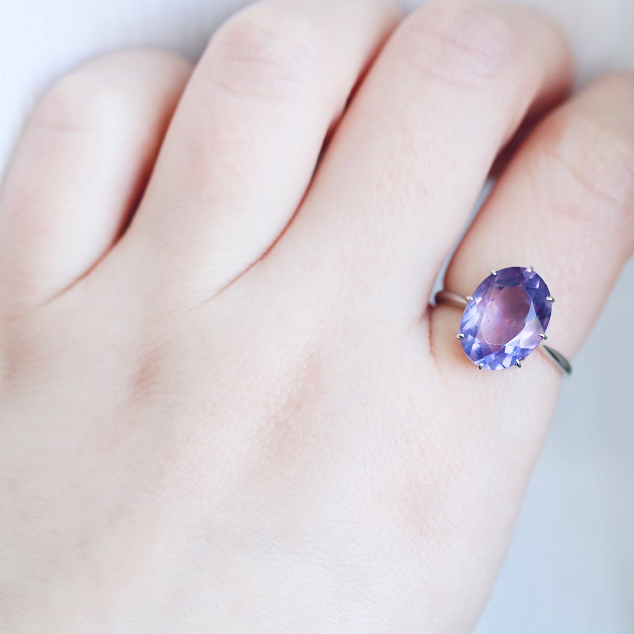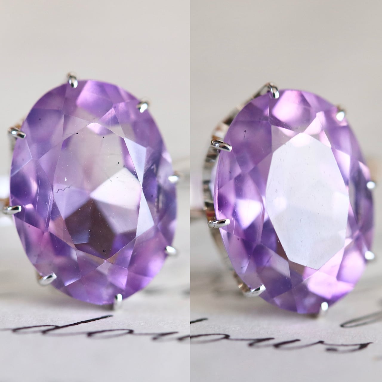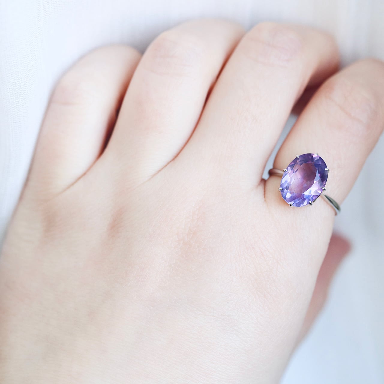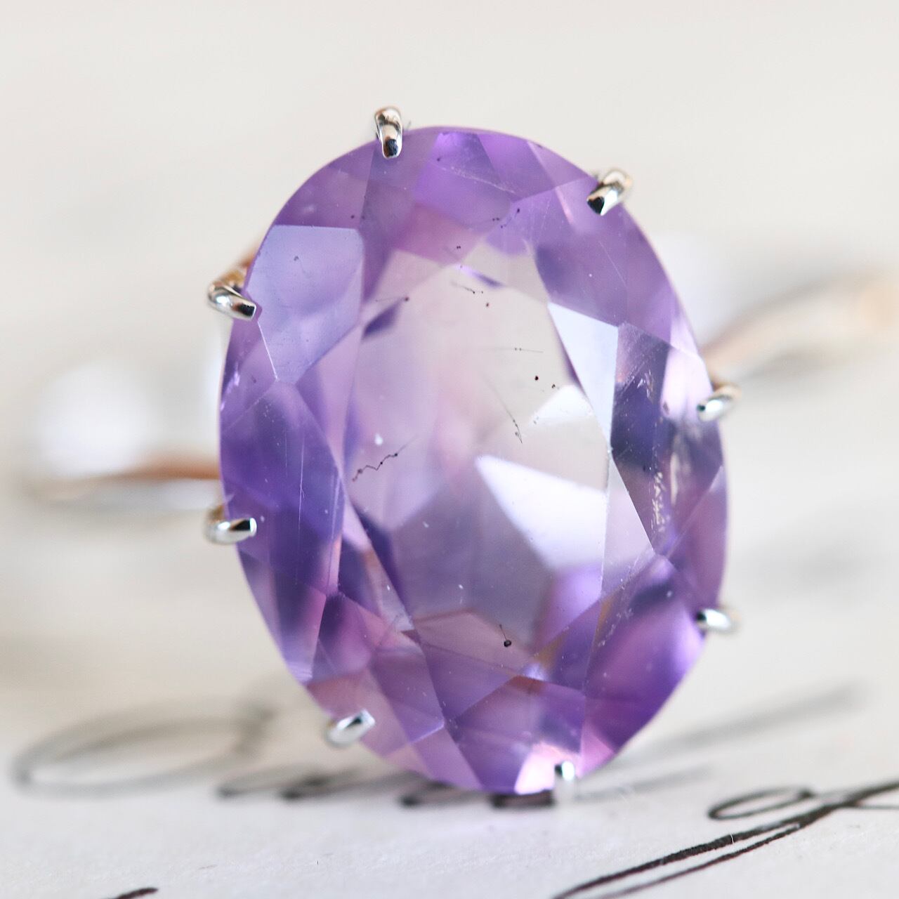透明感のある、瑞々しい淡い藤色の天然アメジストと繊細な立爪の組み合わせが、宝石の美しさはもちろん、シンプルなデザインながらもさり気ないお洒落さを感じさせてくれる逸品です。