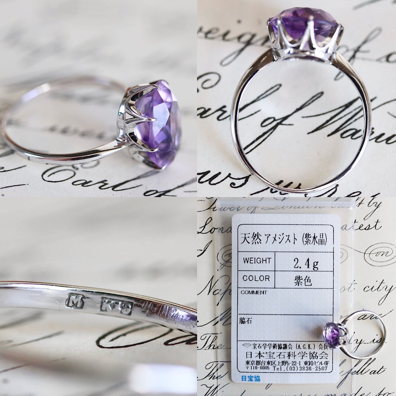 【貴重】オールド御木本 K18(WG)天然アメジストのクラウン型立爪セッティング ヴィンテージリング ソーティングメモ付