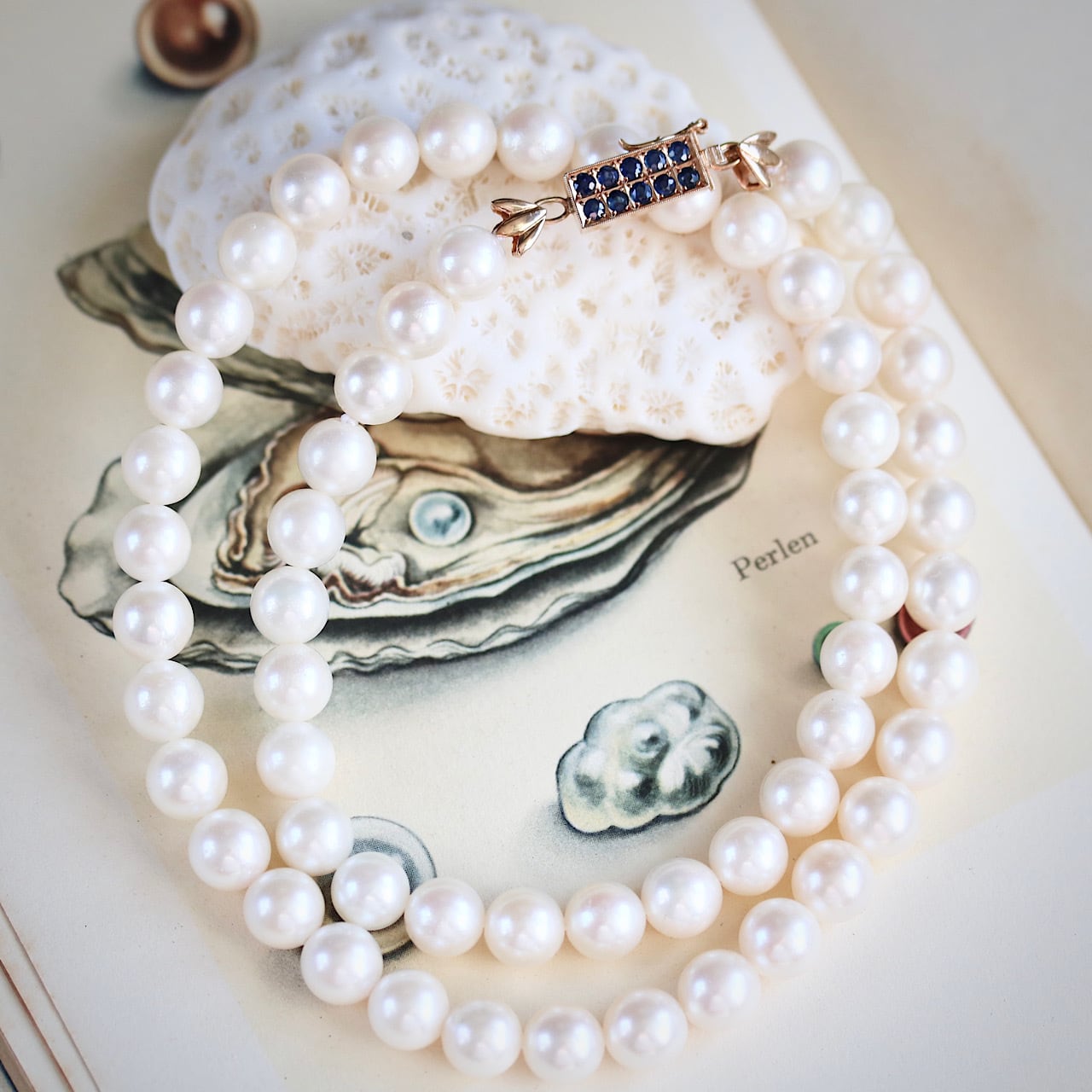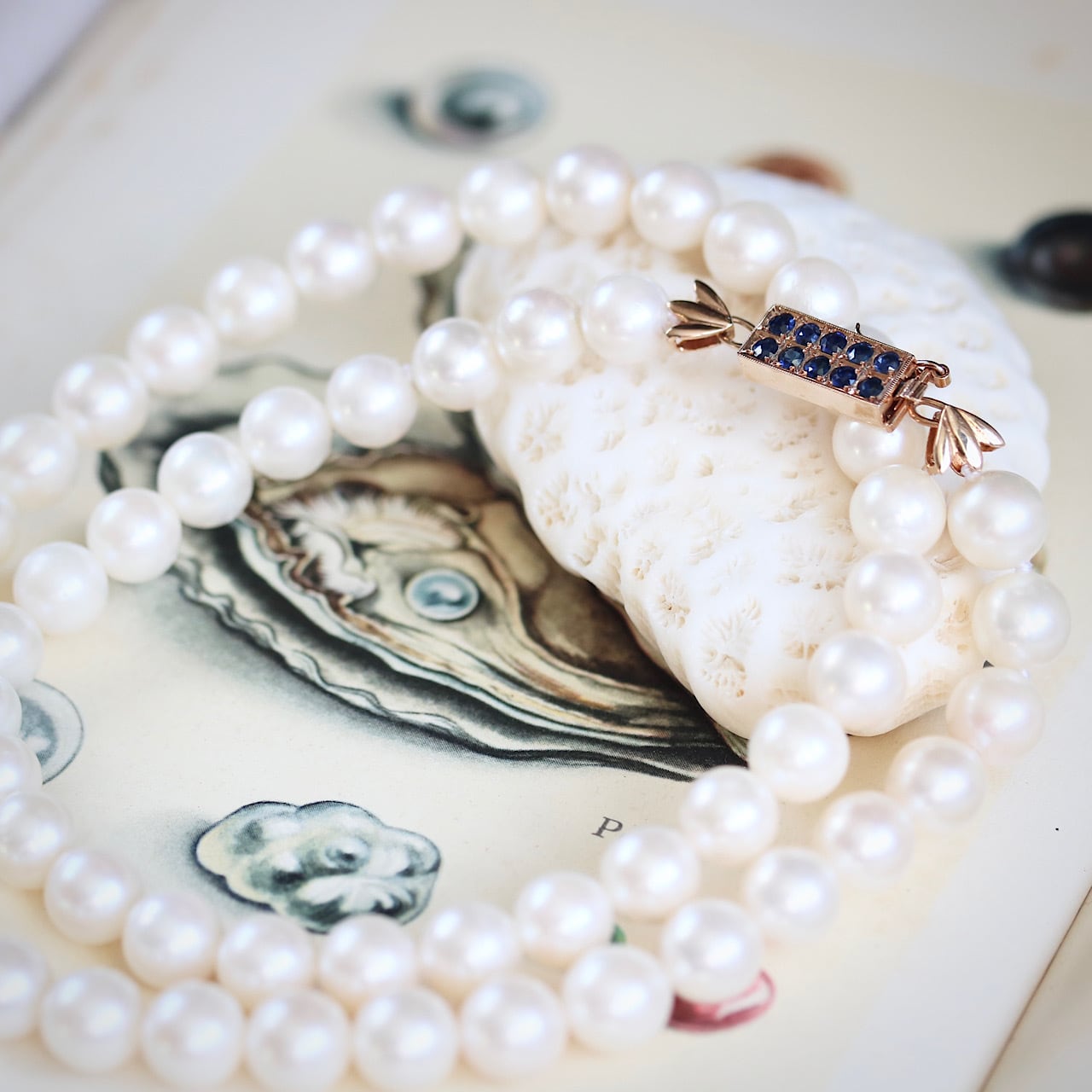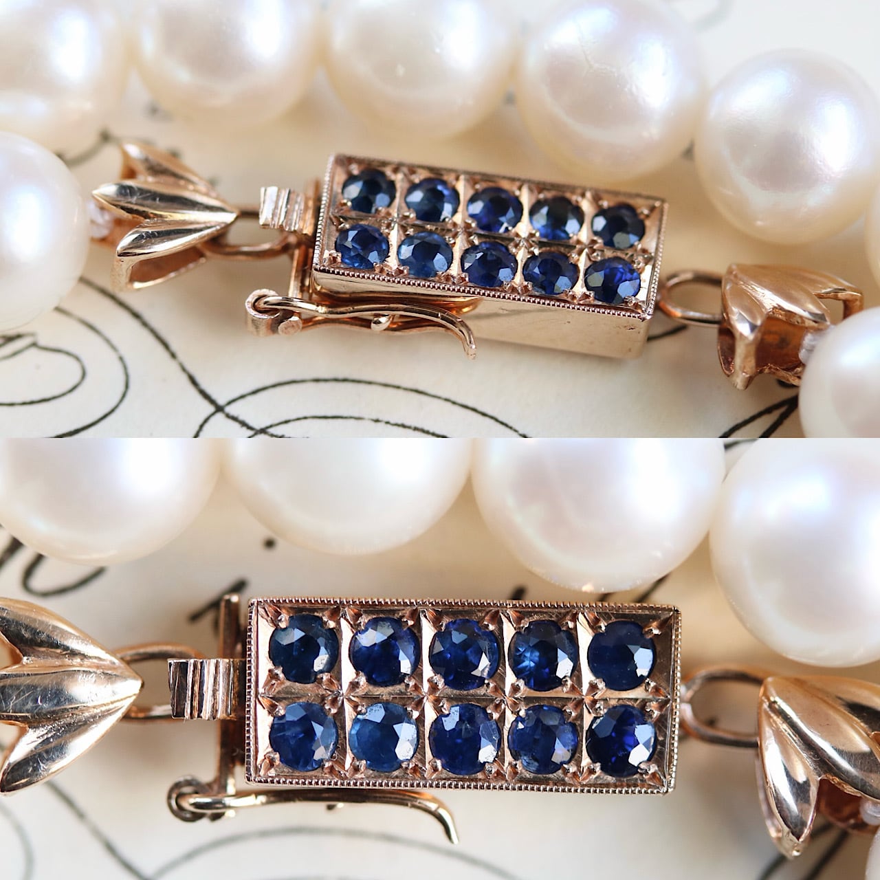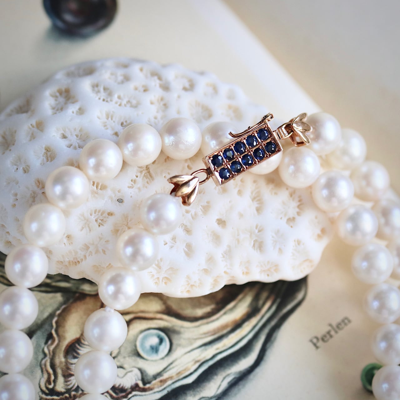 クラシックなパールネックレスに深いブルーの天然サファイアがアクセントになっており、アールデコの意匠を凝らした14金製のクラスプが個性的な逸品です。