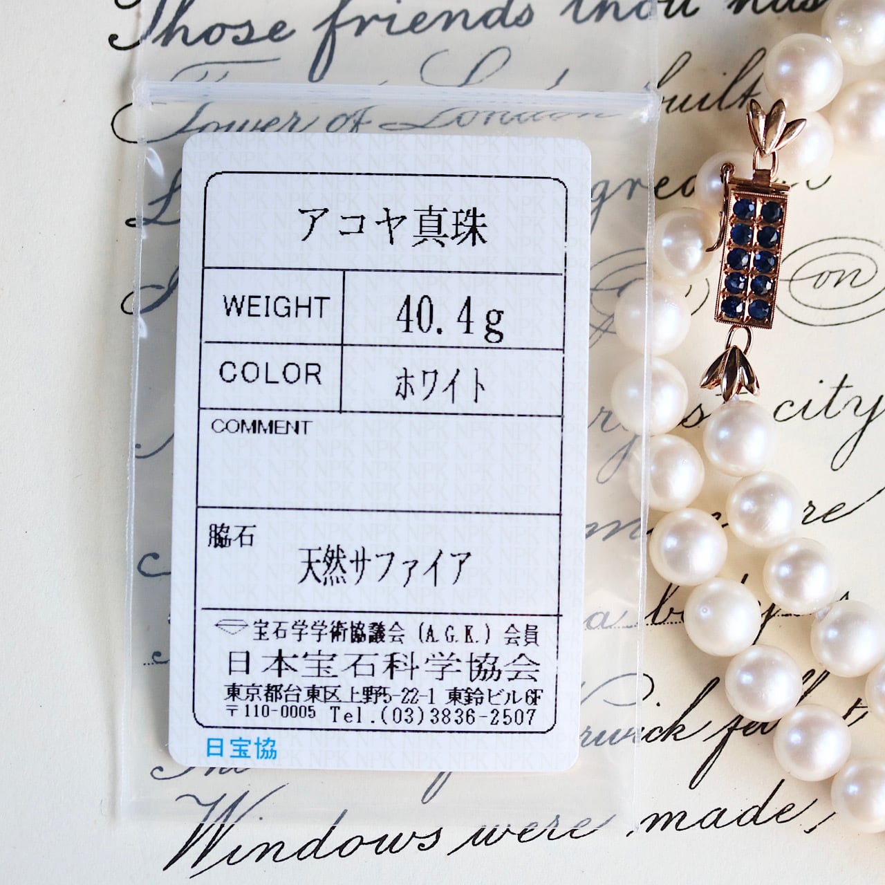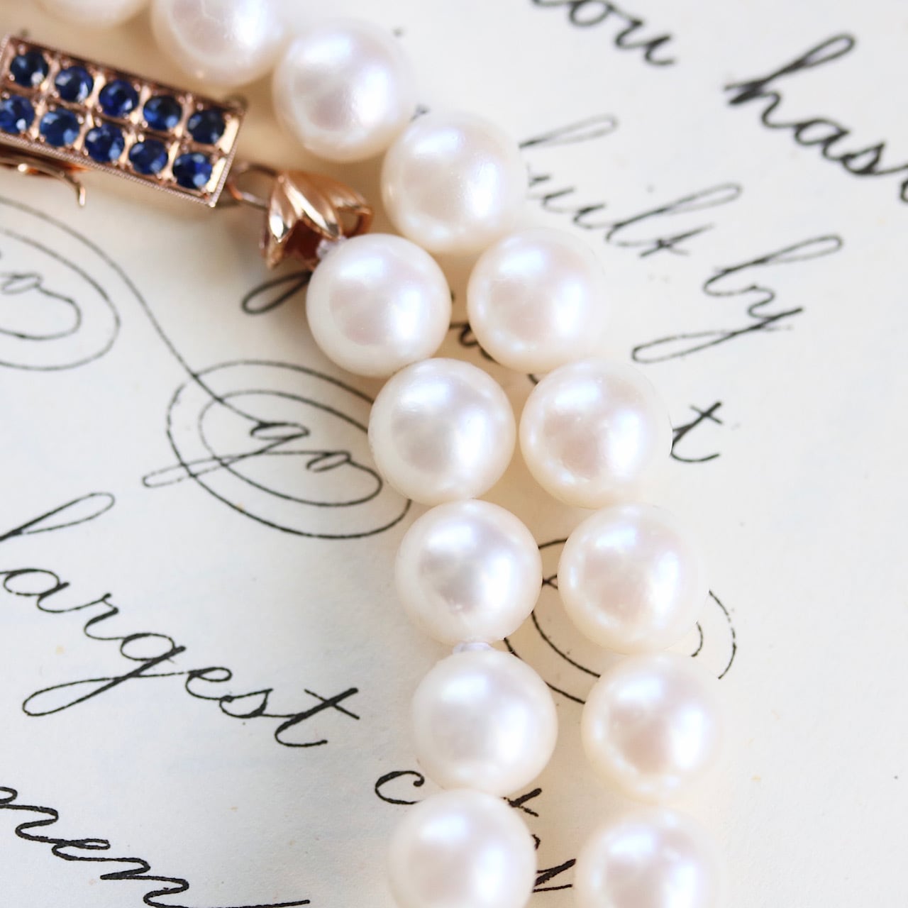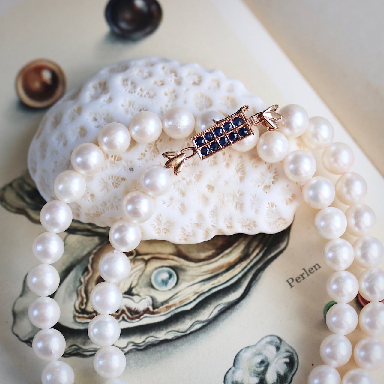 クラシックなパールネックレスに深いブルーの天然サファイアがアクセントになっており、アールデコの意匠を凝らした14金製のクラスプが個性的な逸品です。