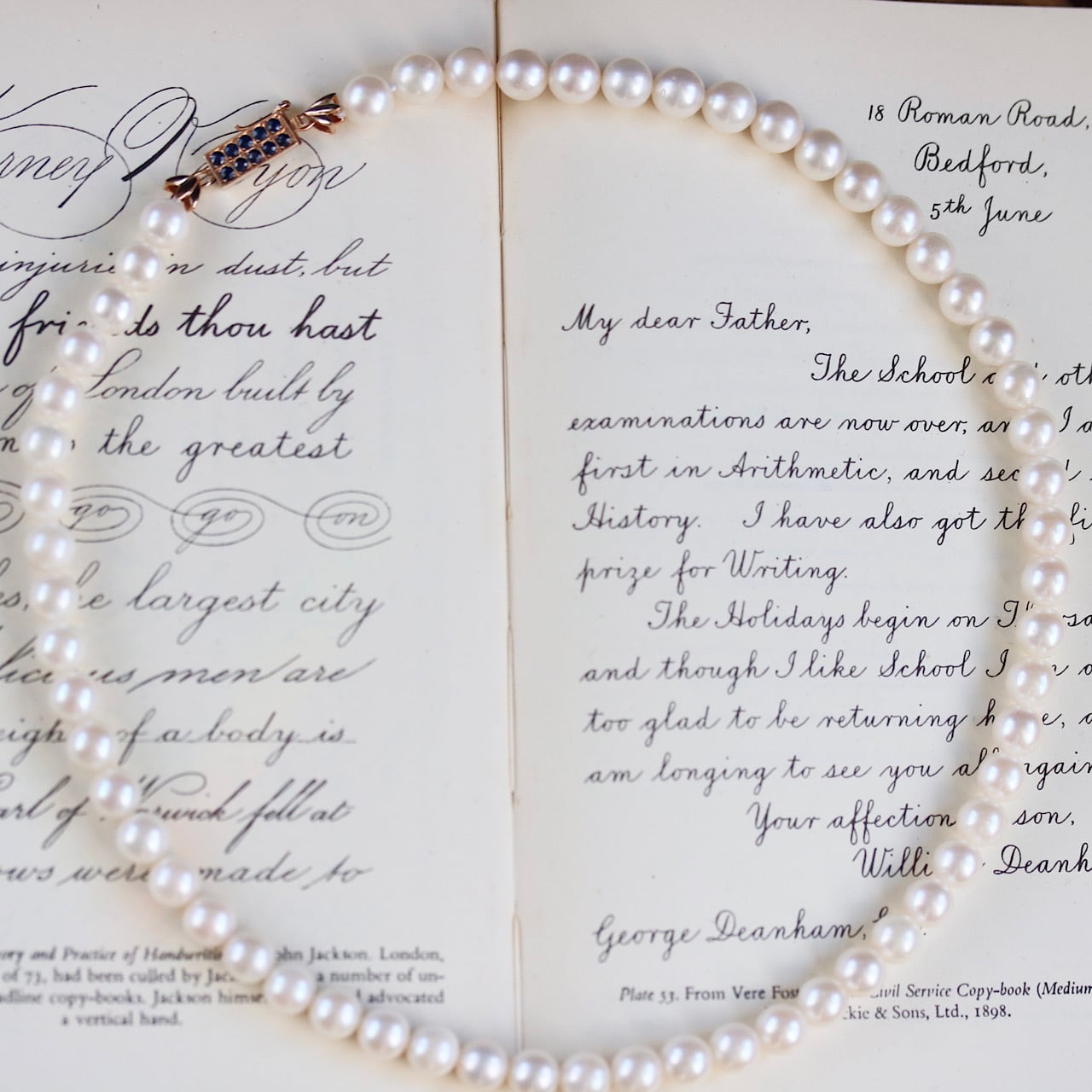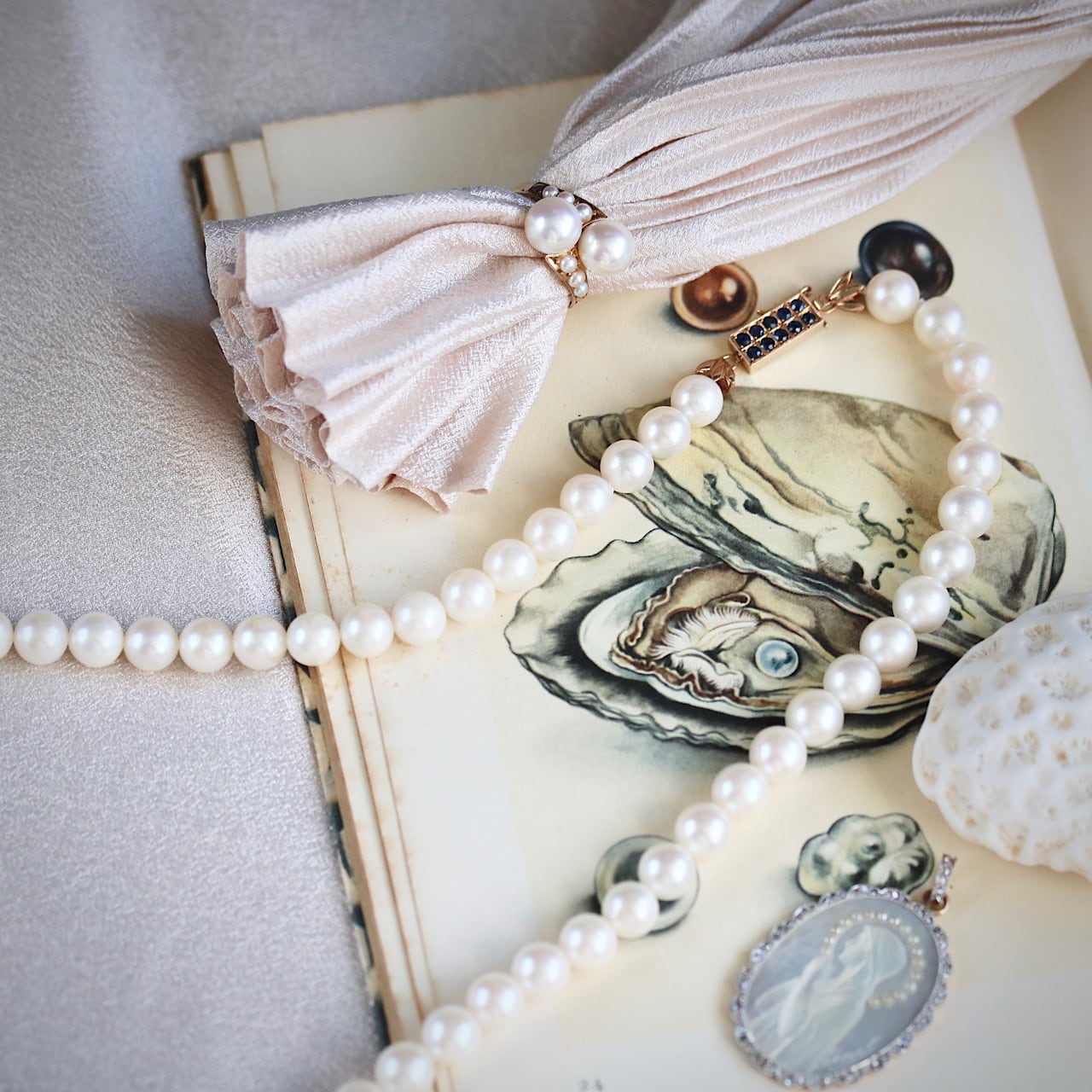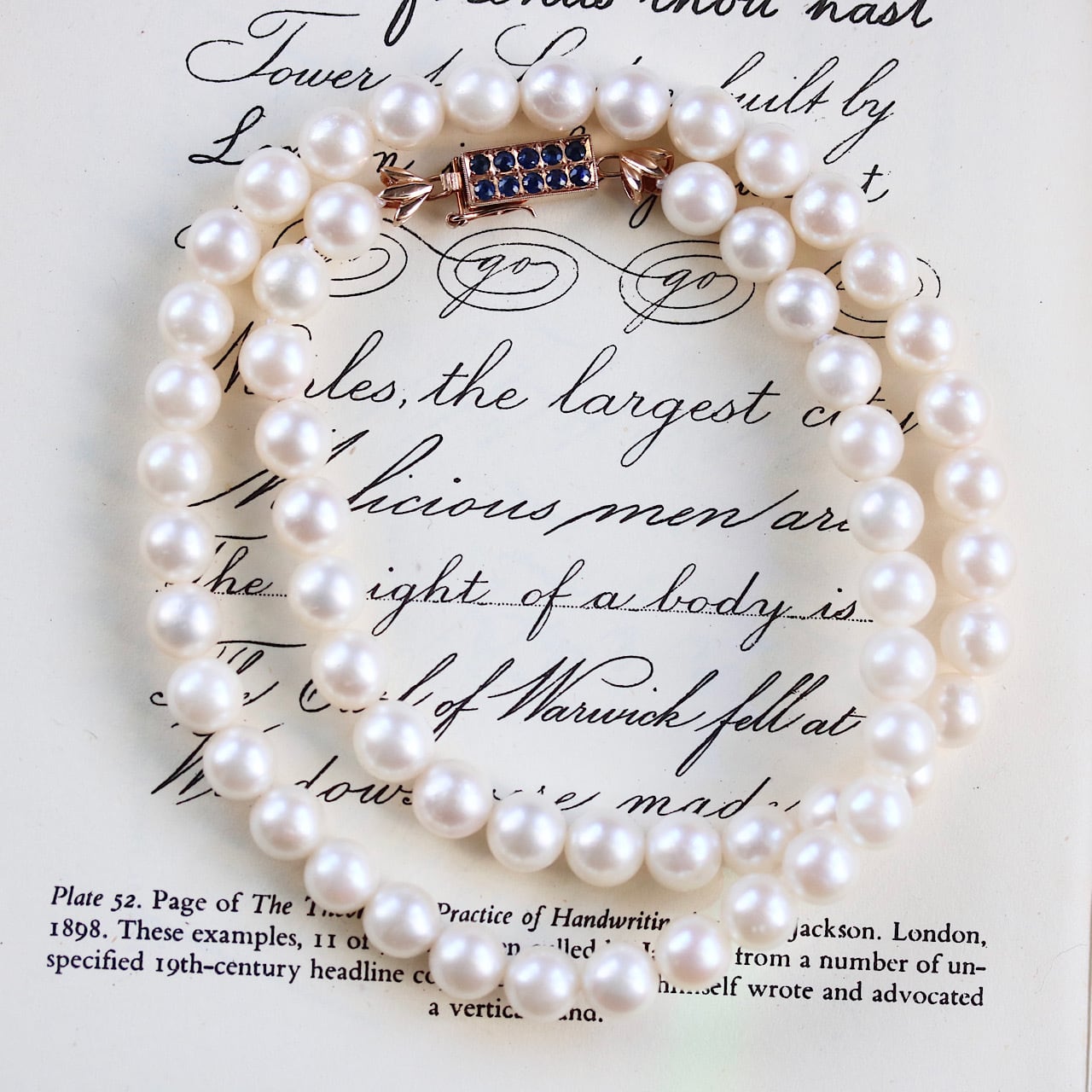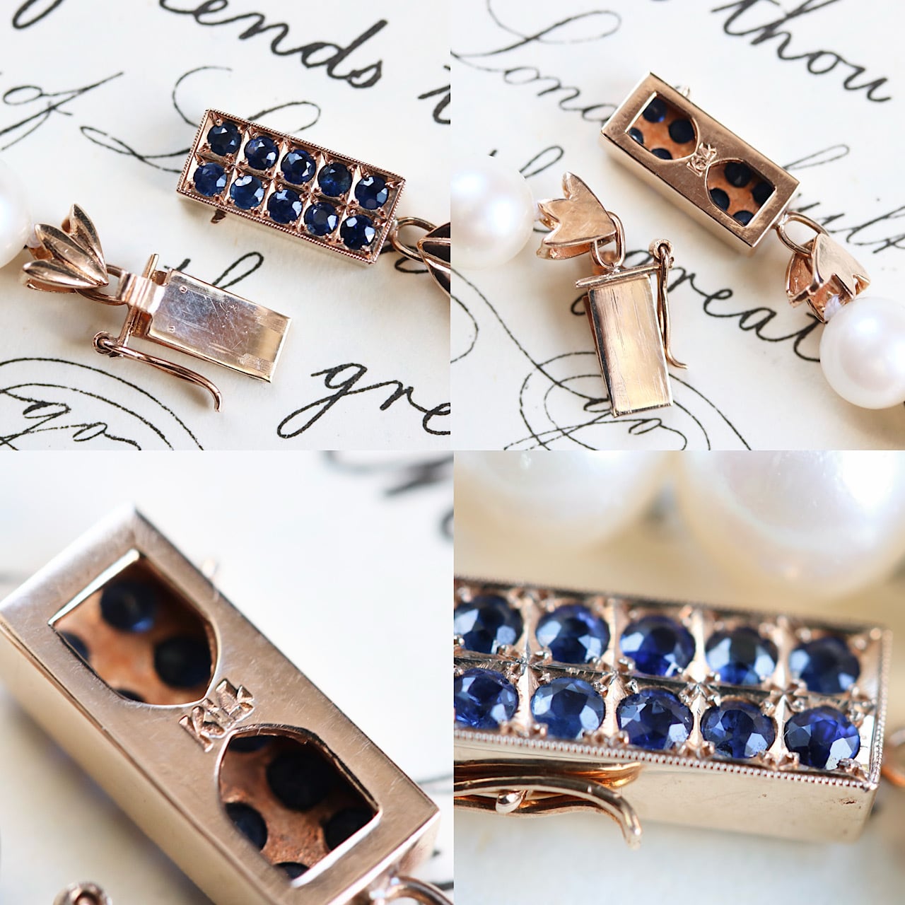 クラシックなパールネックレスに深いブルーの天然サファイアがアクセントになっており、アールデコの意匠を凝らした14金製のクラスプが個性的な逸品です。