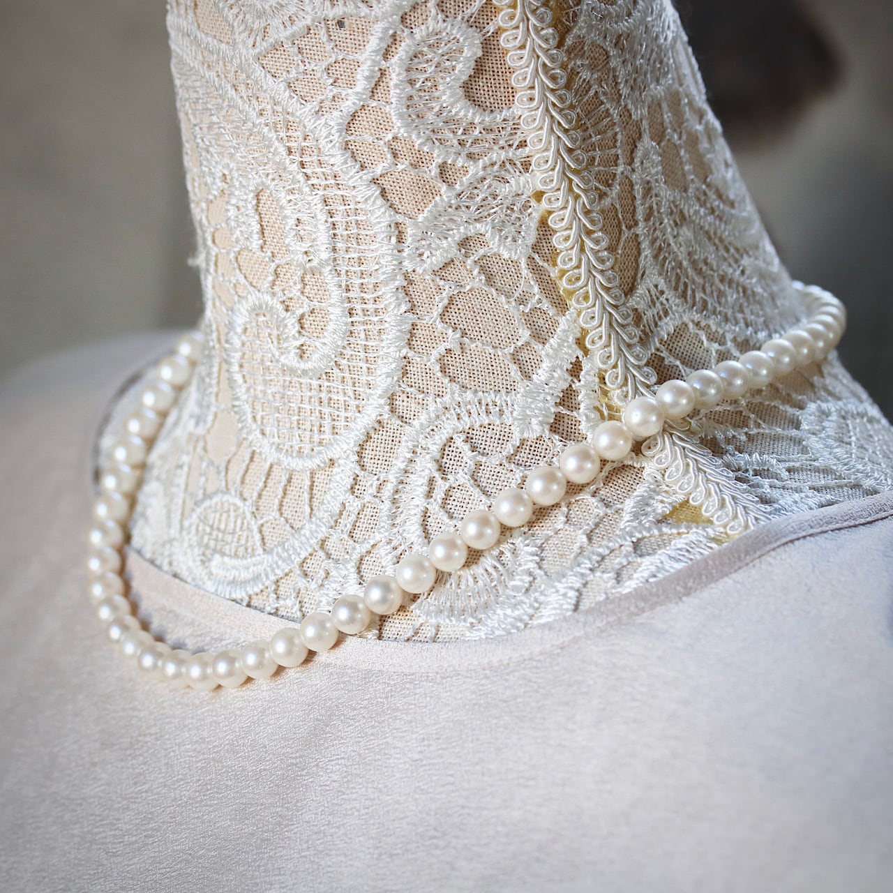 淡いクリーム色の真珠にほんのりピンク色の干渉色が見られる、柔らかな輝きの美しいあこや真珠が使用されたパールネックレス。