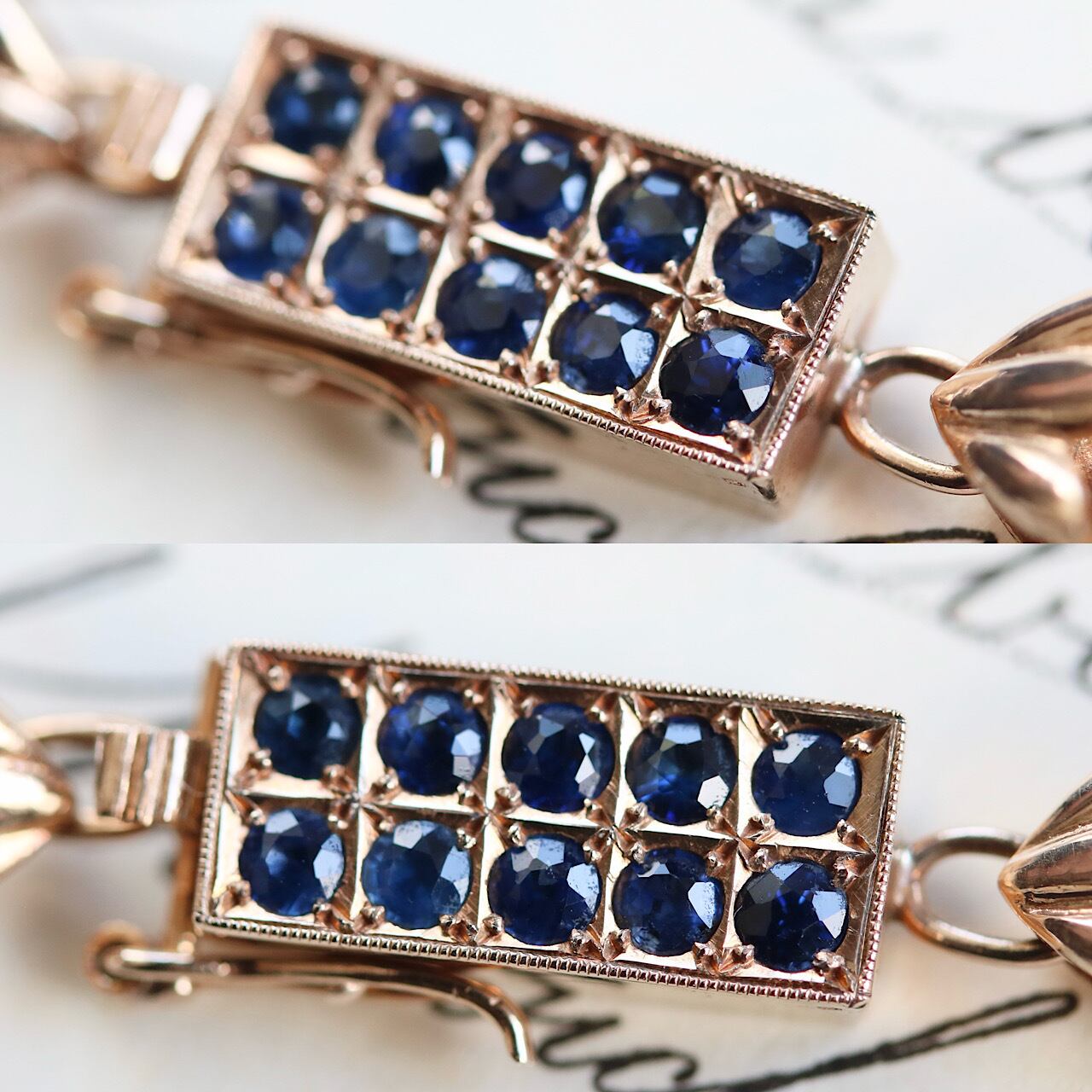 クラスプの四角い枠の中には、深い海を思わせる天然サファイアが贅沢に敷き詰められています。