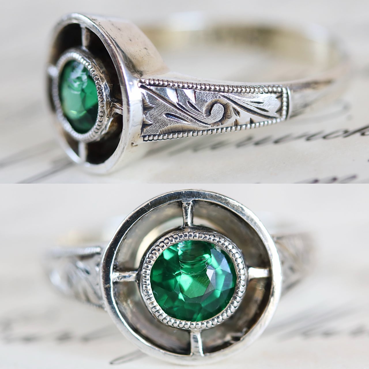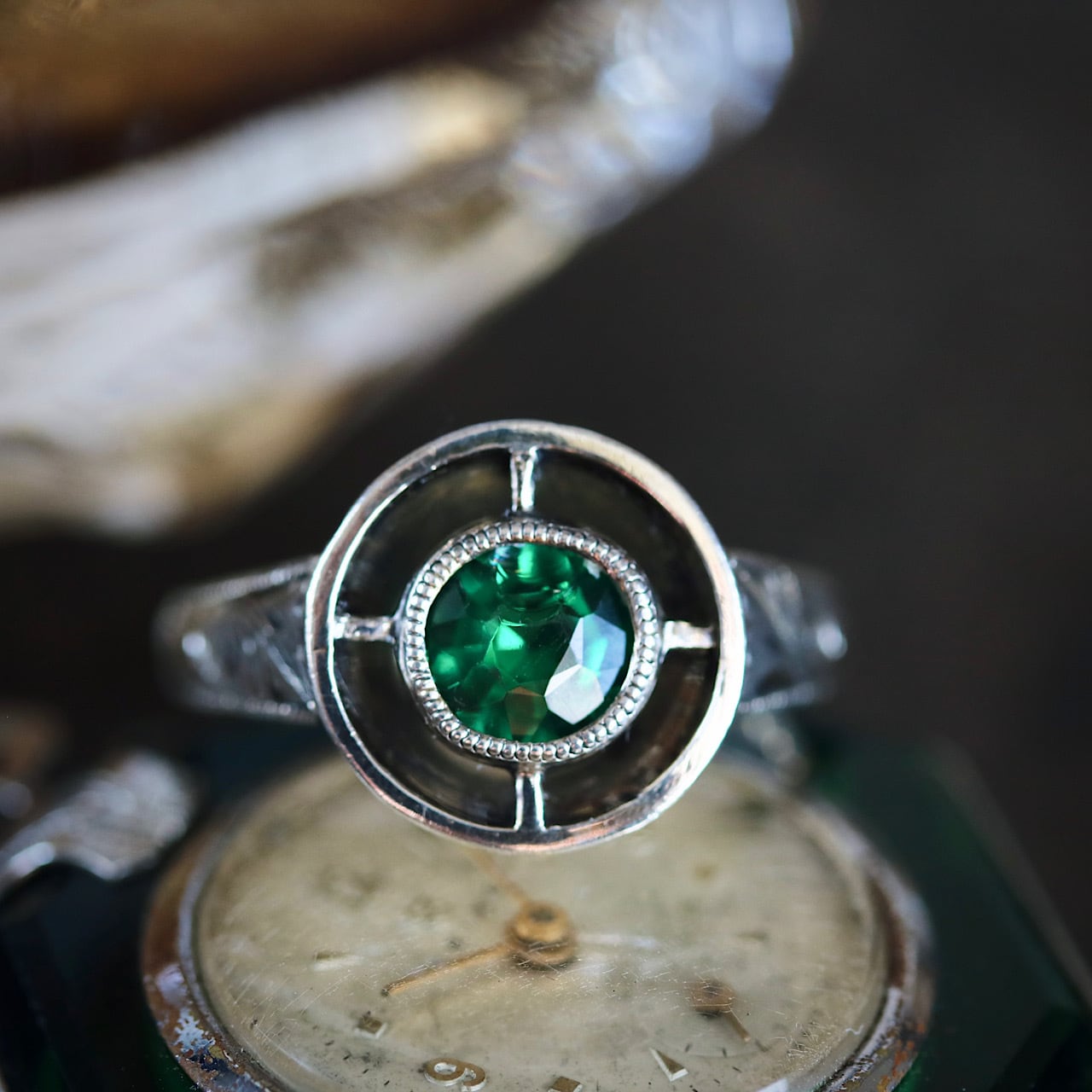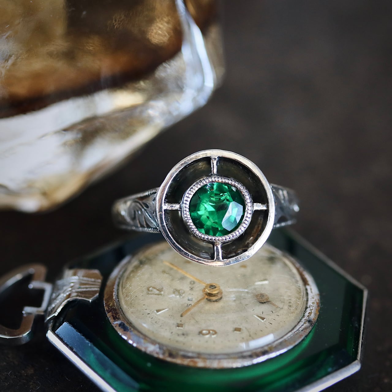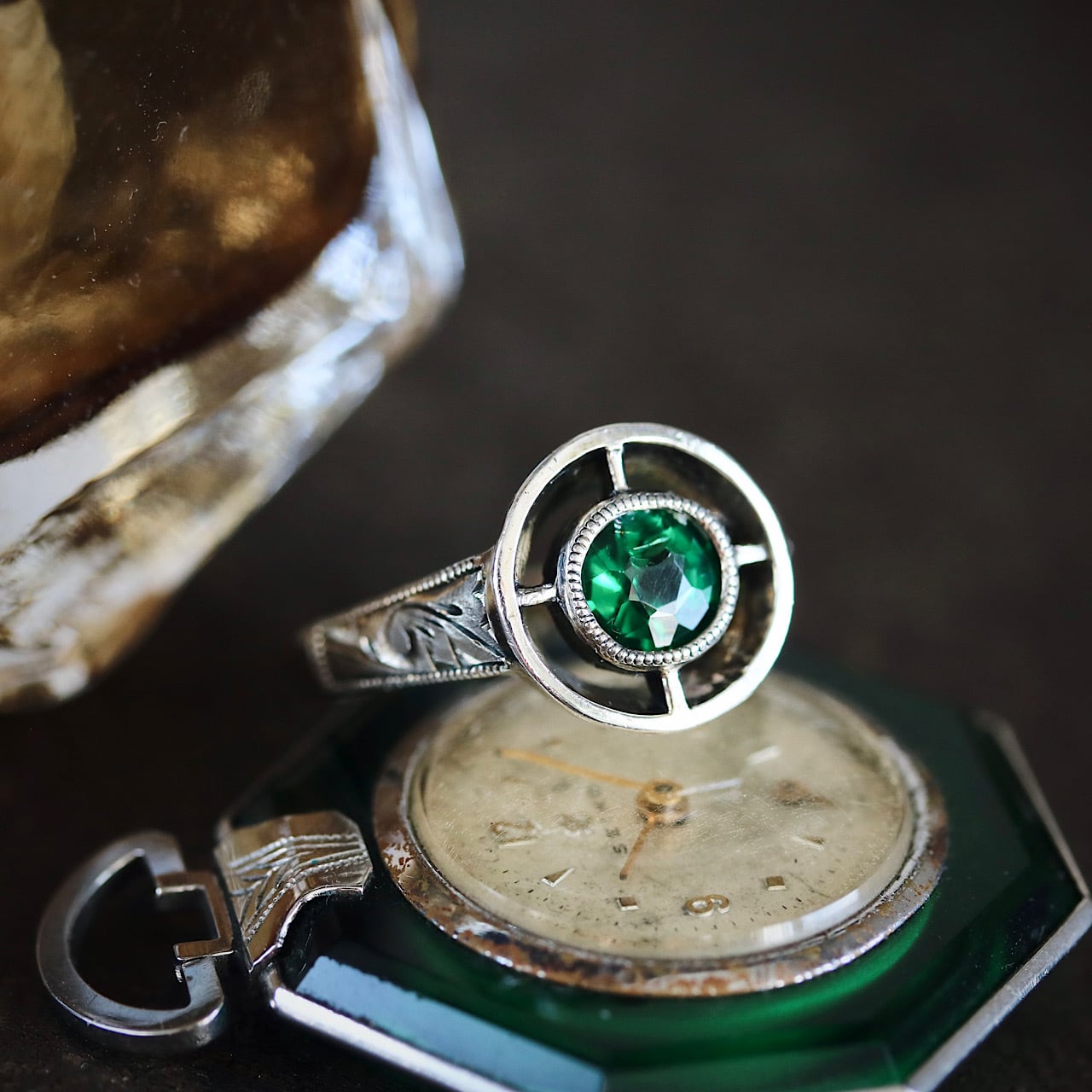 シルバーの地金にエメラルドカラーの色硝子が映える、どこかノスタルジックな佇まいのヴィンテージリング。