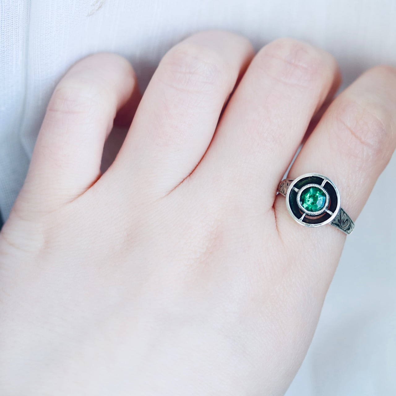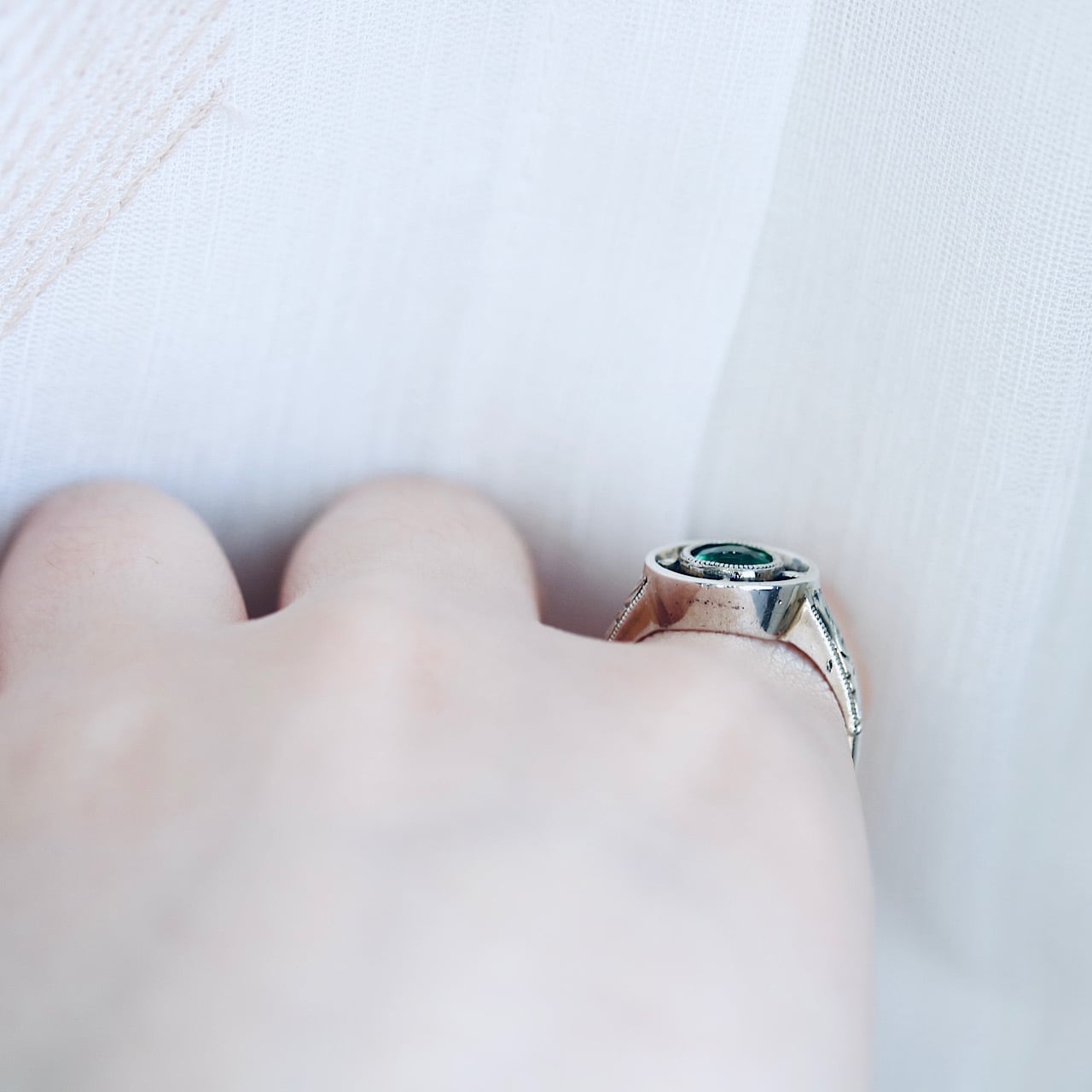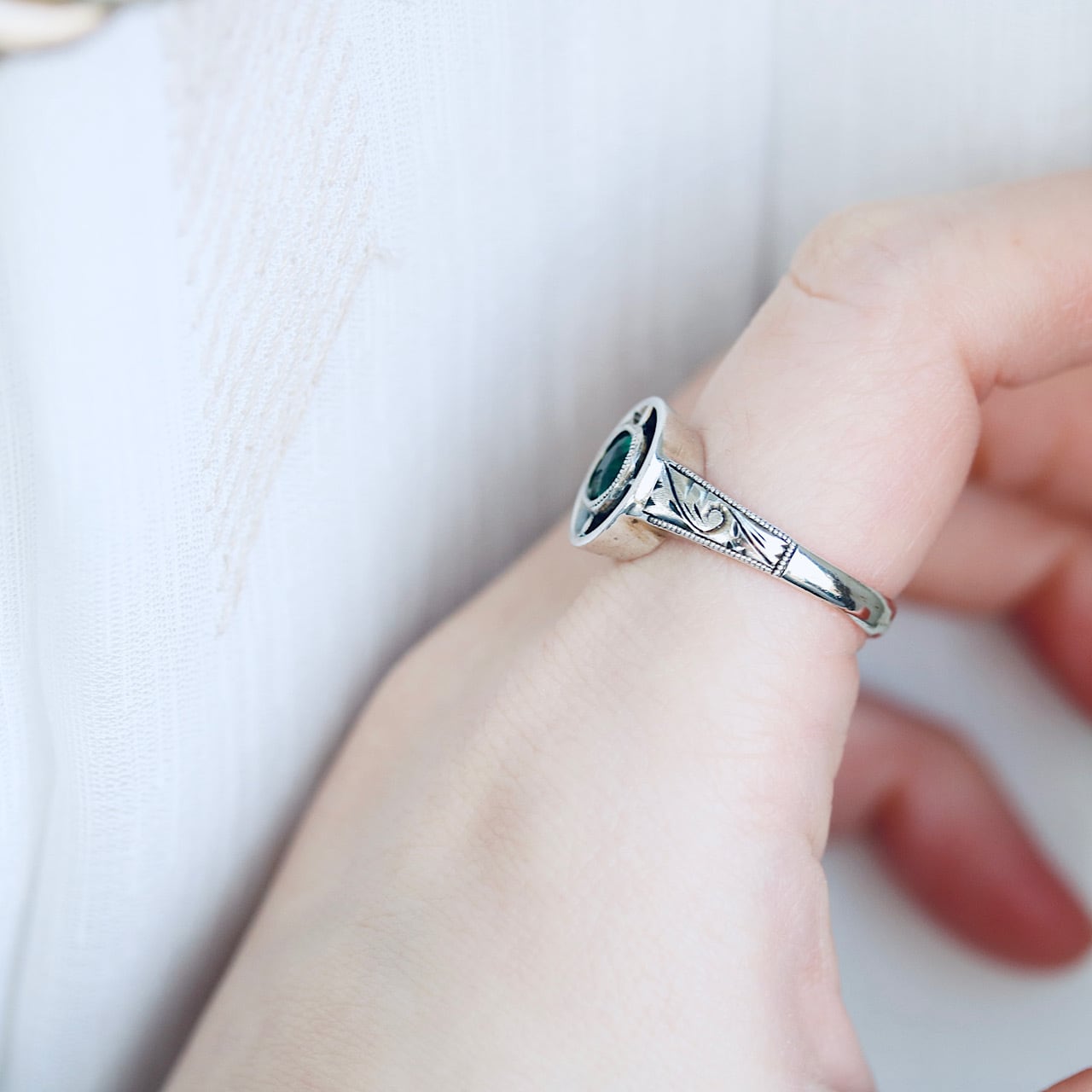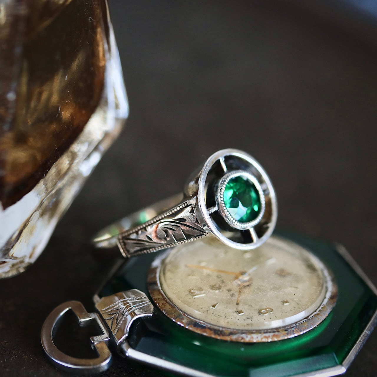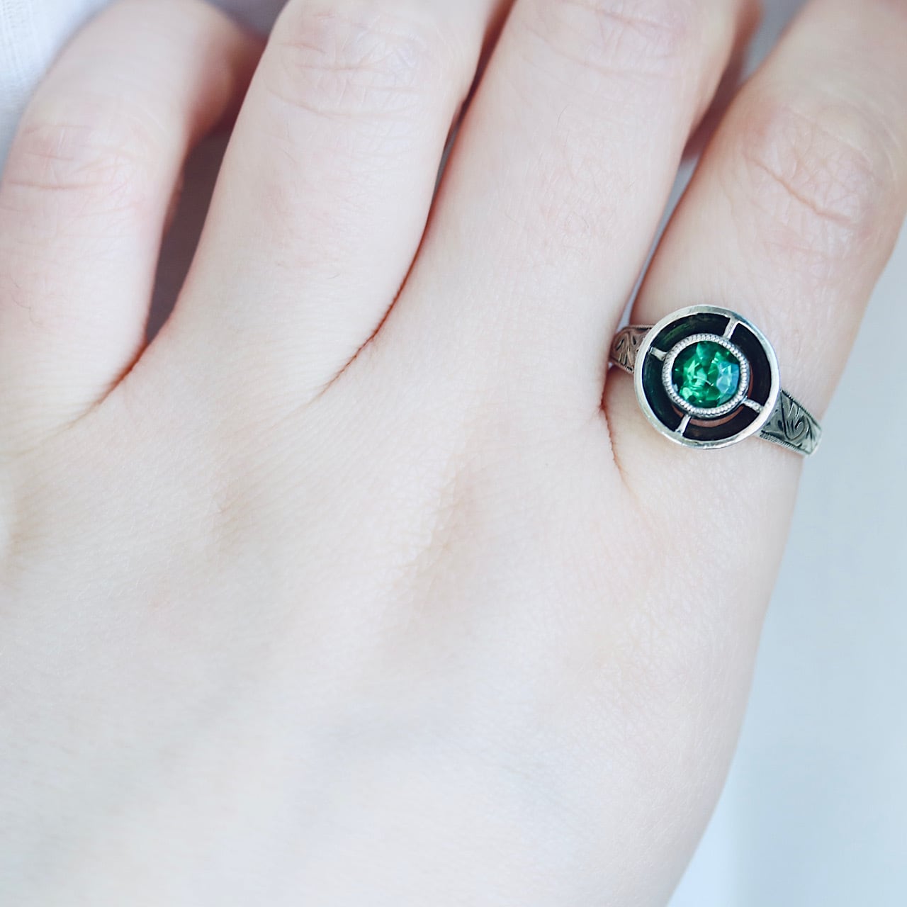 シルバーの地金にエメラルドカラーの色硝子が映える、どこかノスタルジックな佇まいのヴィンテージリング。