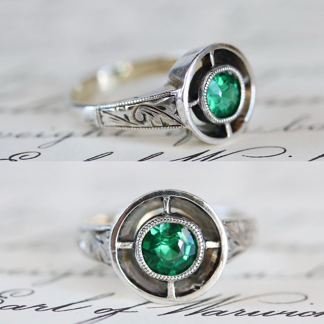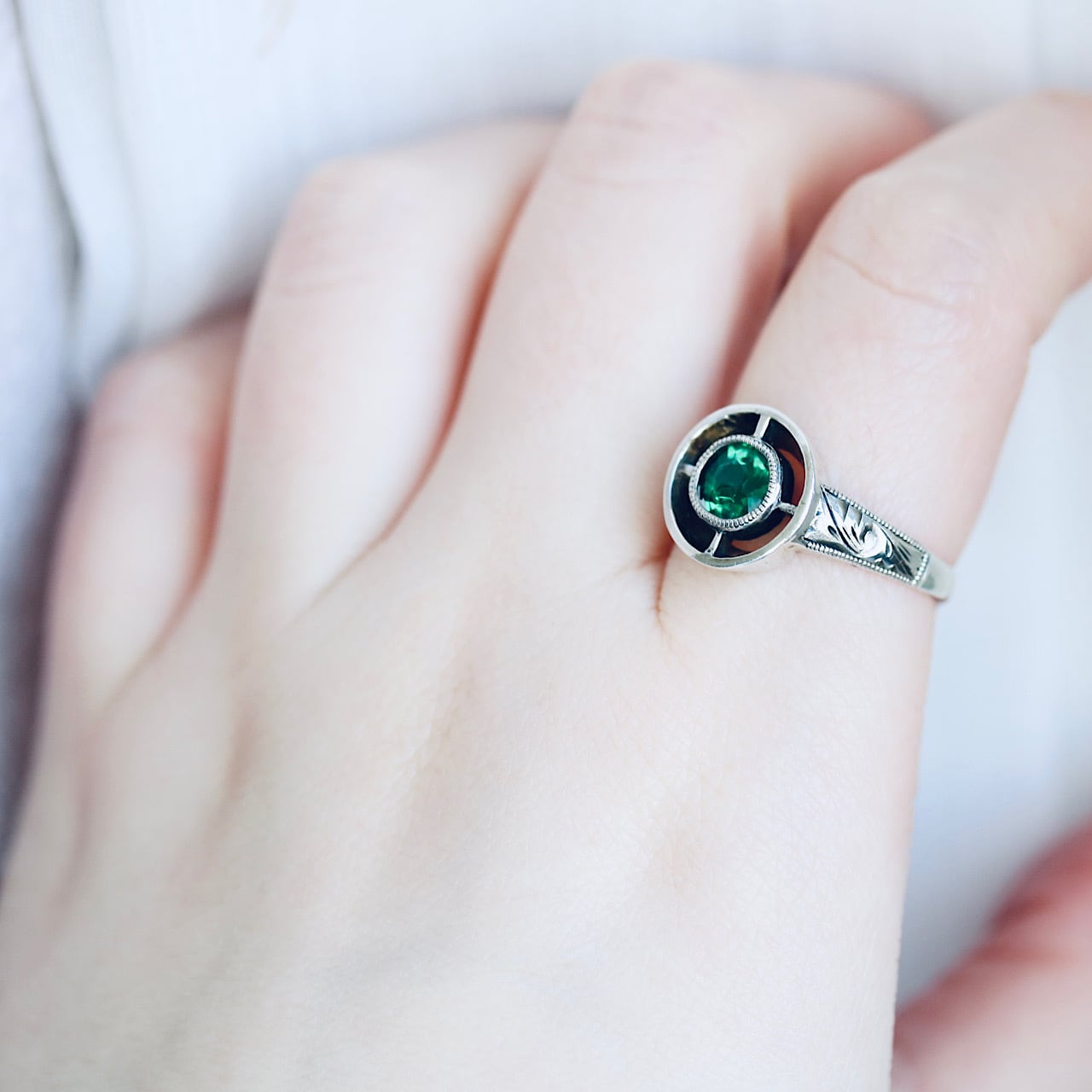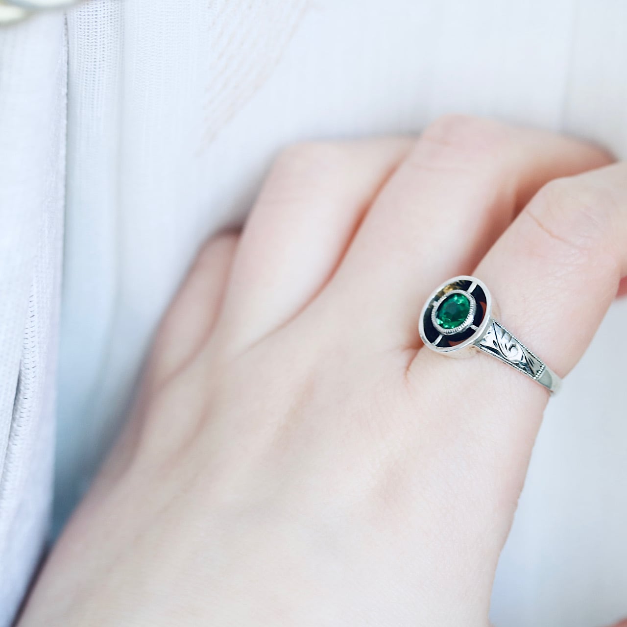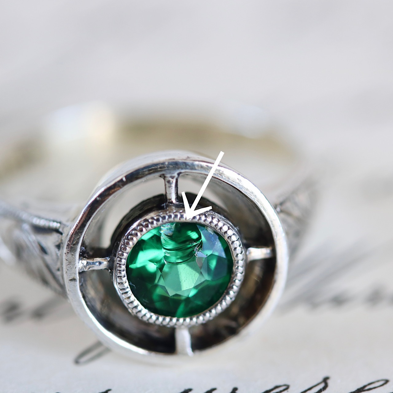 シルバーの地金にエメラルドカラーの色硝子が映える、どこかノスタルジックな佇まいのヴィンテージリング。