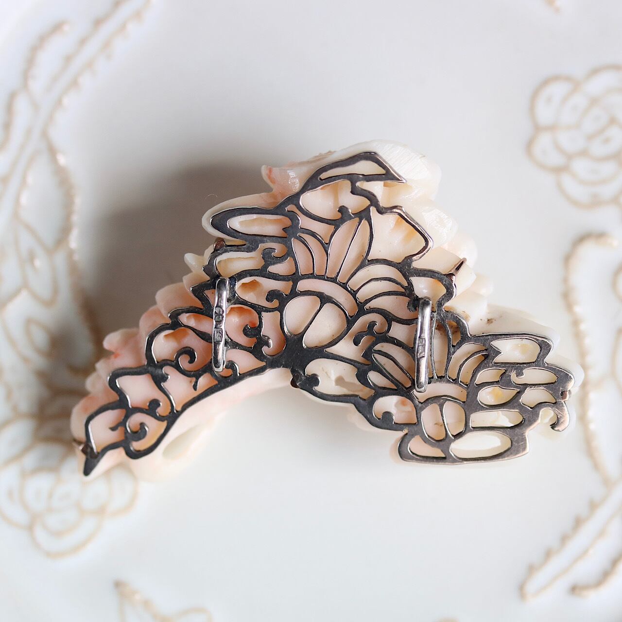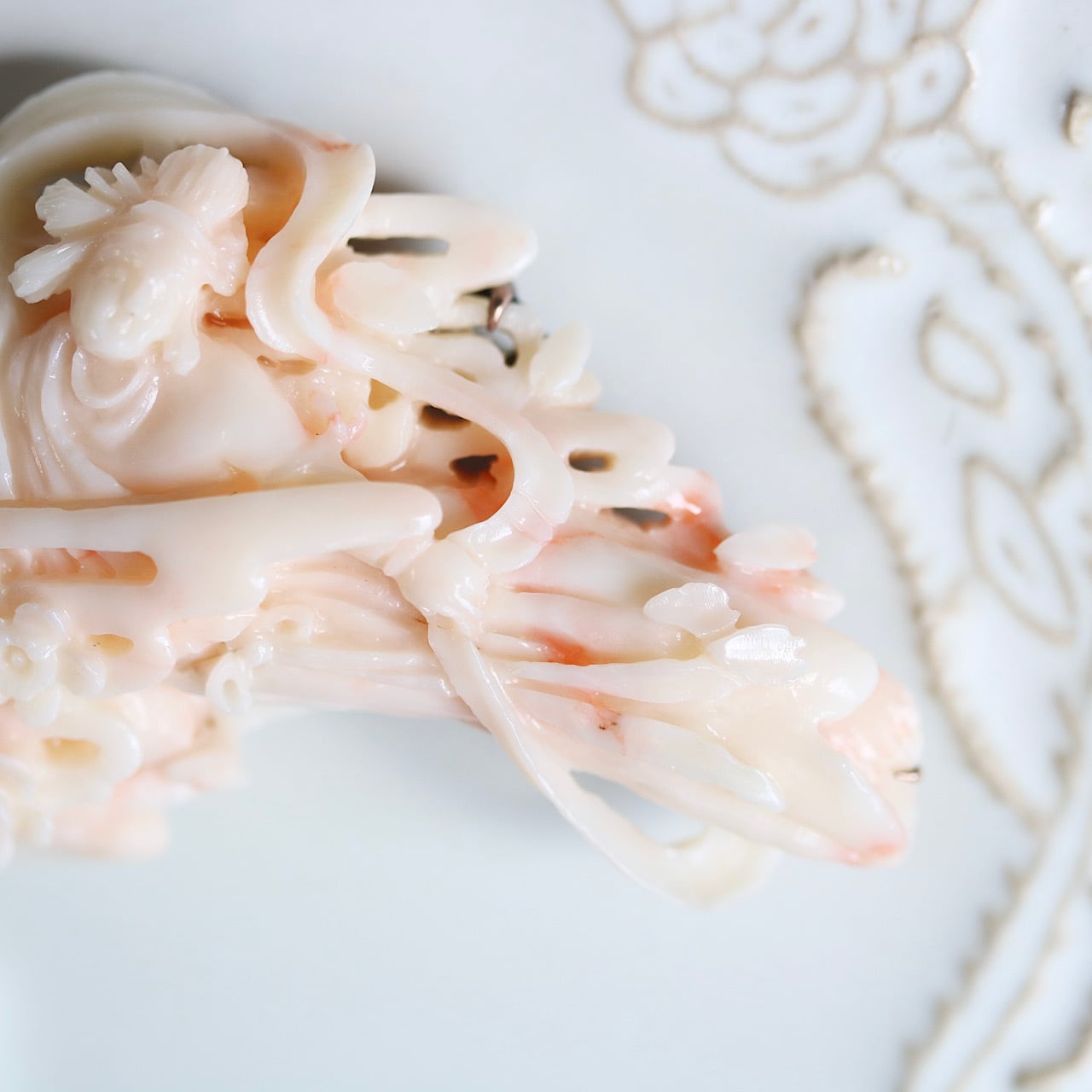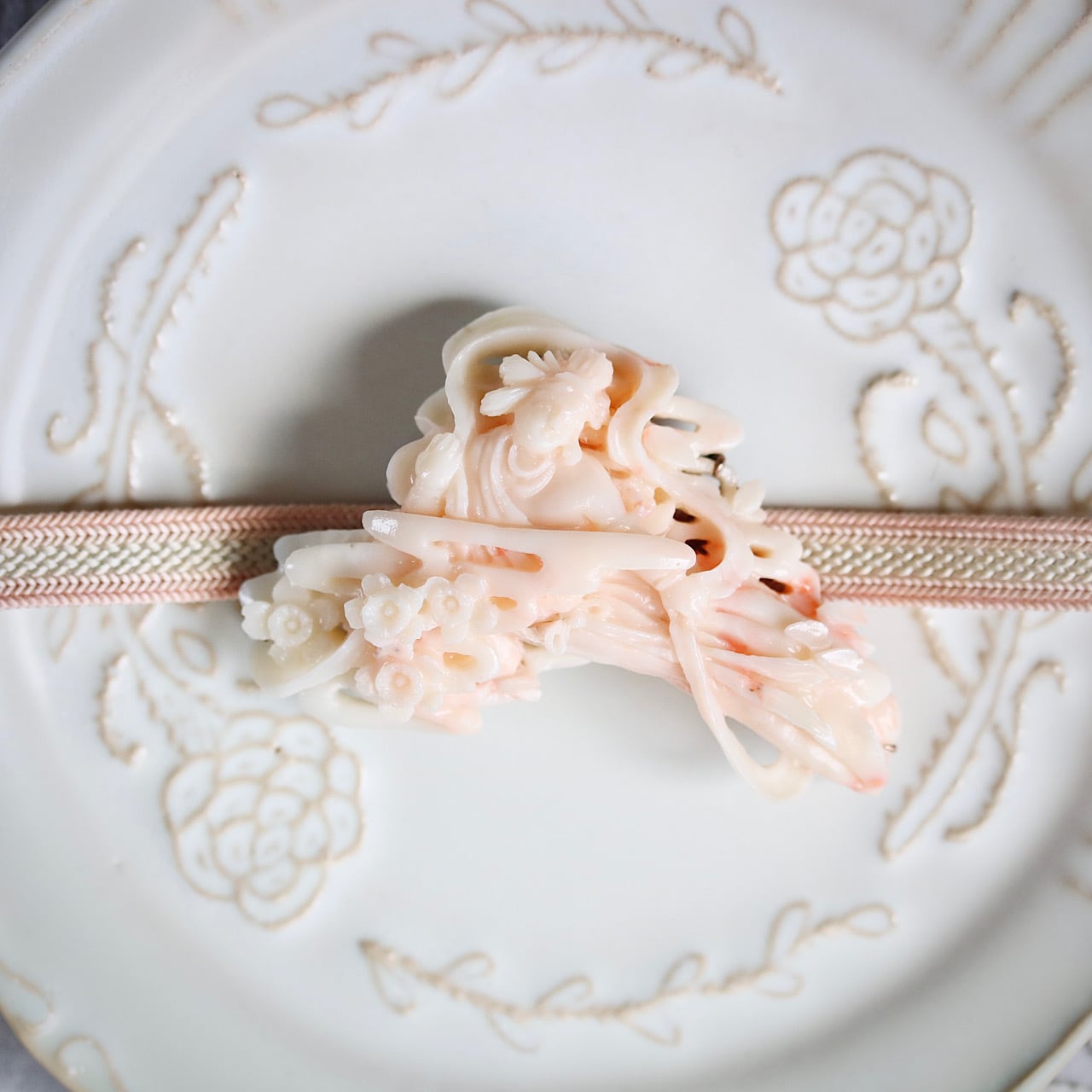 日本人の肌に馴染む柔らかな淡いピンク色の桃珊瑚に緻密な天女の彫刻が施された、美しいアンティークの帯留め。