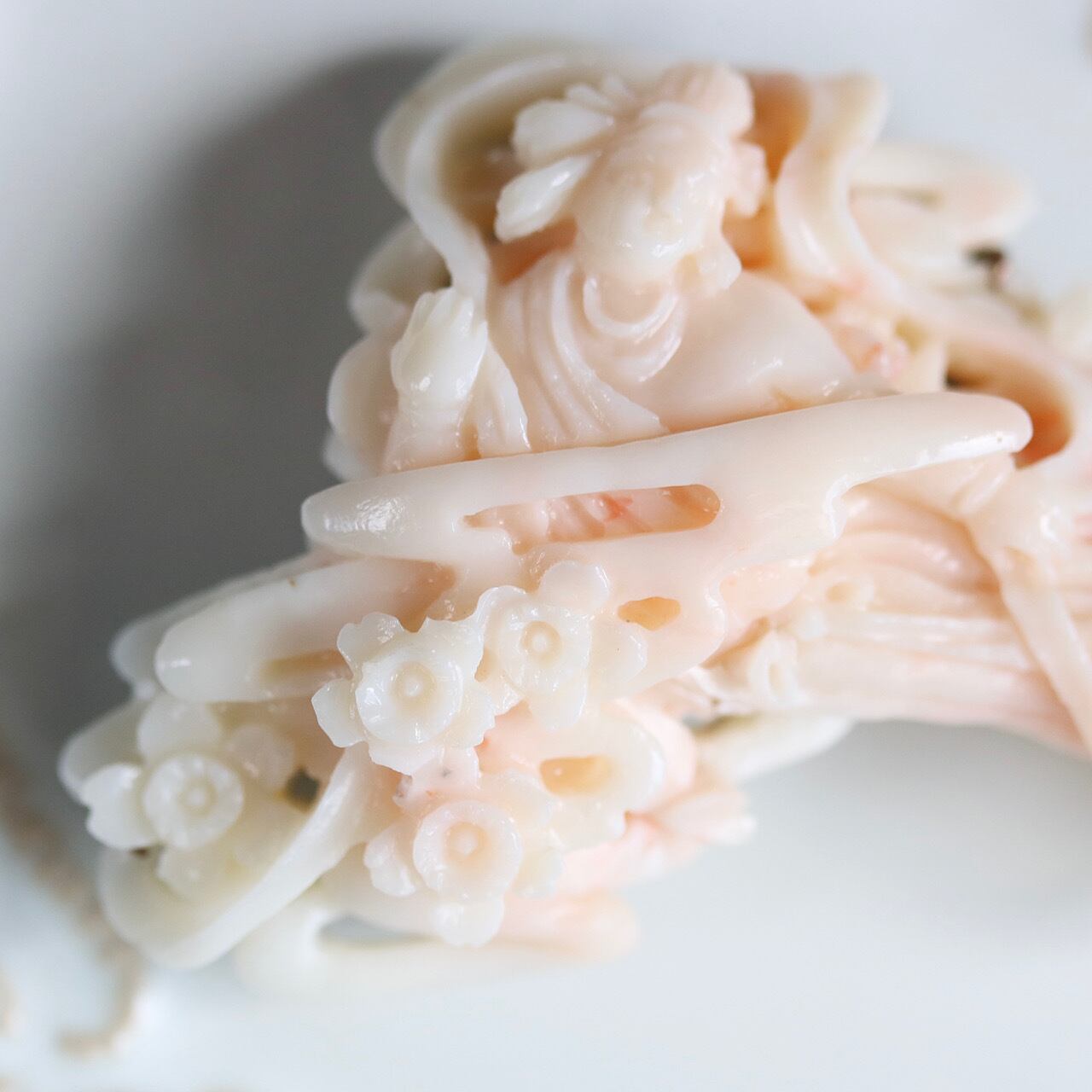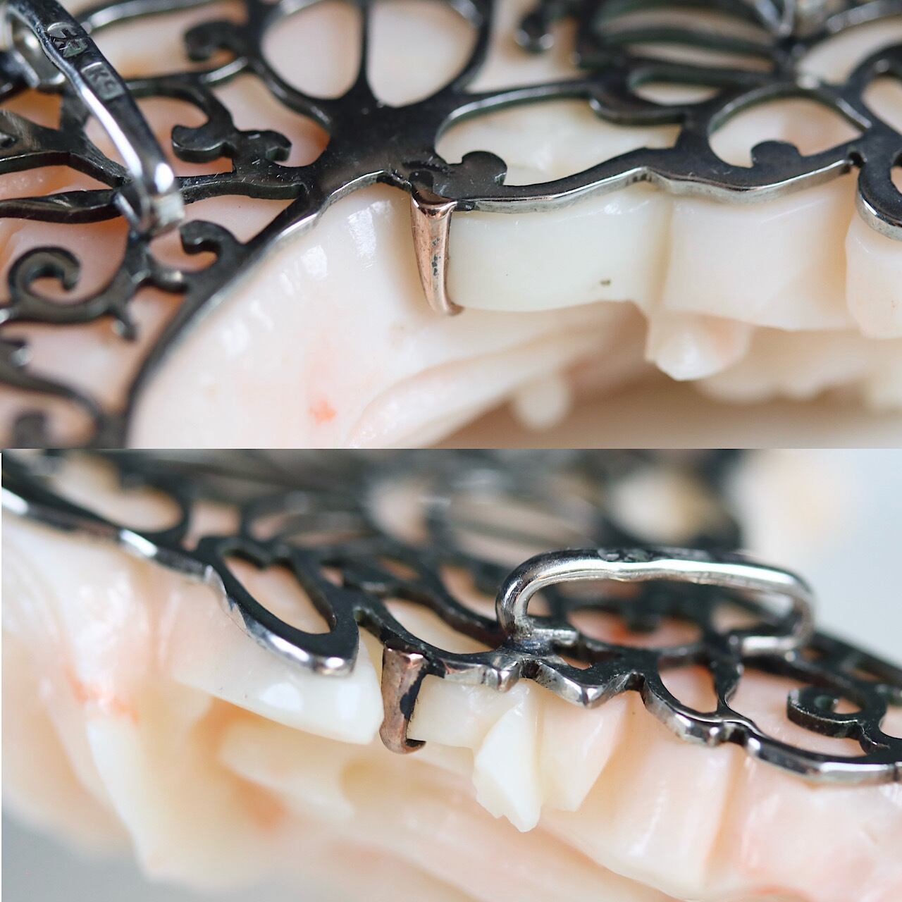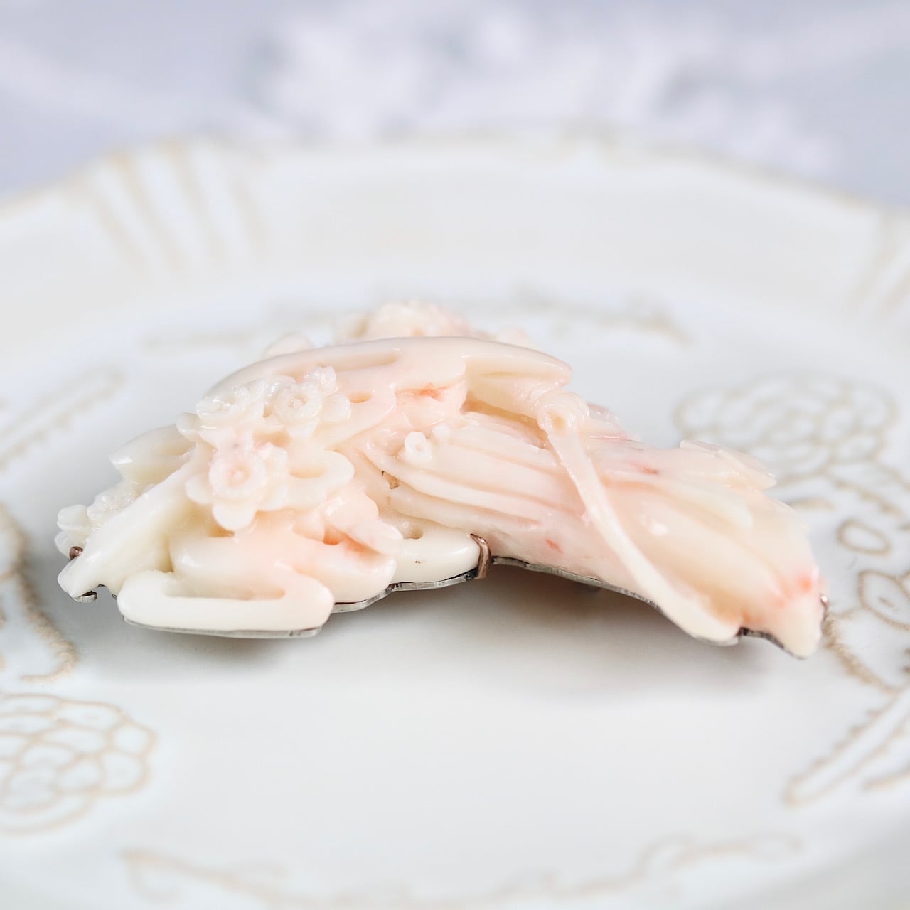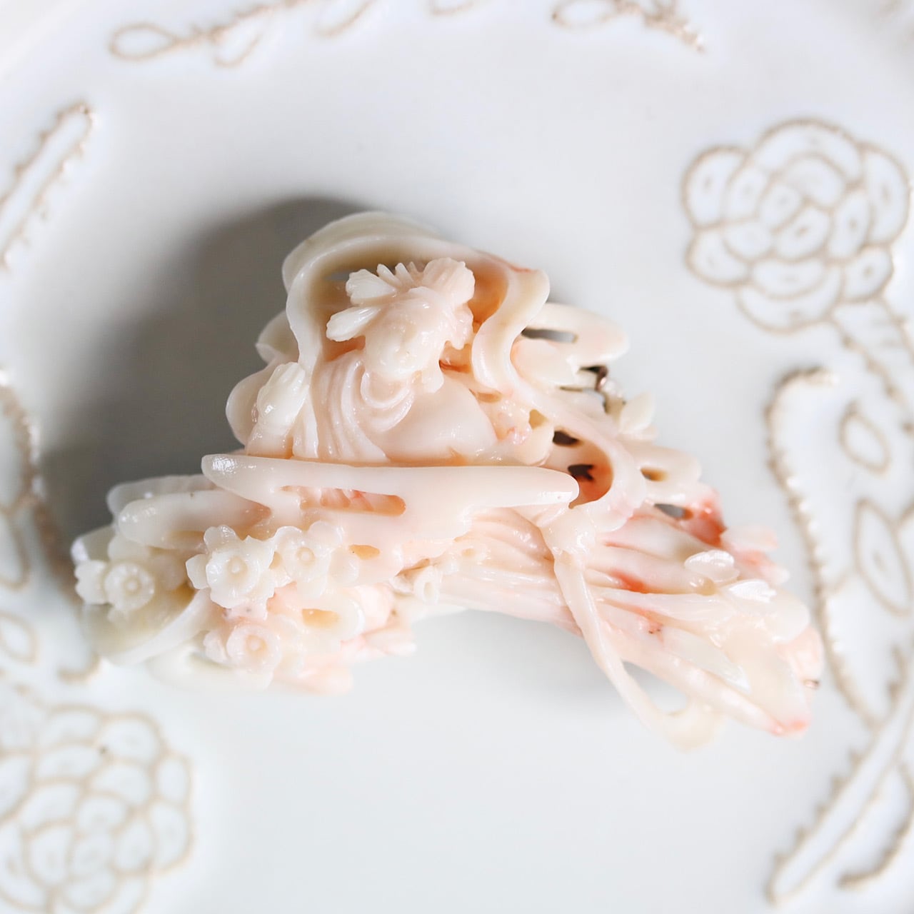 日本人の肌に馴染む柔らかな淡いピンク色の桃珊瑚に緻密な天女の彫刻が施された、美しいアンティークの帯留め。