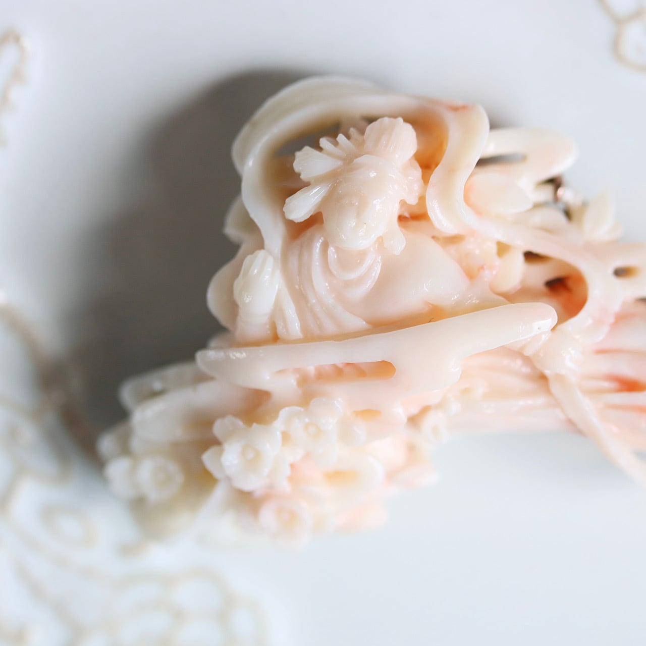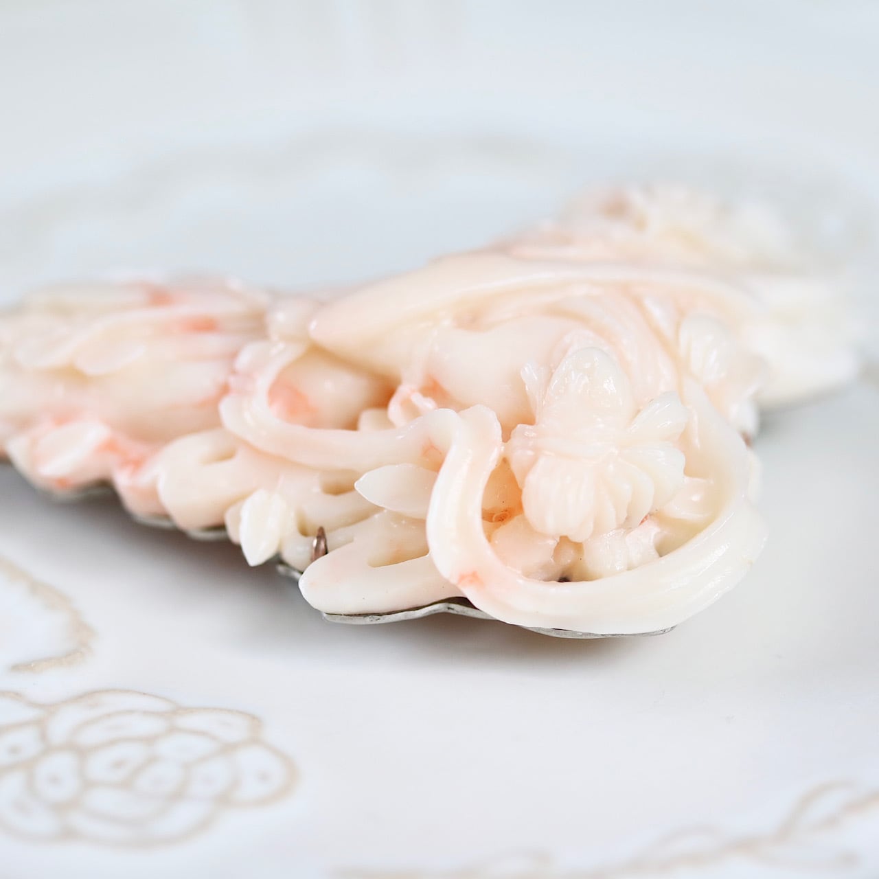 厚みのある珊瑚が使用され。立体感のある繊細な彫り込みが見事な造りです。