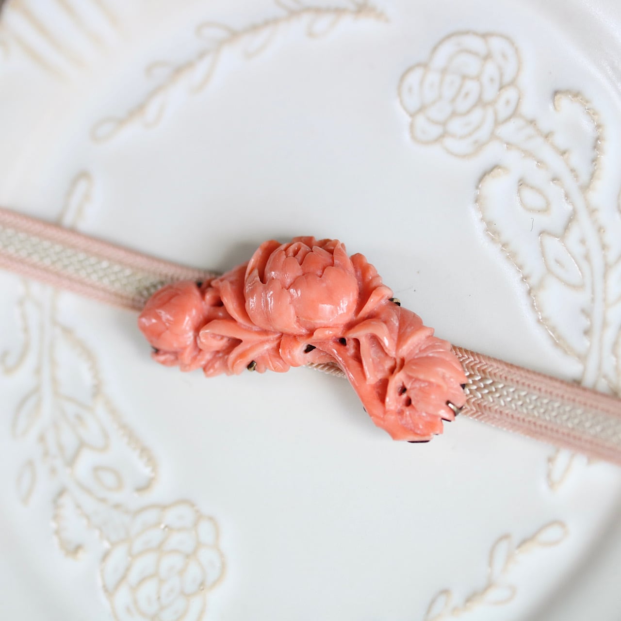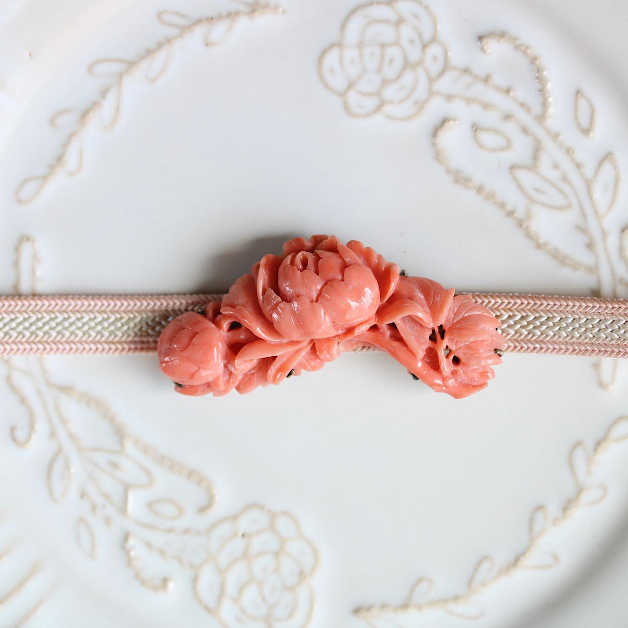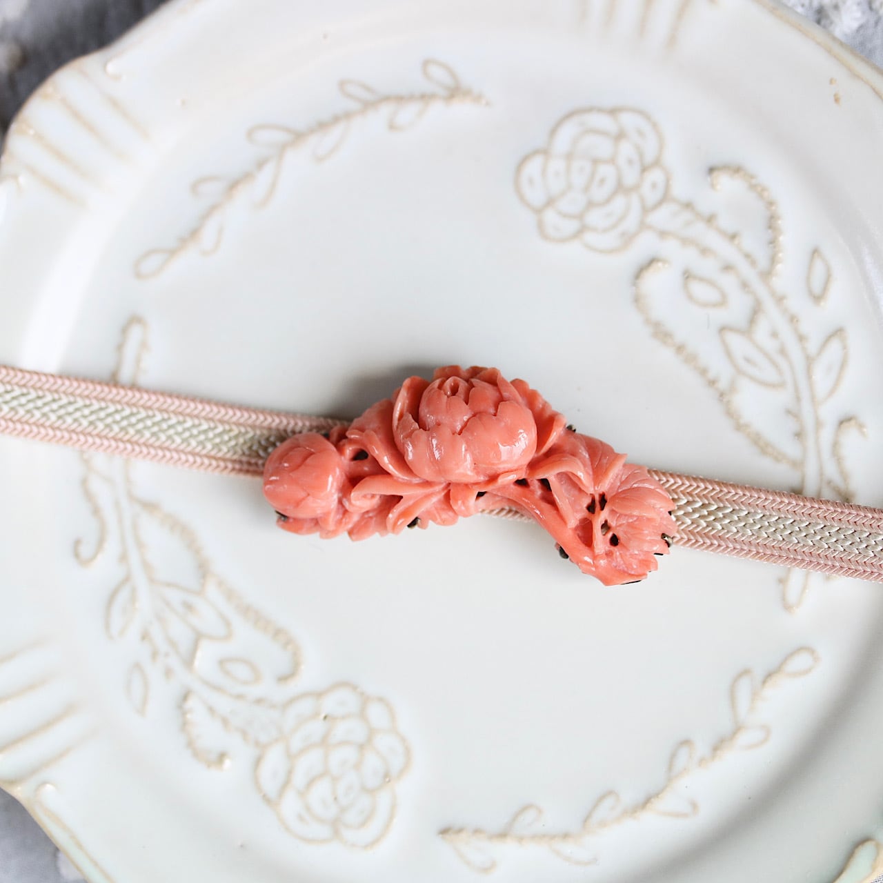 大輪の牡丹が彫り込まれた桃珊瑚のアンティーク帯留め。