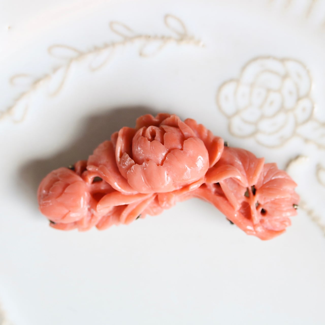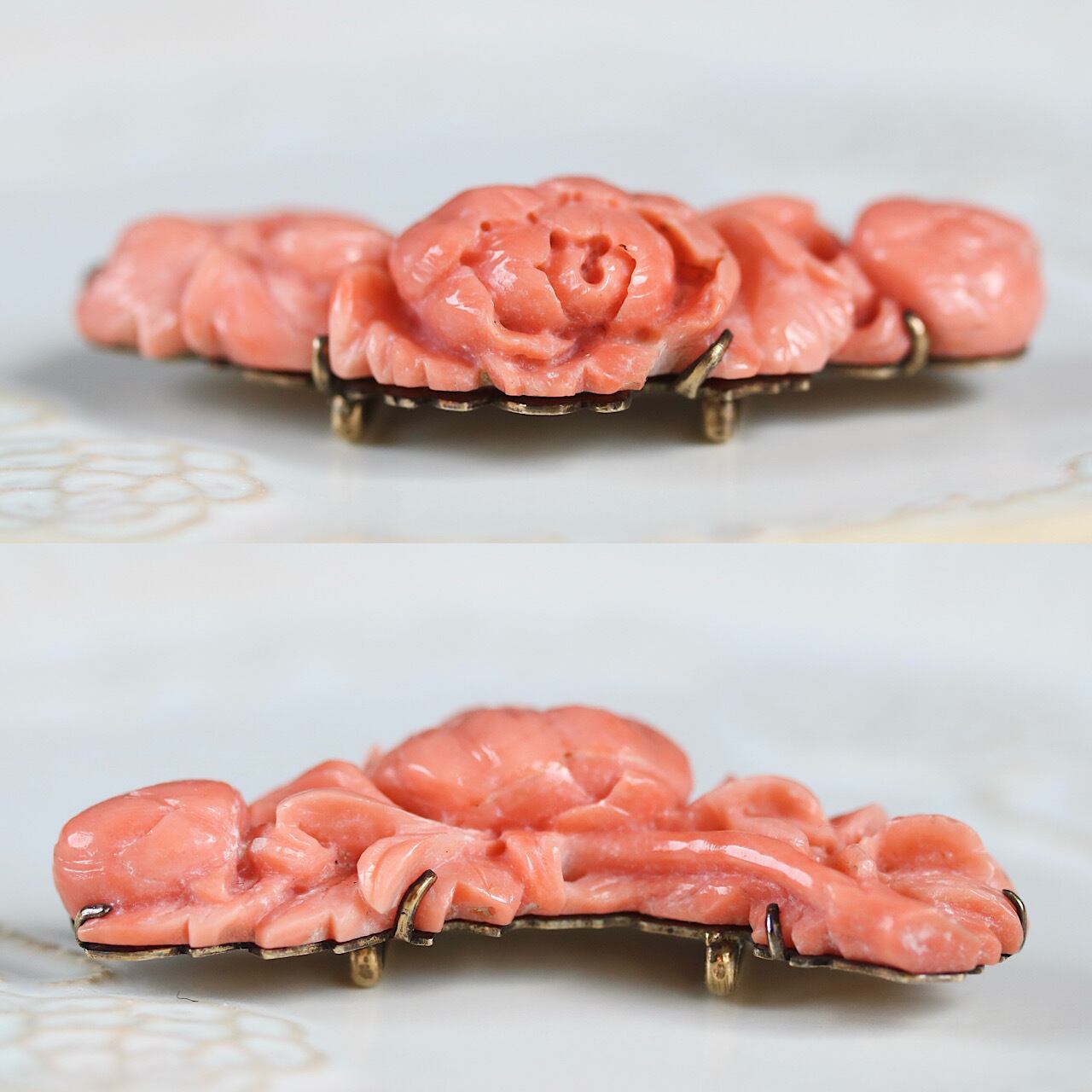 珊瑚は花びら一枚一枚非常に繊細に彫られており、小ぶりながらも立体感のある美しく見応えのある逸品です。