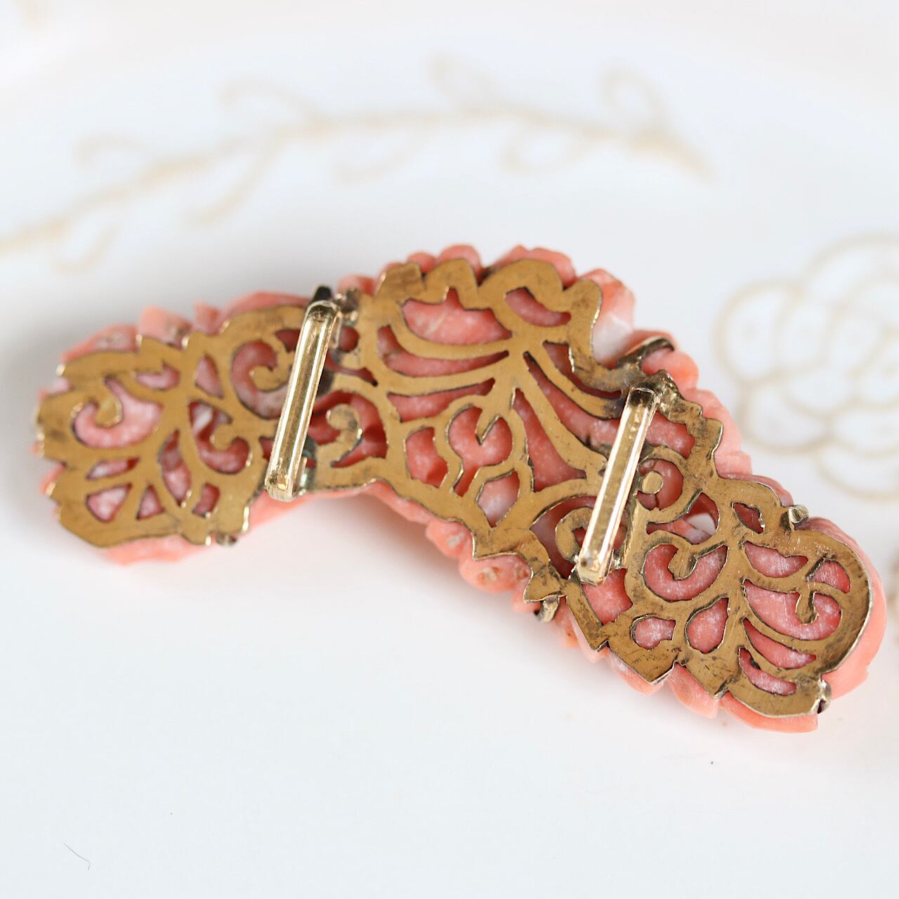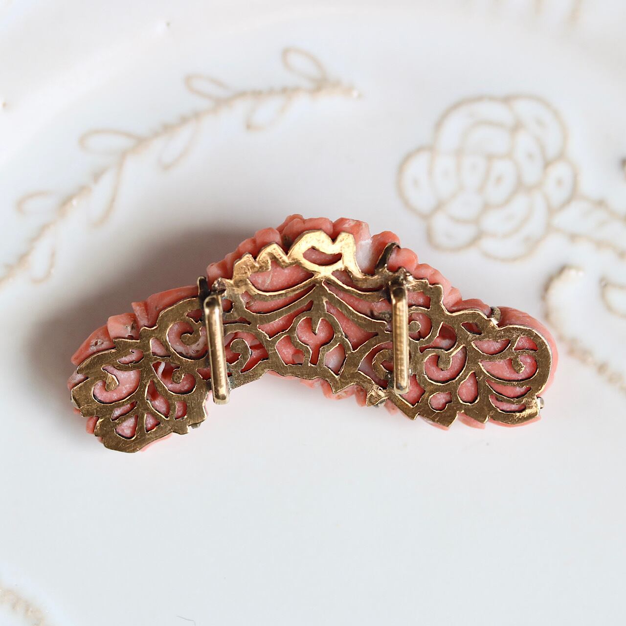 9金製 桃珊瑚 牡丹のアンティーク帯留め