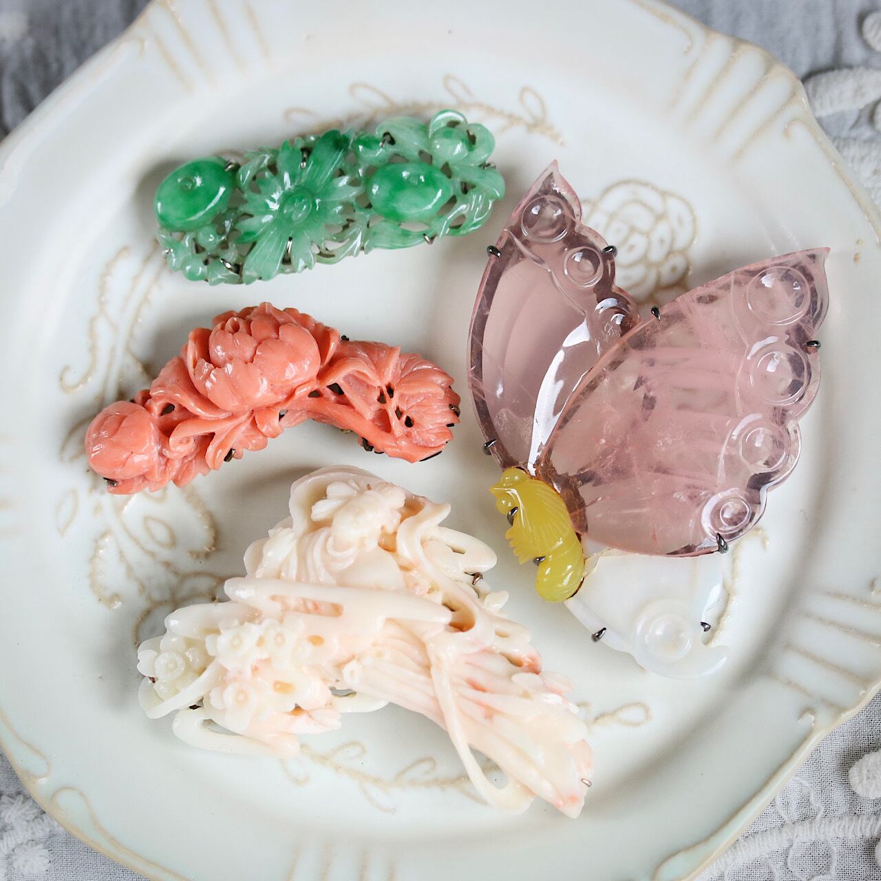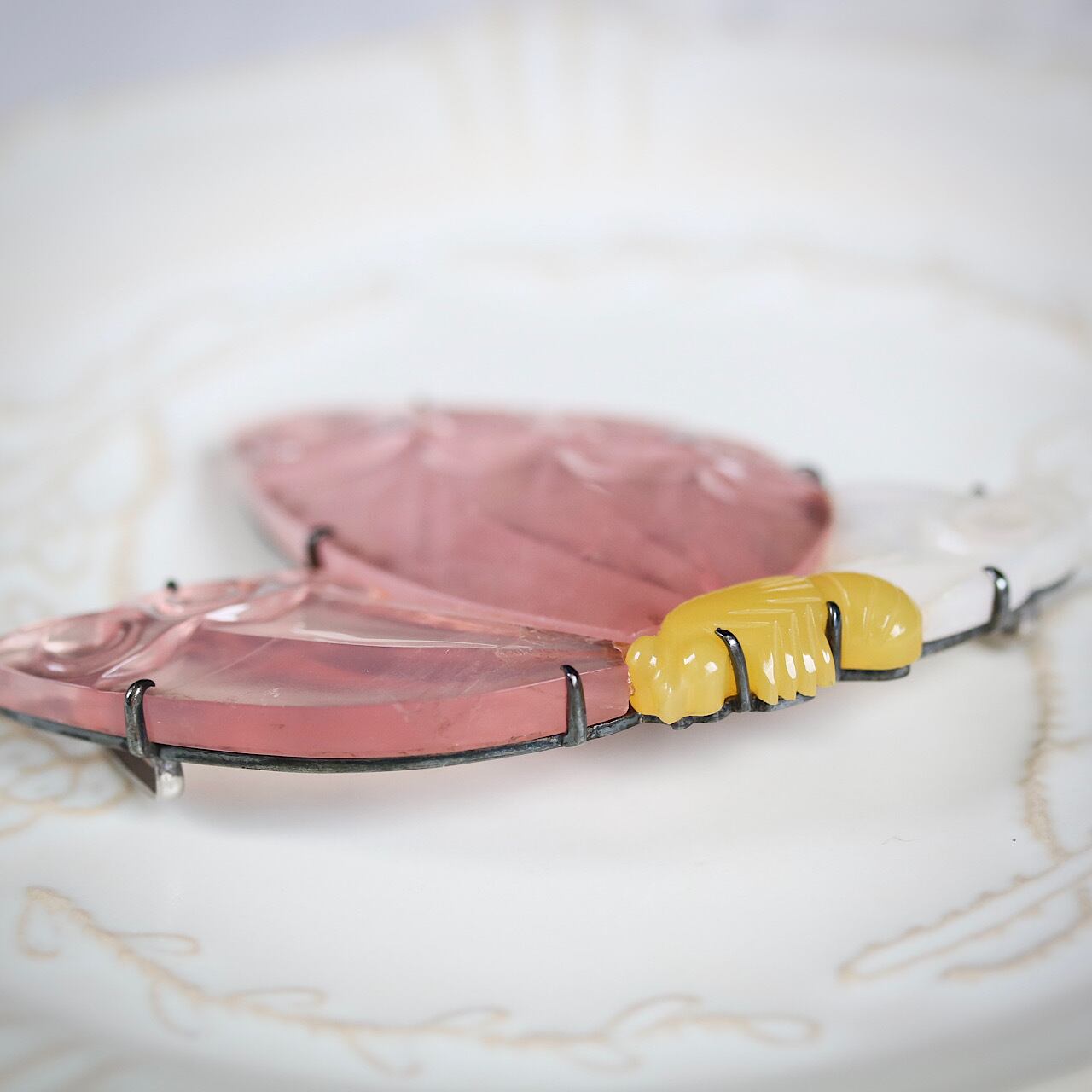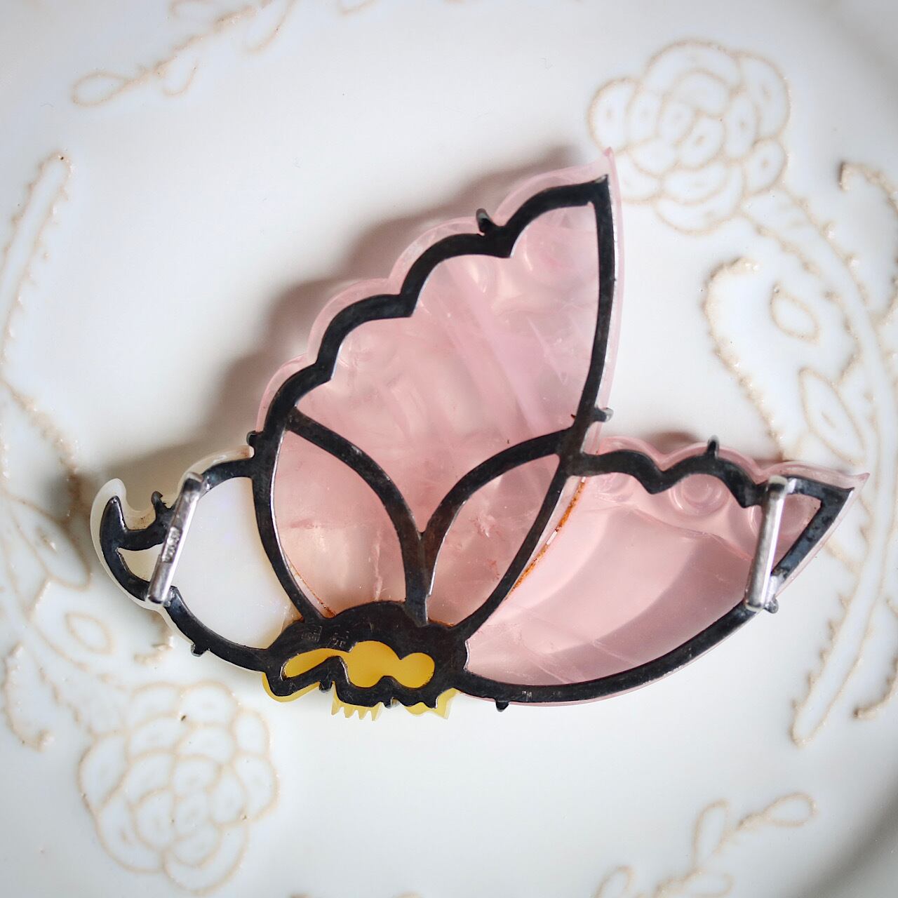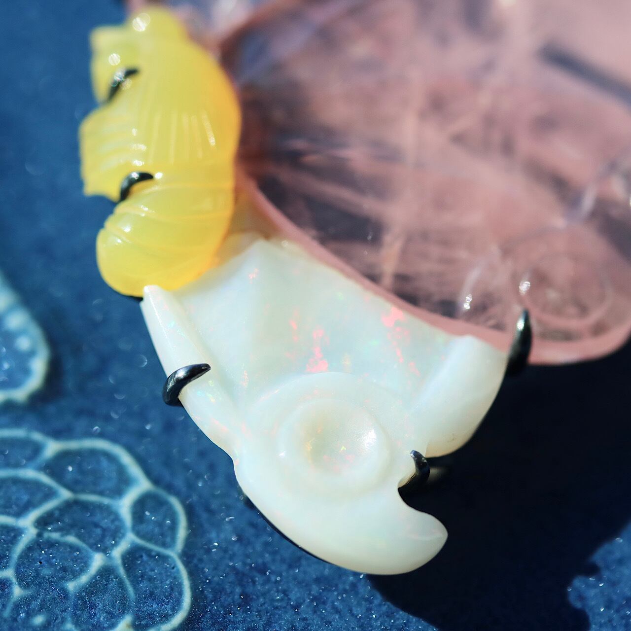 繊細な彫刻が施された天然ローズクォーツを主役に、天然オパールとカルセドニーを贅沢にあしらった、アンティークの蝶の帯留め。
