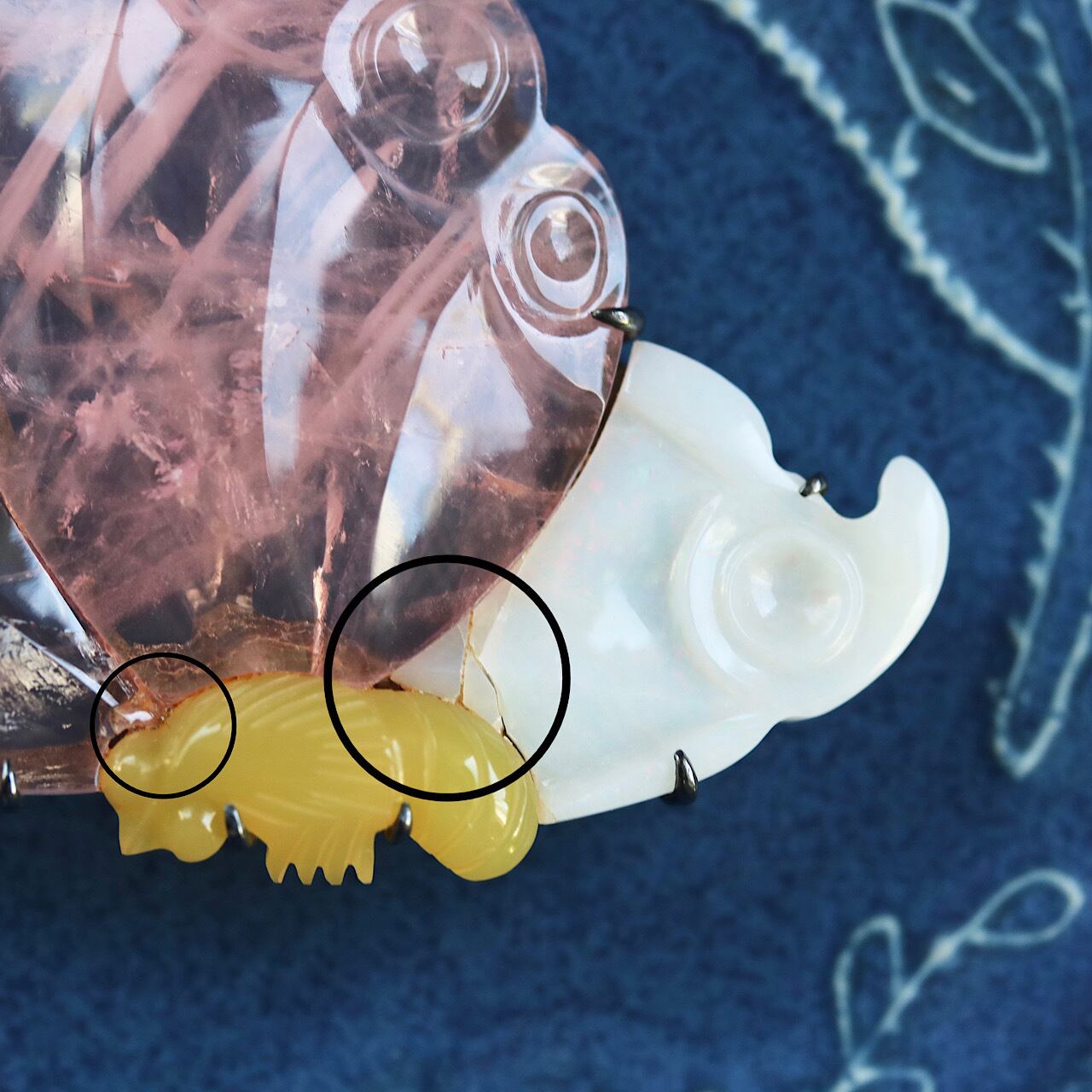 胴体にはイエローカラーのカルセドニー、そして一部に遊色を秘めたホワイトオパールを配した、当時の職人のこだわりが詰まった多色使いの逸品です。