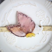 淡く透き通る桜色のローズクォーツの羽は、光を透かすたびに優美な表情を見せます。