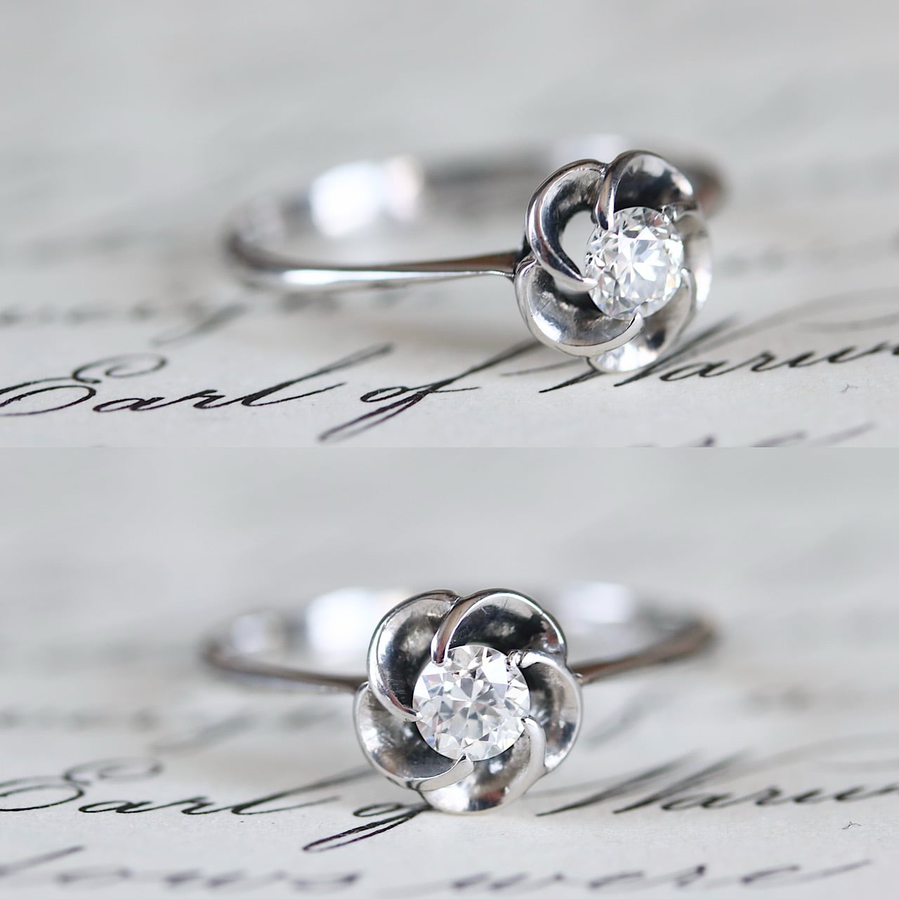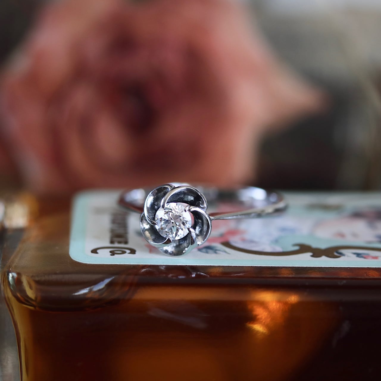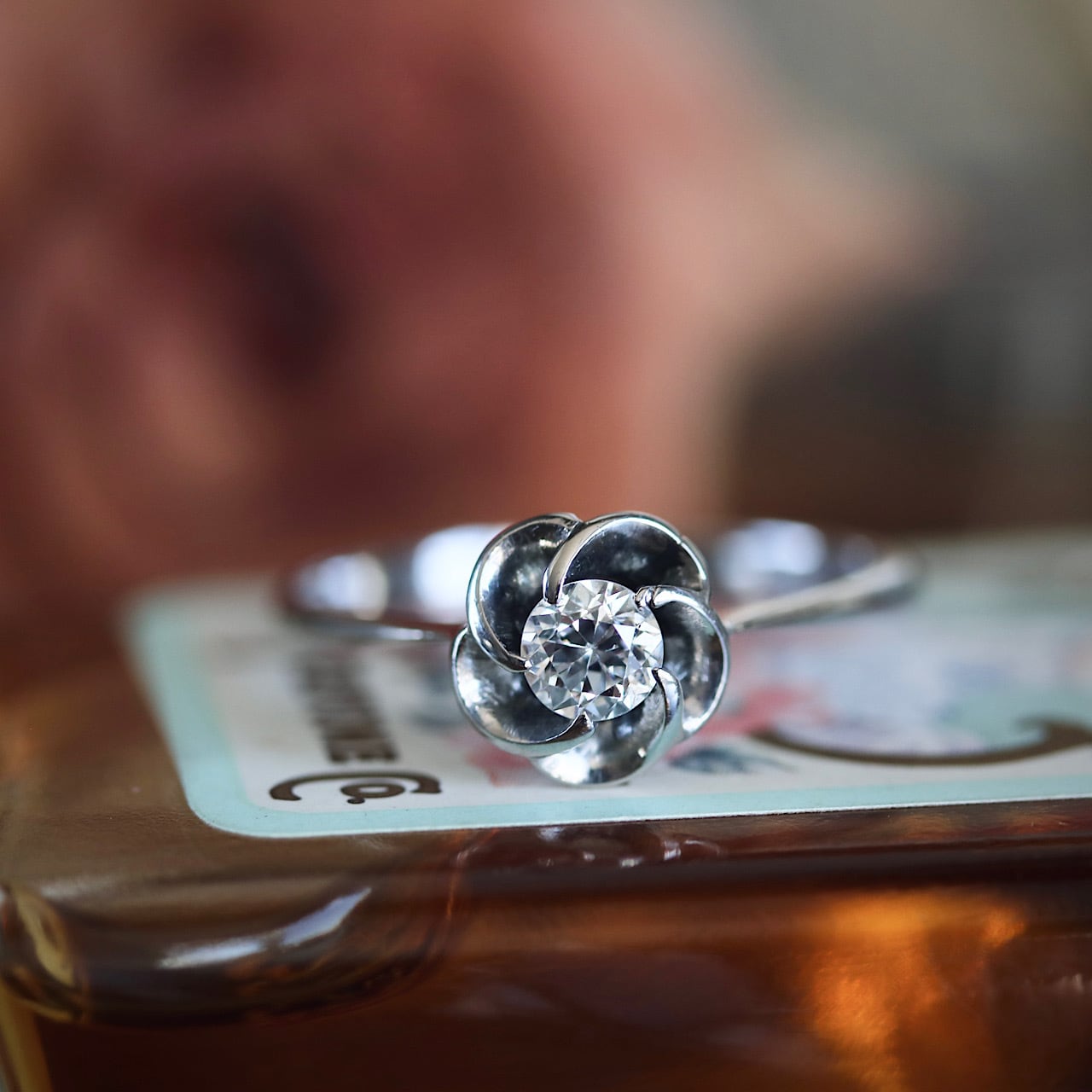 梅の花が優雅で日本らしい意匠の一粒ダイヤモンドのヴィンテージリング。