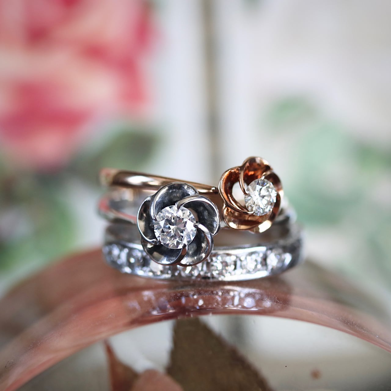 花弁の中央に配されたダイヤモンドは一層輝きを増し、手元を品良く彩ります。