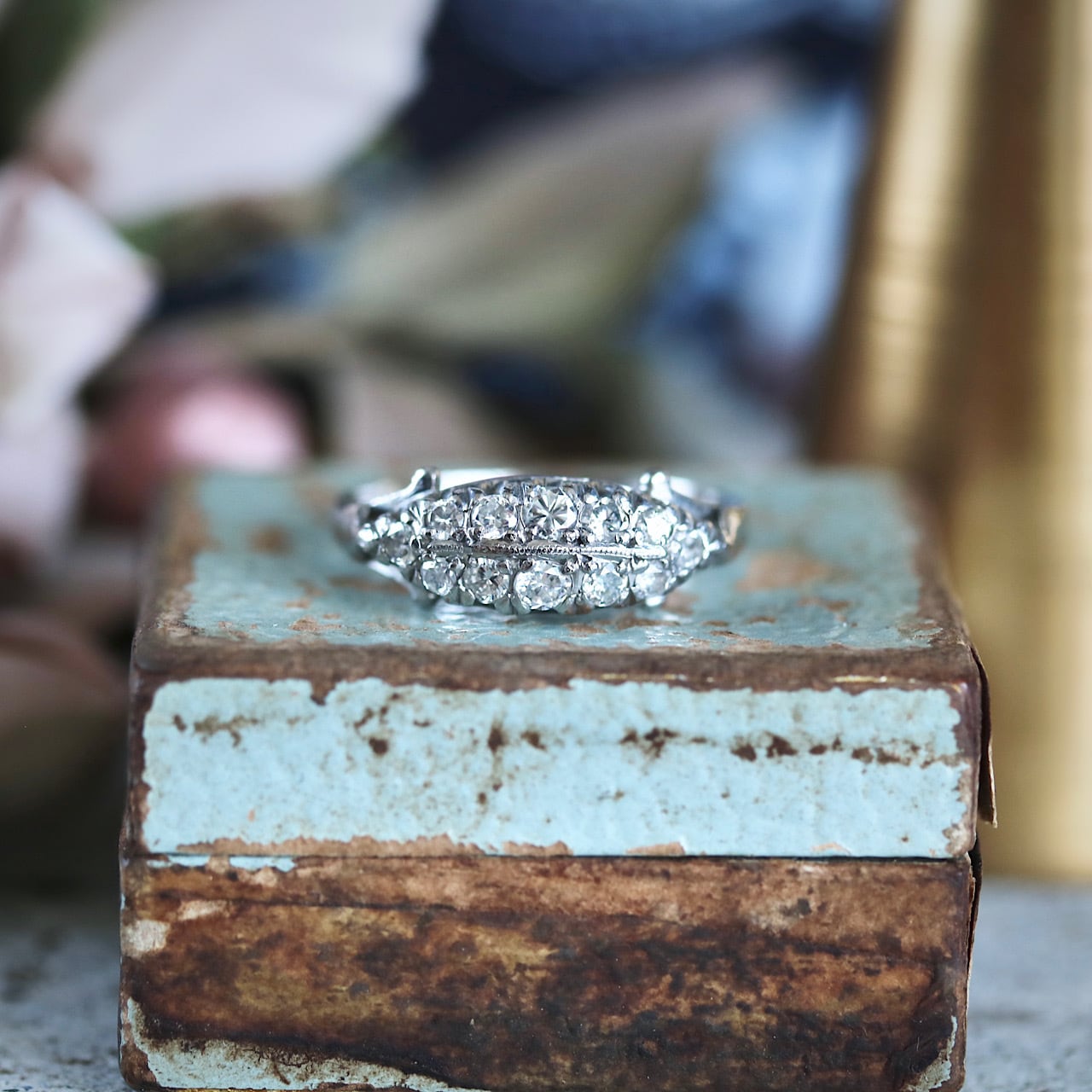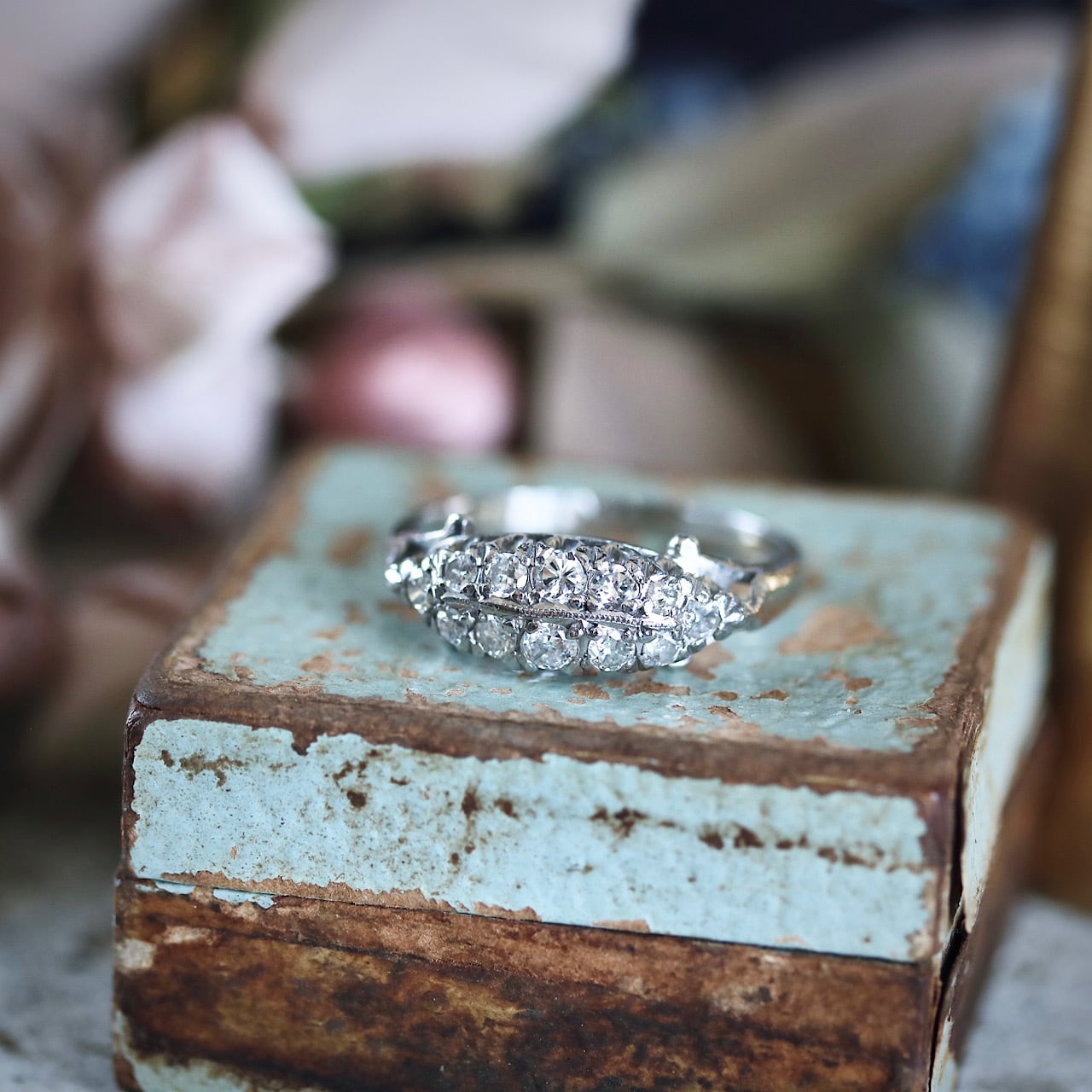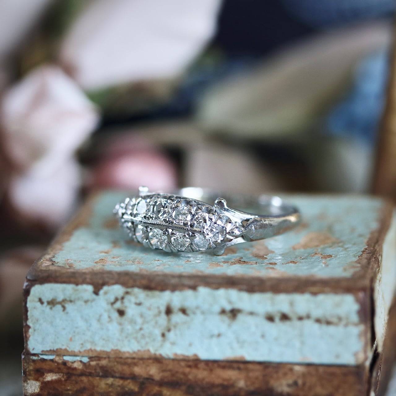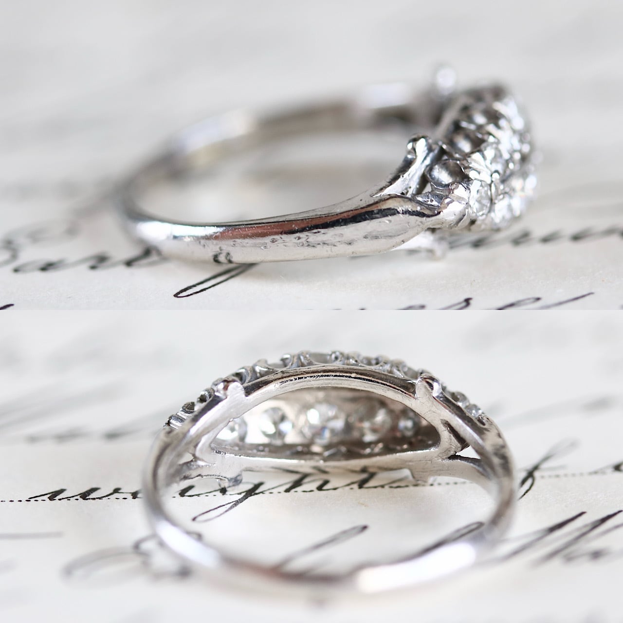 P.m プラチナ製 ダイヤモンド ボートシェイプ パヴェ ヴィンテージリング