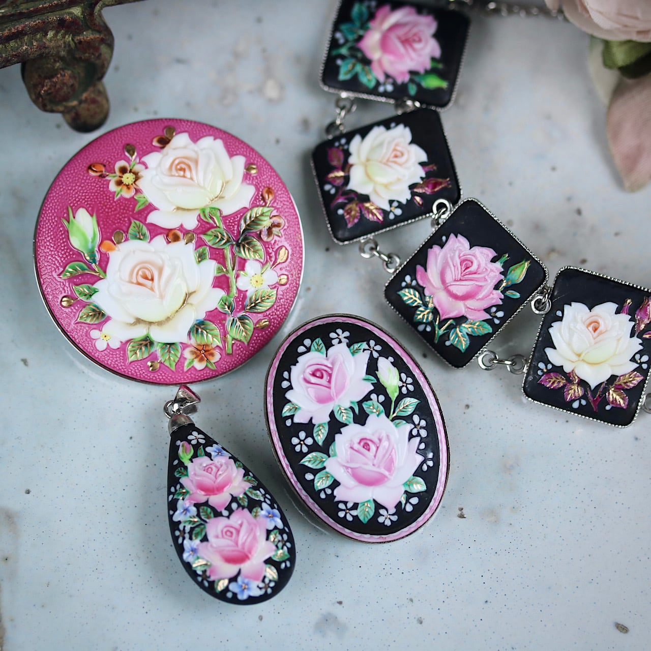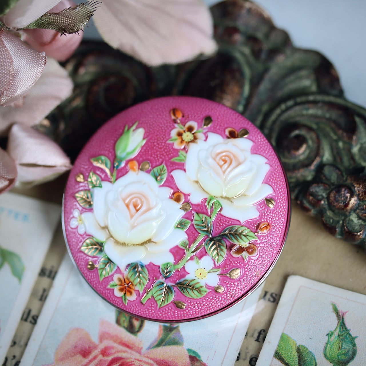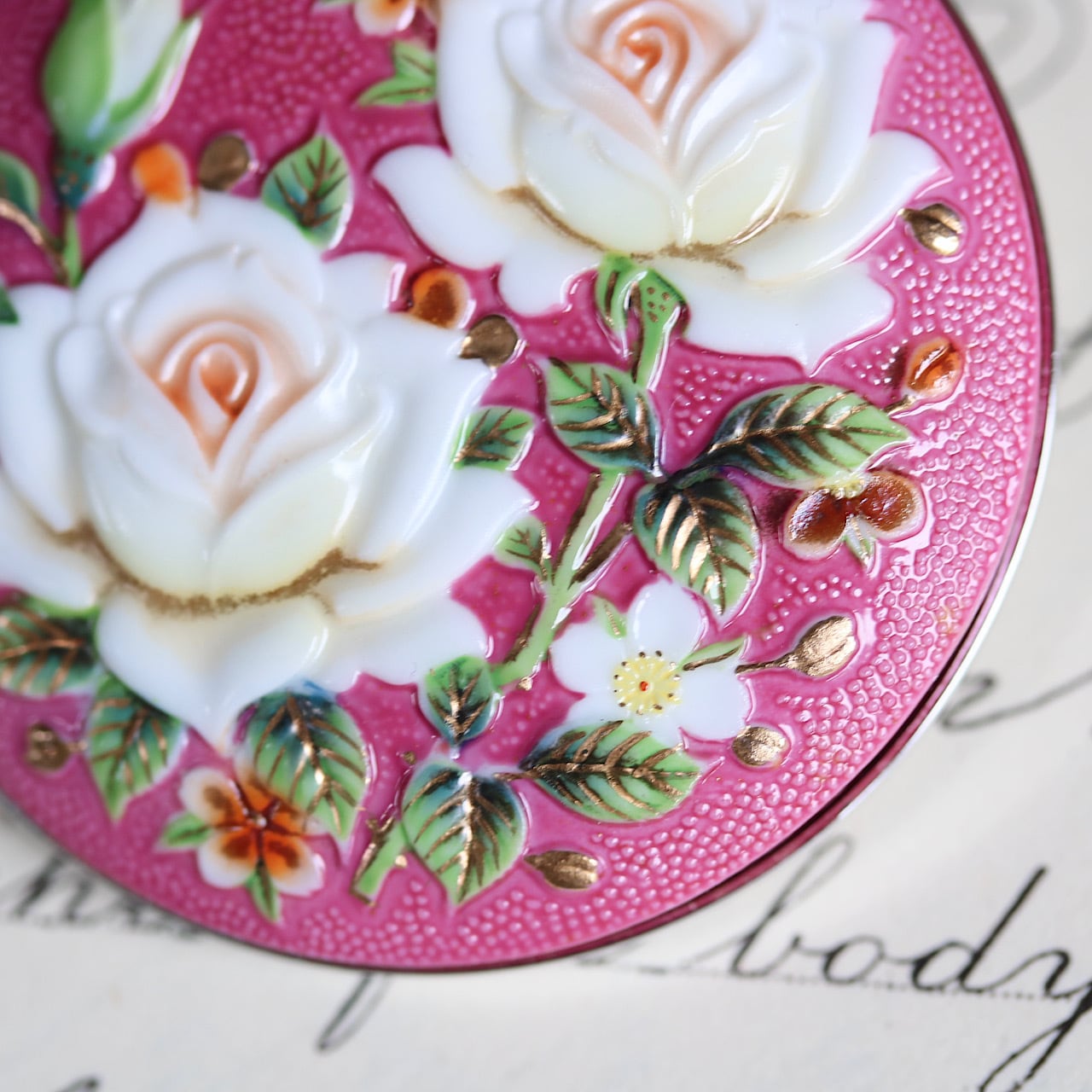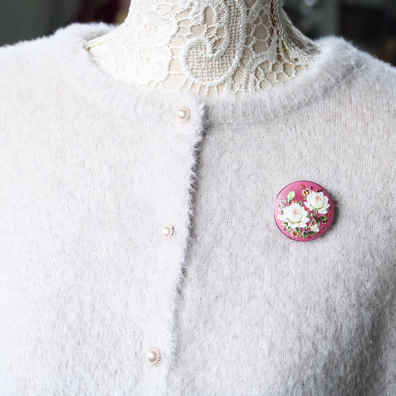 春らしい鮮やかなピンク色の背景に上品な白薔薇が描かれたロマンティックなブローチ。
