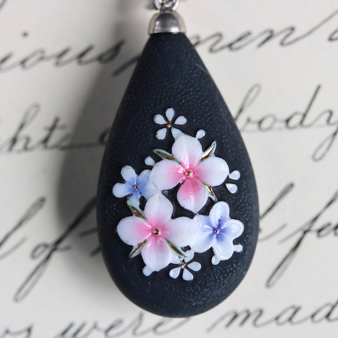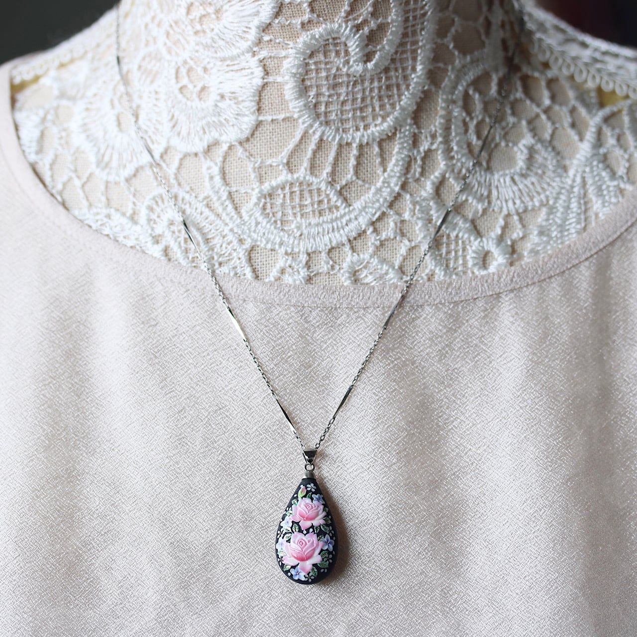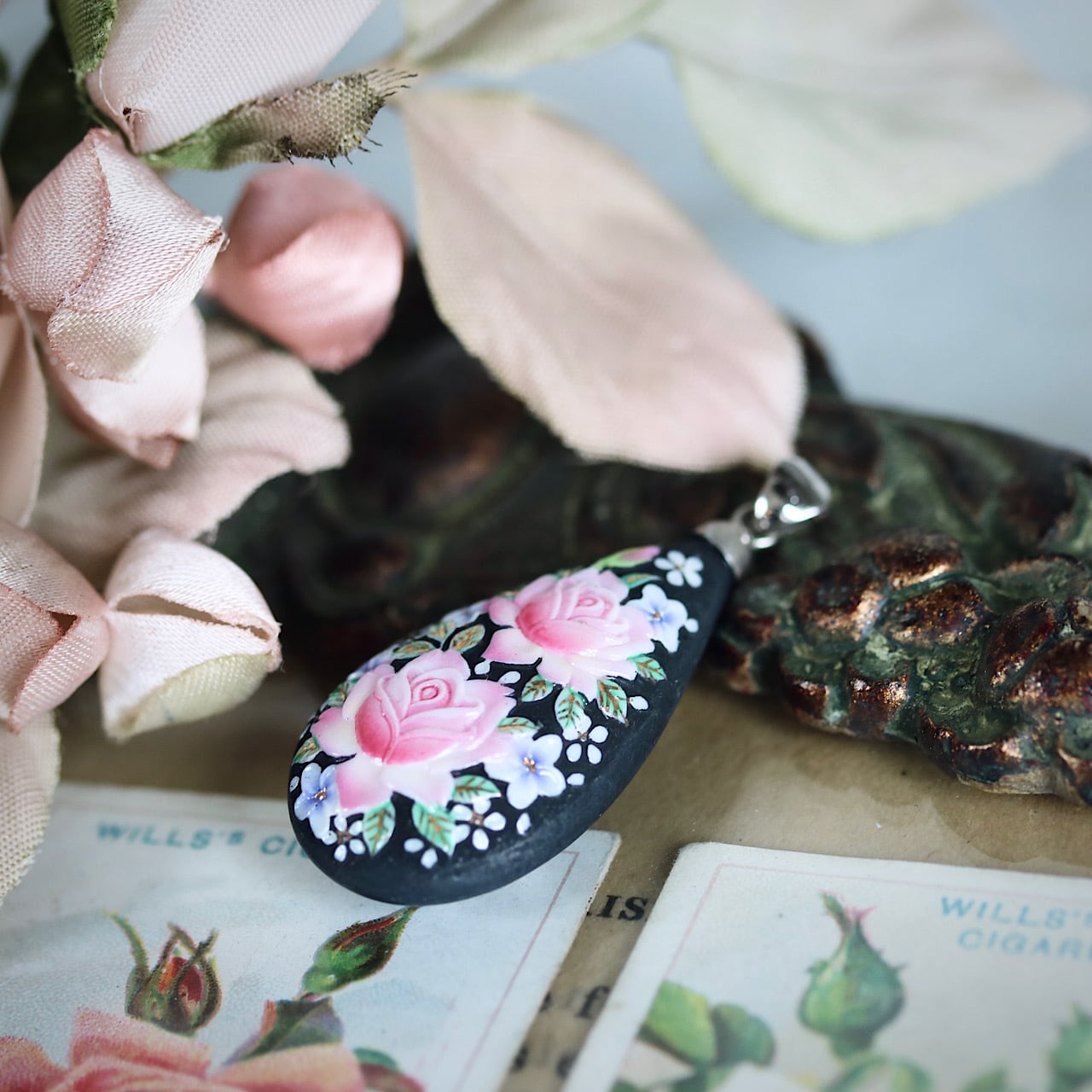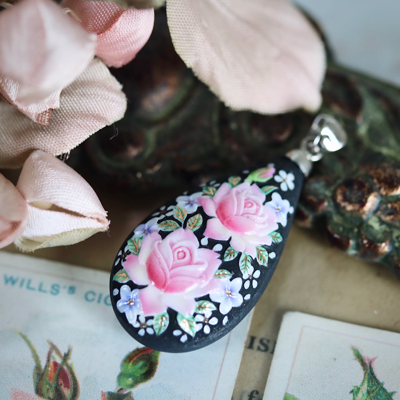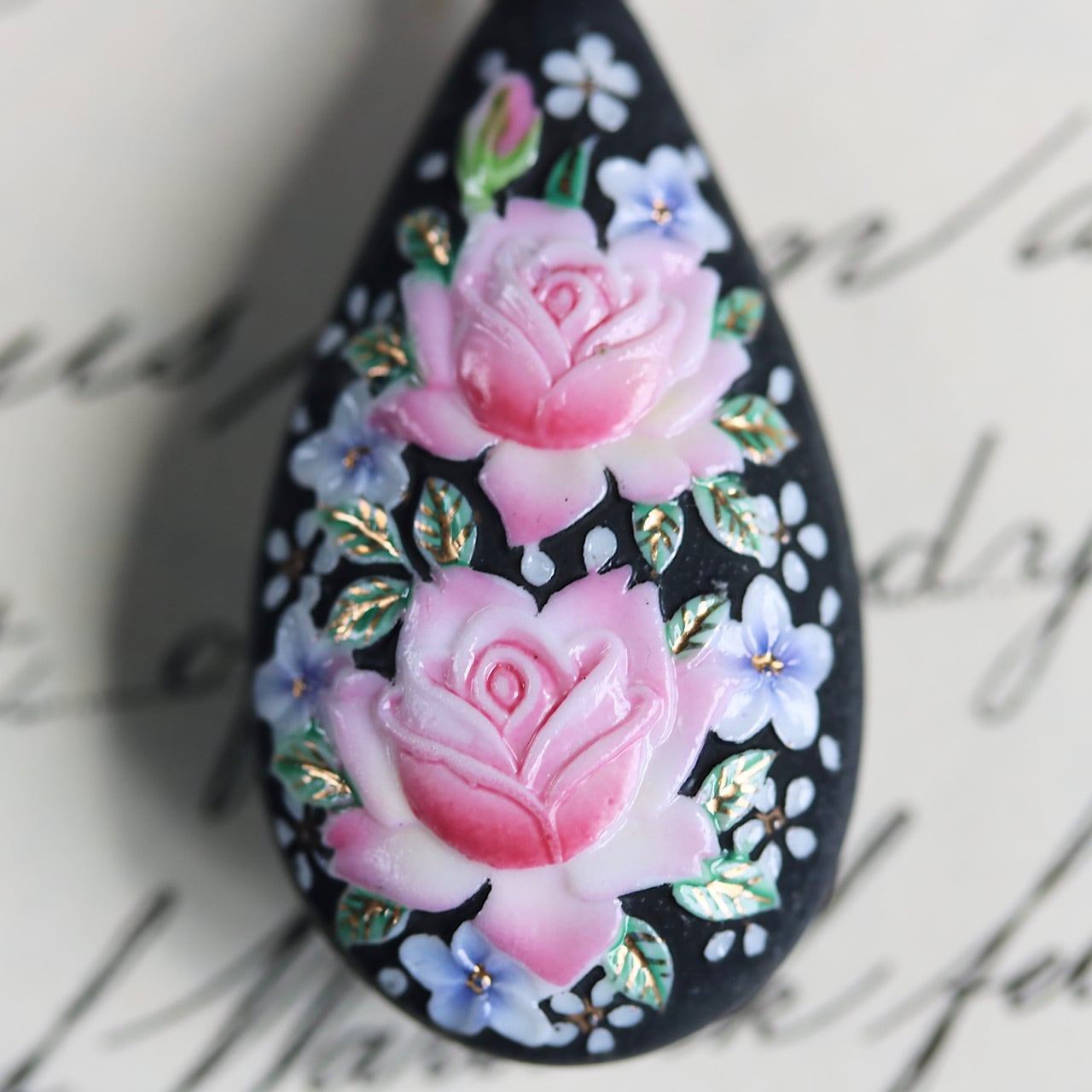 トシカネジュエリー(俊兼) ピンク薔薇モチーフのドロップ型ヴィンテージペンダントトップ。