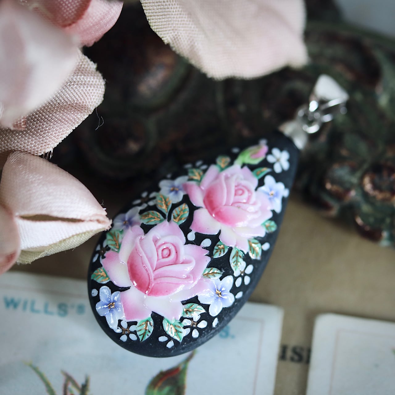 淡いピンク色のグラデーションの薔薇がロマンティックで、アンティークのような気品を纏った美しいペンダントトップです。